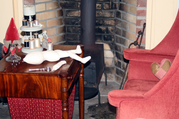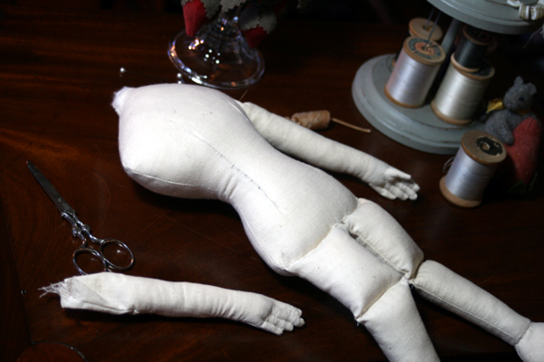 I spent the day making samples for my Izannah class instruction book. It was wonderful to have an “all Izannah” day. In the morning I rummaged through my attic to find cotton and wool stuffing. I could tell it was going to be a stellar day when I managed to burrow through my stash of antique fabrics and lay my hands on all three of the fabrics I needed to find in the very first box! Then I sat down at one of my favorite sewing machines, my mid-1940’s Singer Featherweight and sewed body parts together for several hours. I would have liked to use my Great-Grandmother Lovelady’s Singer treadle machine, but my sewing room was too icy cold and the treadle isn’t anyone’s idea of portable. 🙂