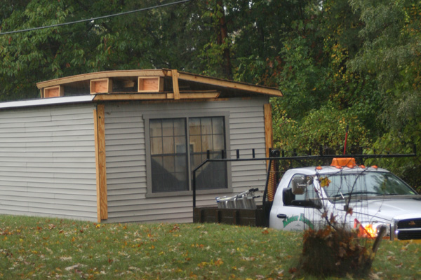 We were told to expect the building to arrive between 7 – 8 a.m. The cat did his part, by waking us up at 6:20. We didn’t exactly leap out of bed, but we were up and moving before 7:00. As it turned out, the trucks didn’t show up until almost 9:00, which gave us plenty of time to mop up the flood waters in the house!!!