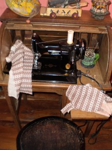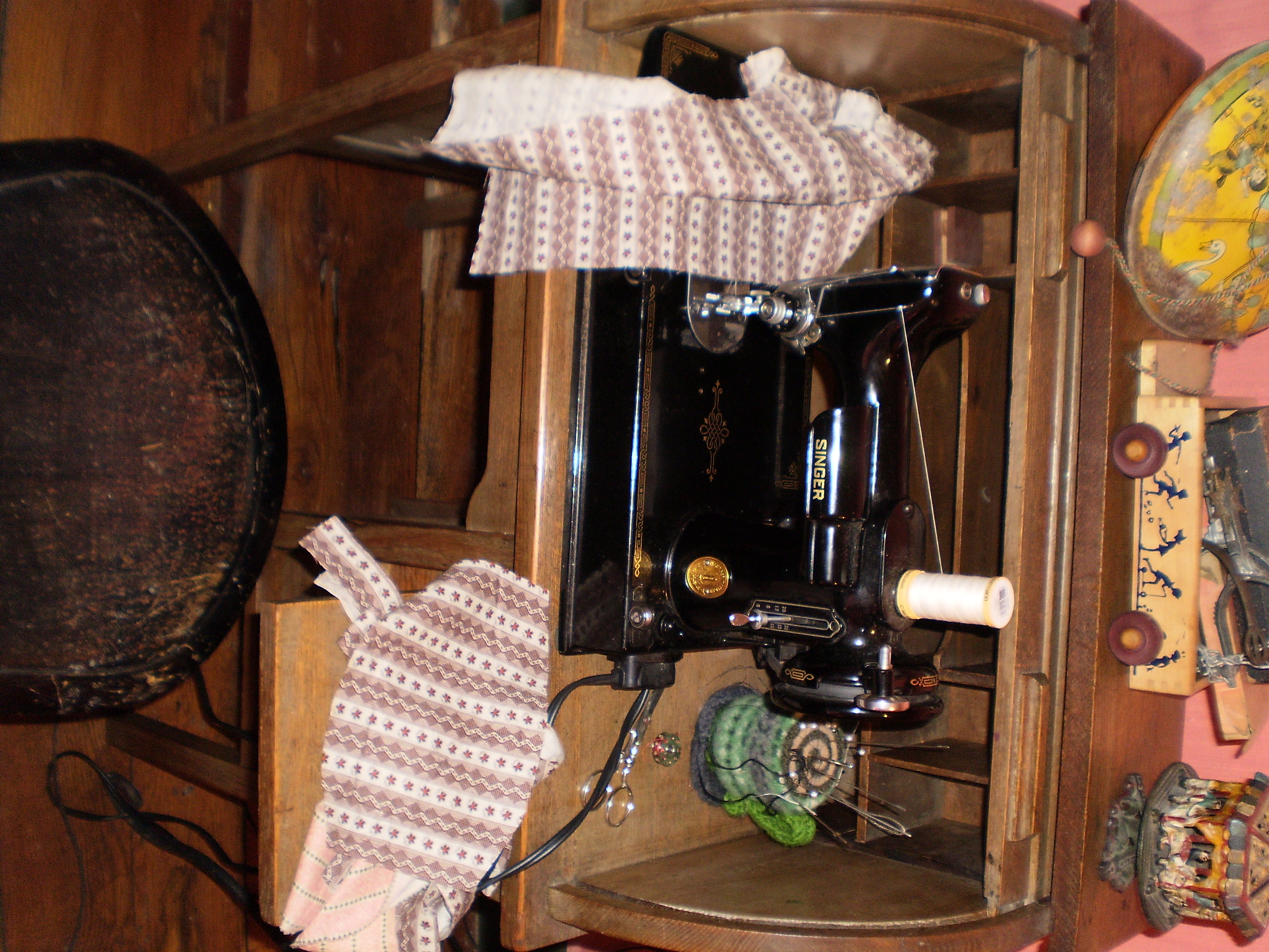 cleaning and painting. So I have been distracting myself from the heat by making doll clothes. Which has worked pretty well for several hours at a time, once I finally made allowances for the heat. It’s been too hot to sew in both my new studio and my sewing room, so I wandered around the house until I found the least stifling hot room and set up a sewing machine. After all, that is why God made portable sewing machines 🙂