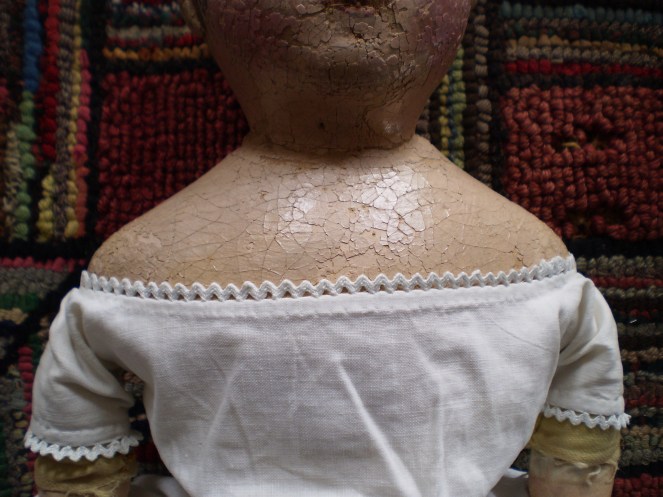 By 1882, when the following paragraph from The Dictionary of Needlework was published, waved braid was certainly common place and was being used to trim children’s clothing. It’s not a far leap from children’s garments to doll clothes, which explains why waved braid is often seen on doll clothing from this era.