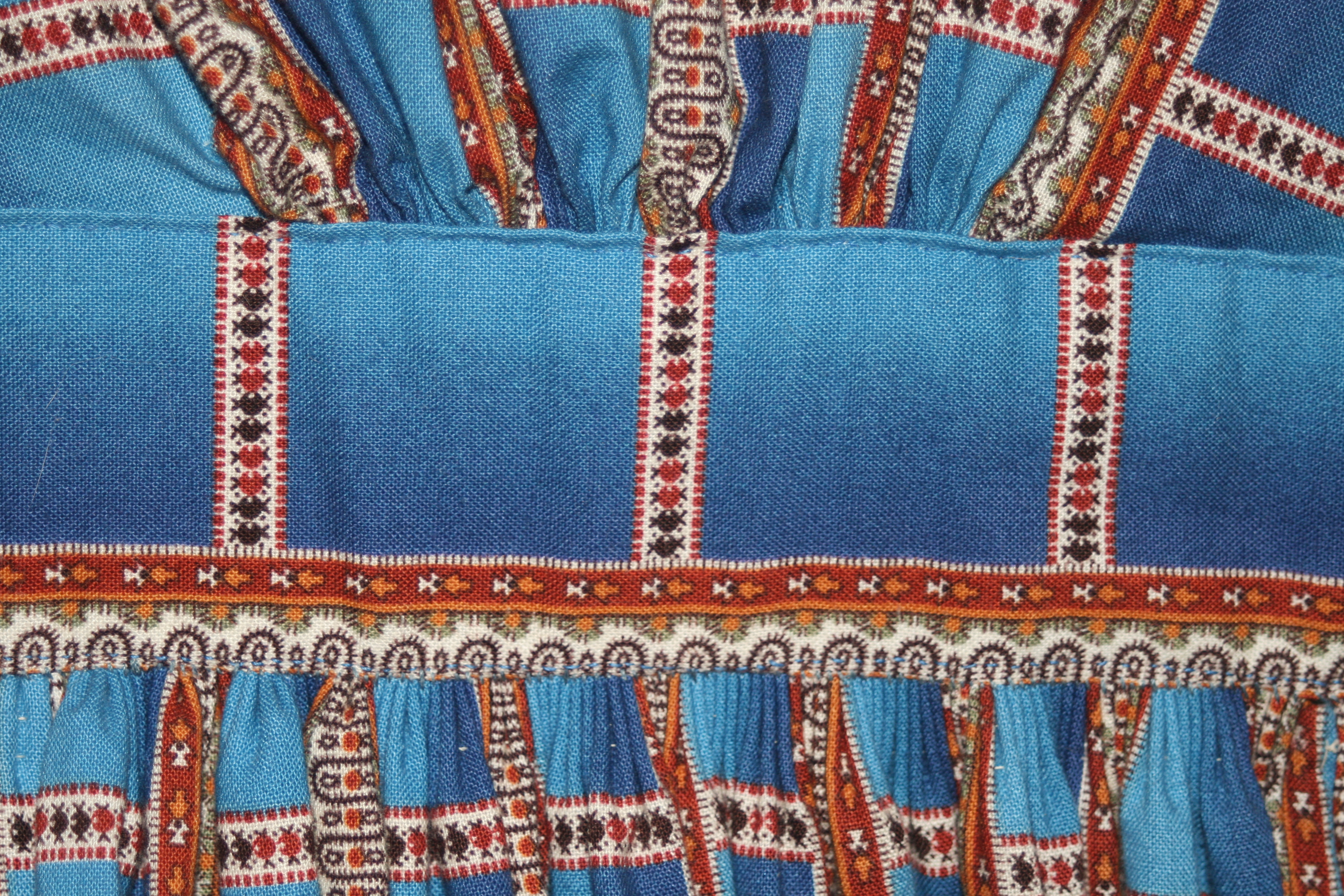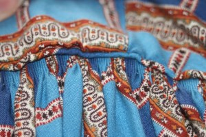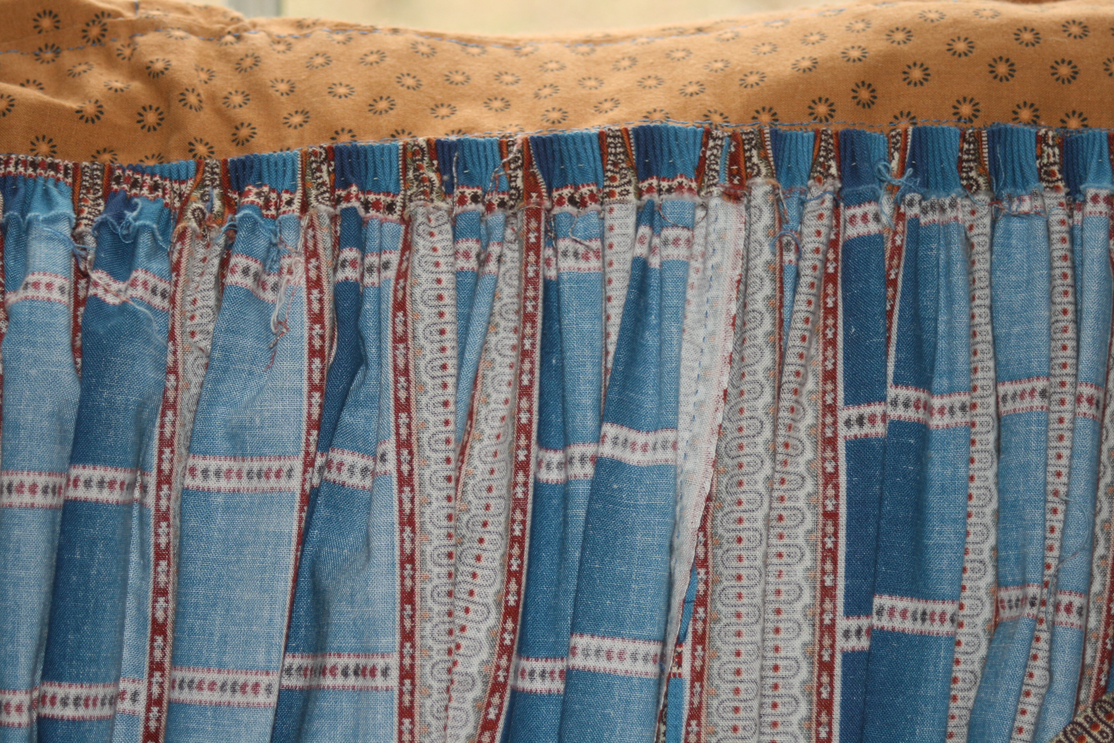 The inside of a cartridge pleated skirt. Notice that the amount of fabric turned down for the cartridge pleating increases by 1/2 inch from the right side of the photo to the left. This is intentional.