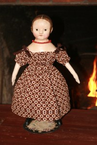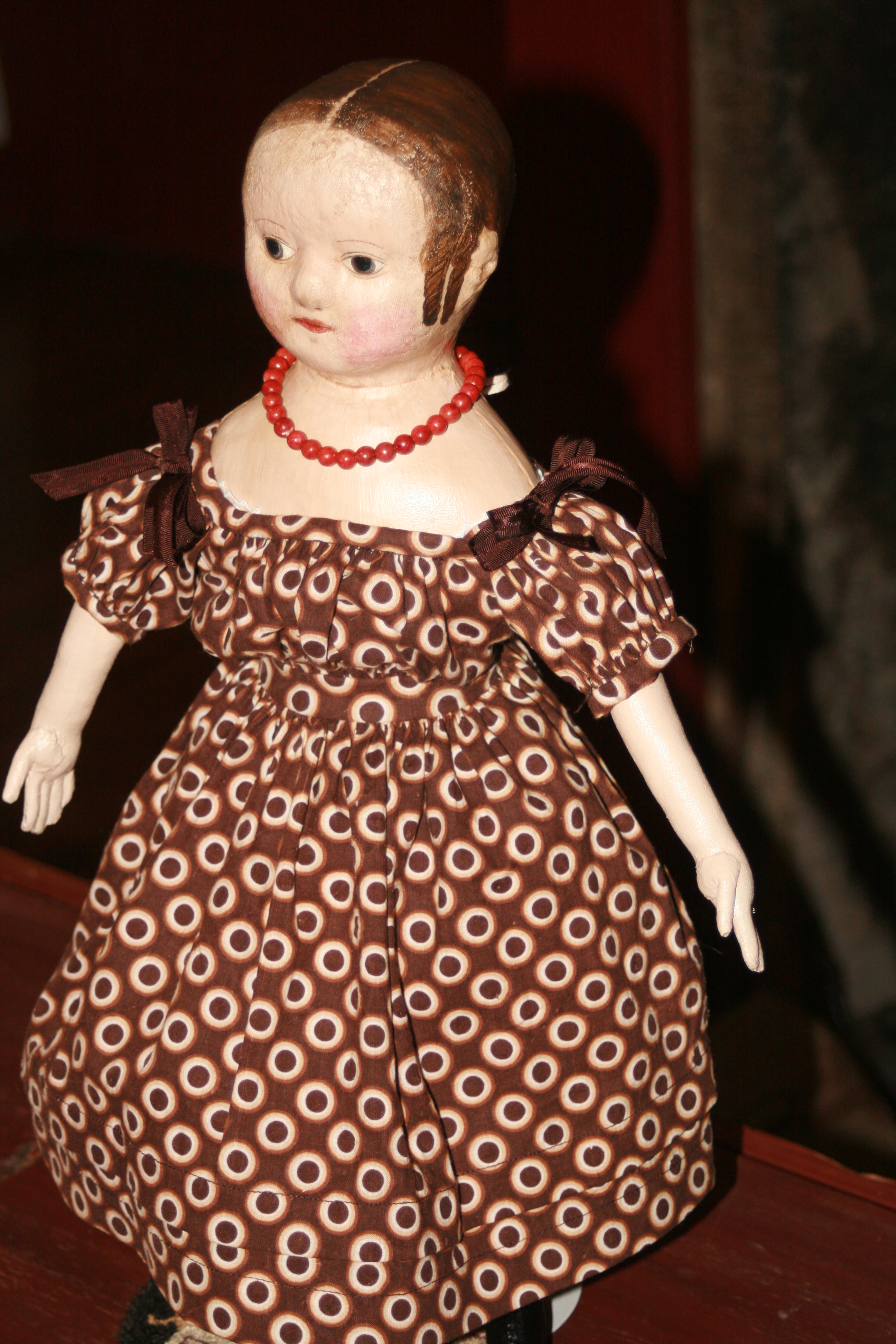 If you are fond of dolls that have obviously led a full life and been well loved, then you will appreciate the finish and appearance of this doll.  She has two curls in front of each ear and seven more ringlets along the nape of her neck.  Her clothing consists of a cotton chemise & pantalettes, an embroidered flannel petticoat, a linen petticoat, and a dress made of brown madder dyed cotton.  All of the fabrics, lace and buttons are antique.  She has scallop topped painted boots and a real coral necklace.