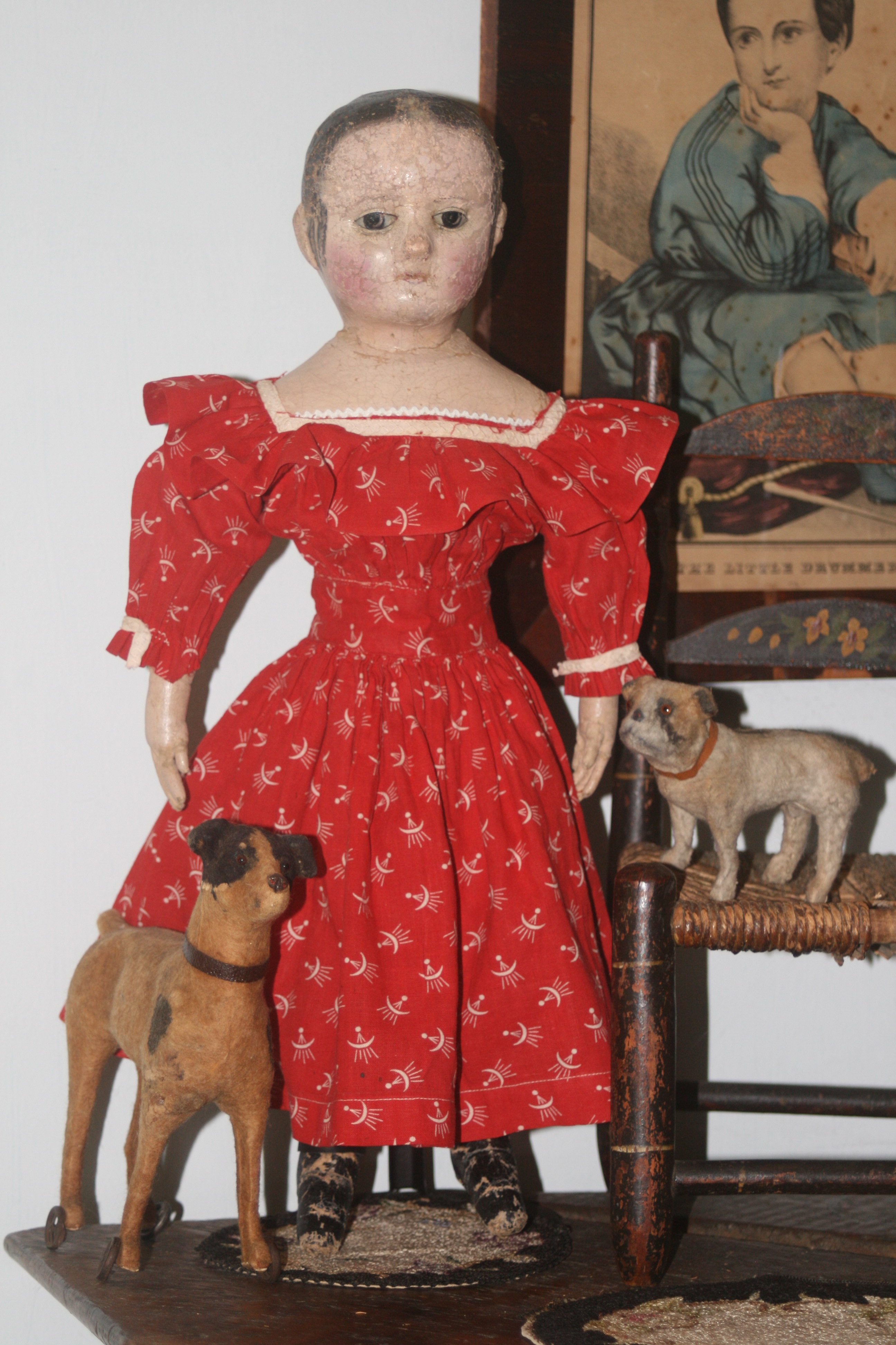 My Izannahs have a “new” red dress to share. The 19th century print fabric of the dress is still vibrant and beautiful, and is the main thing that drew me to the dress upon first sight. This dress has had some ill treatment in it’s life time, before finally ending up on eBay and making it’s way here to me. I can tell that it was originally made to fit a doll exactly the same size as my antique 18-19 inch tall Izannah Walker dolls. At some point, someone decided that they wanted to put it on a larger doll – and they were in a hurry to do so – because rather than altering the dress properly they just hacked away at it with a pair of scissors! The bottom of the sleeves were snipped, with a pair of pinking sheers, up through the ruffle, wrist band and gathering, to allow a larger hand and arm to fit through the sleeve. Then the original neckline and upper part of the dress was cut away to the bretelle ruffle, to accommodate a doll with a larger neck circumference.