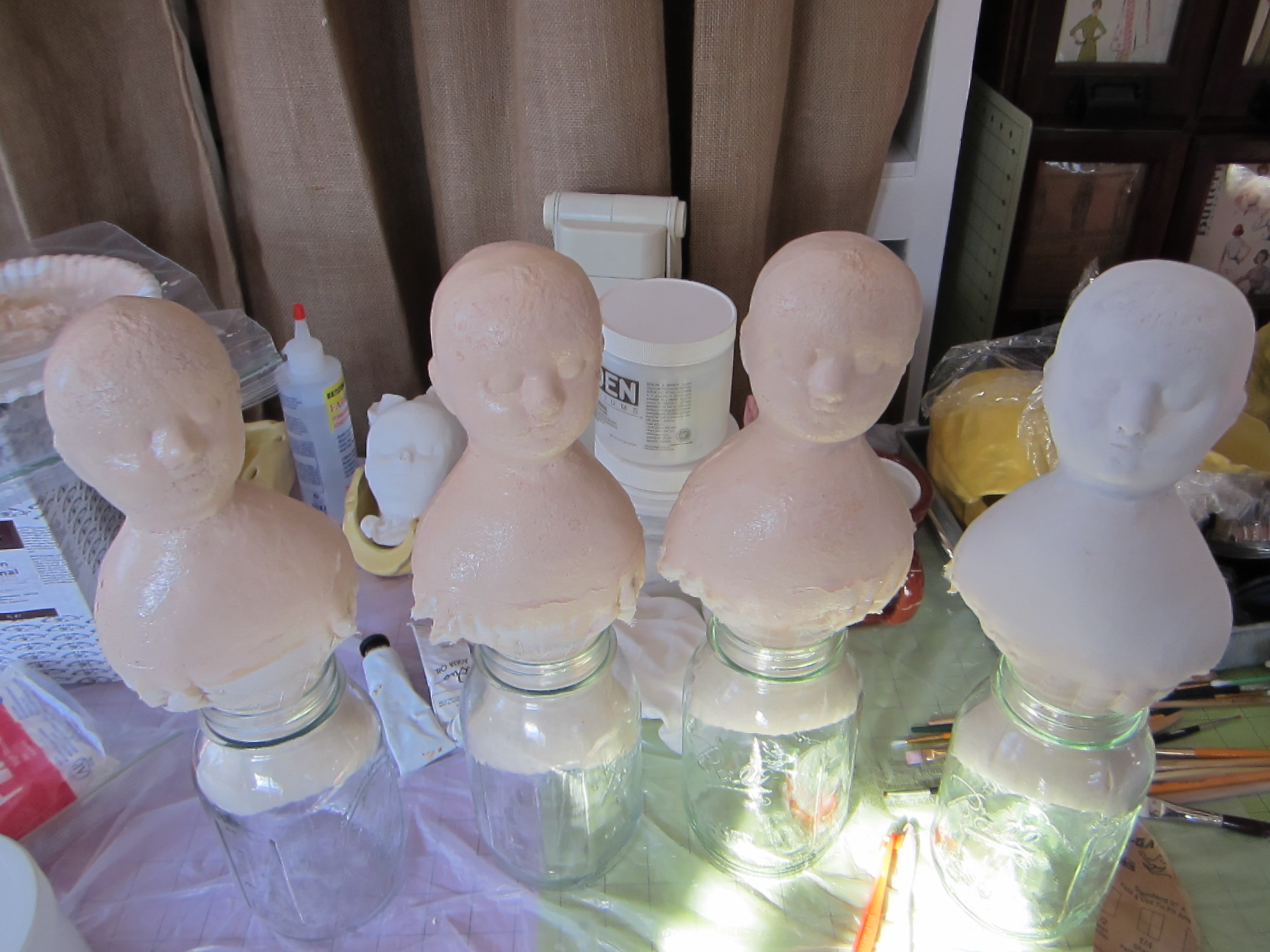 Now that she is finished, she will be keeping me company in my kitchen.  I created her for myself, incorporating all of my favorite Izannah details.  I even added a third ringlet in front of each ear, like the ones on the lovely antique Izannah that was just up for sale on eBay last week.  I doubt that I will ever be able to afford the $22,000.00 opening bid on the eBay doll, but I decided that I can treat myself to one of my own dolls.