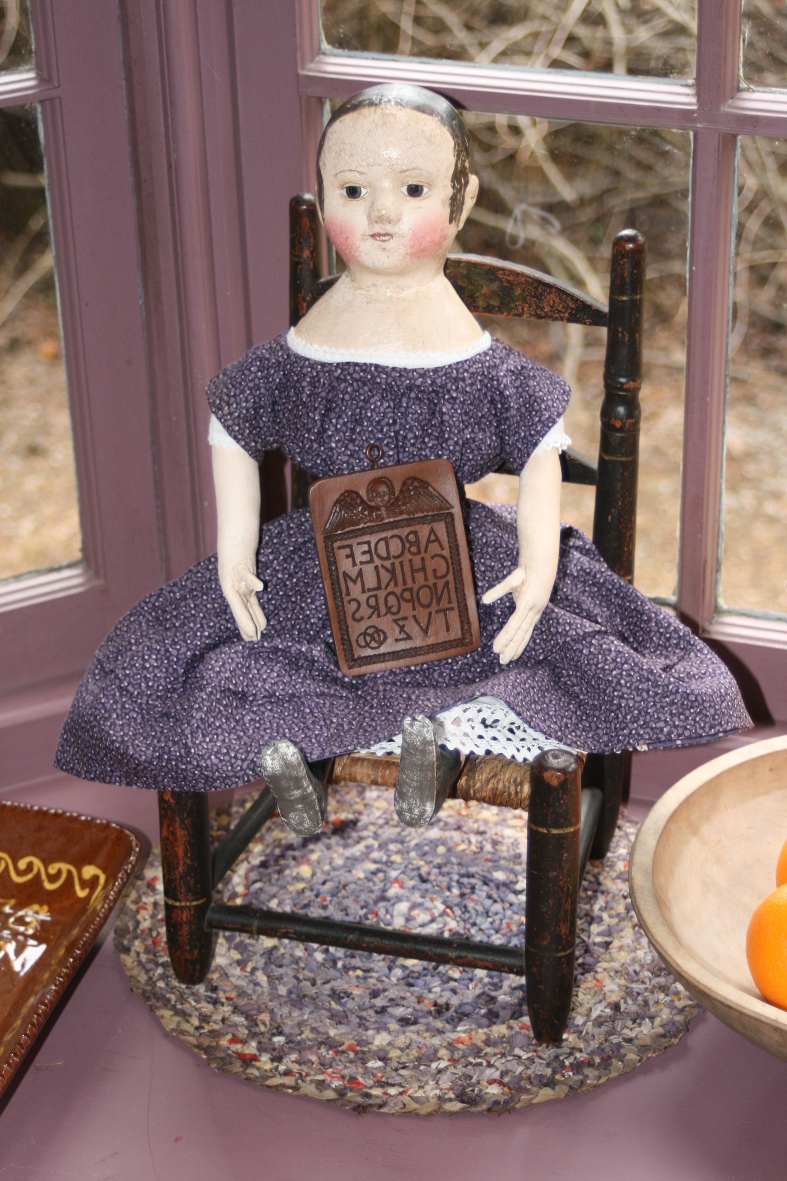 The chair is a doll’s chair and both the chair and the “rug” (which is really a table mat) are antiques. The “rug” is hand braided silk.