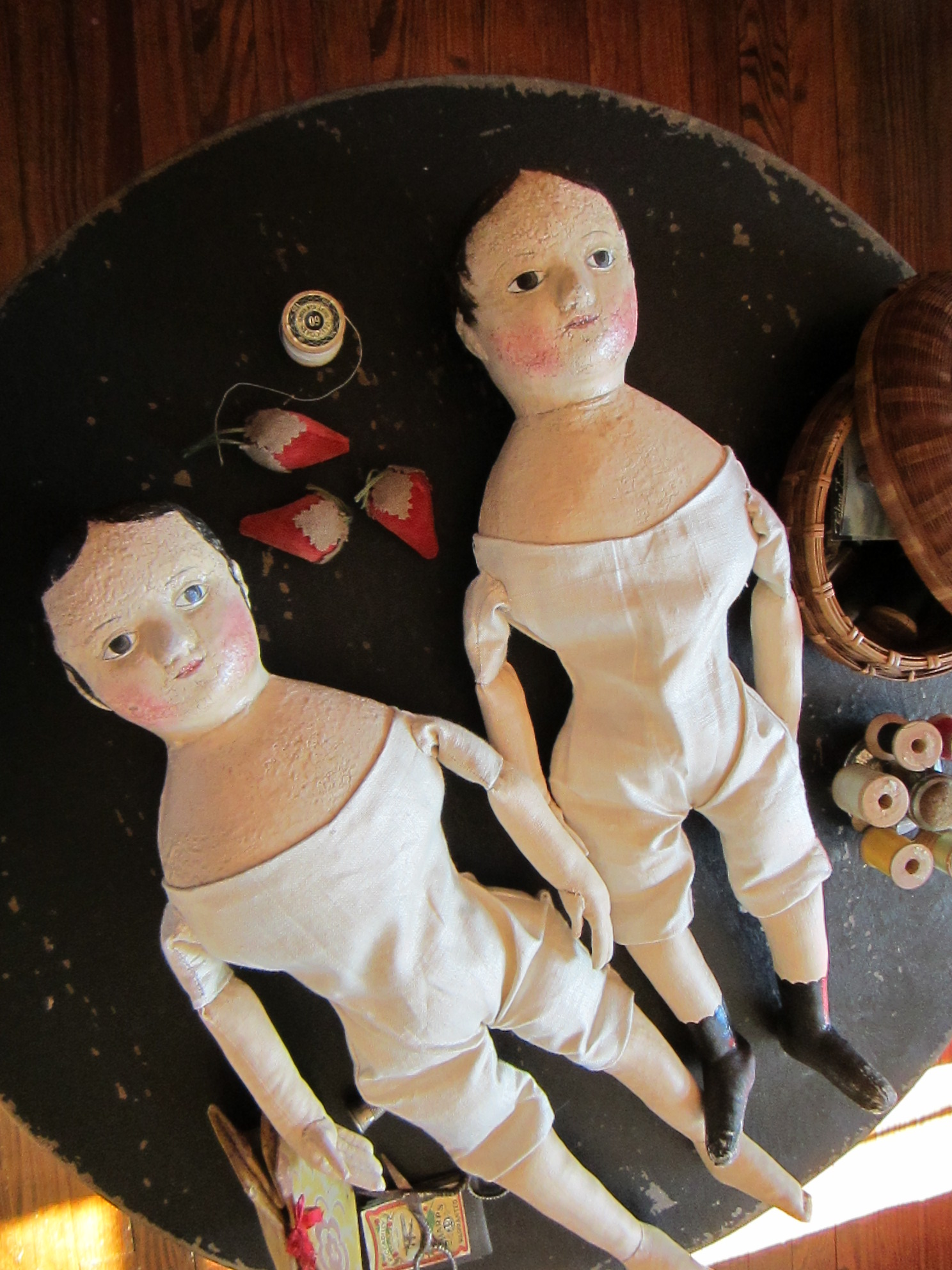 I put the final few stitches in my two latest dolls today!  The winter weather has made me nostalgic for dolls reminiscent of rural New England.  Sweet dolls that have passed through many hands and generations, saved by mothers and grandmothers…  Dolls with stories of their own and history in their faces.  Can’t you just tell that both of these dolls have had adventuresome lives?  What bedtime stories they could whisper in a child’s ear…