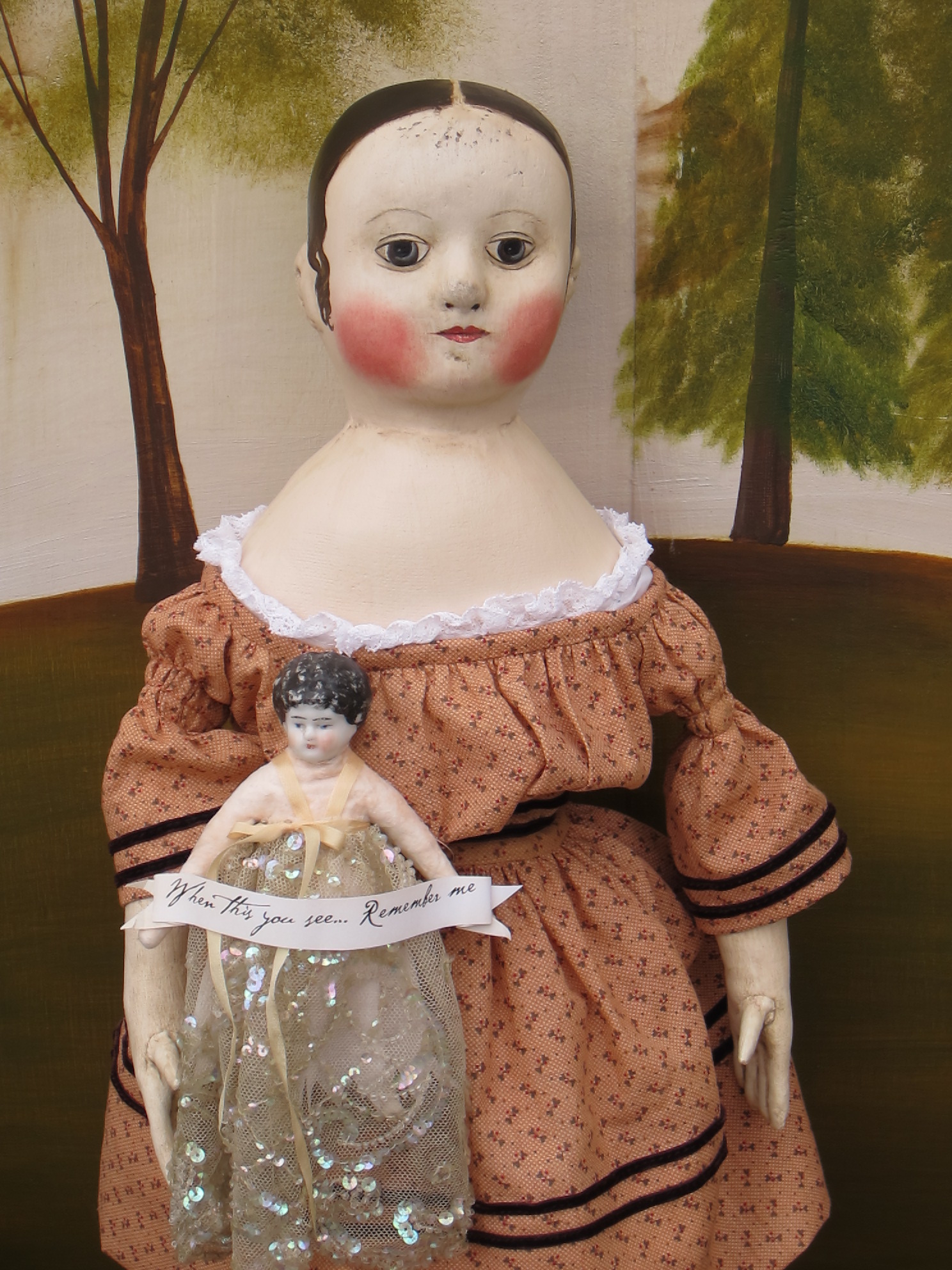 I was just stunned that she would go to all of the trouble to call me. It was so very sweet of her. She told me that her mother loved to hold the doll as well as look at her sitting in a little antique chair and that Maxine told her that she like the doll I made much better than the old ones. What an amazing compliment from a woman who had collected dolls for such a long time. Maxine had actually called me about a month ago to talk to me about making a dress for a doll that she had just bought from an auction. I’m so happy that she got to enjoy her doll collecting for her entire life. Doll people are truly amazing and special people.