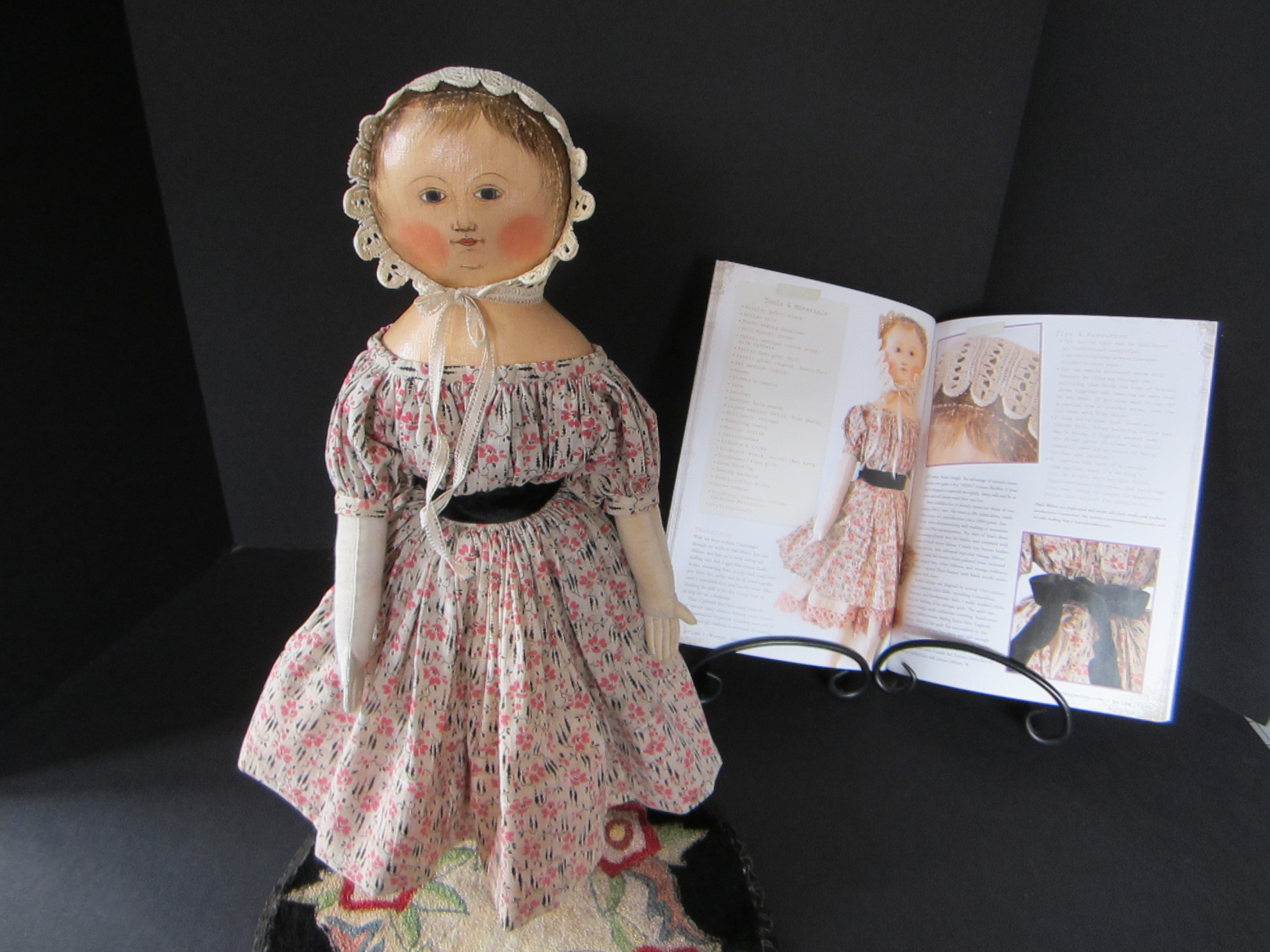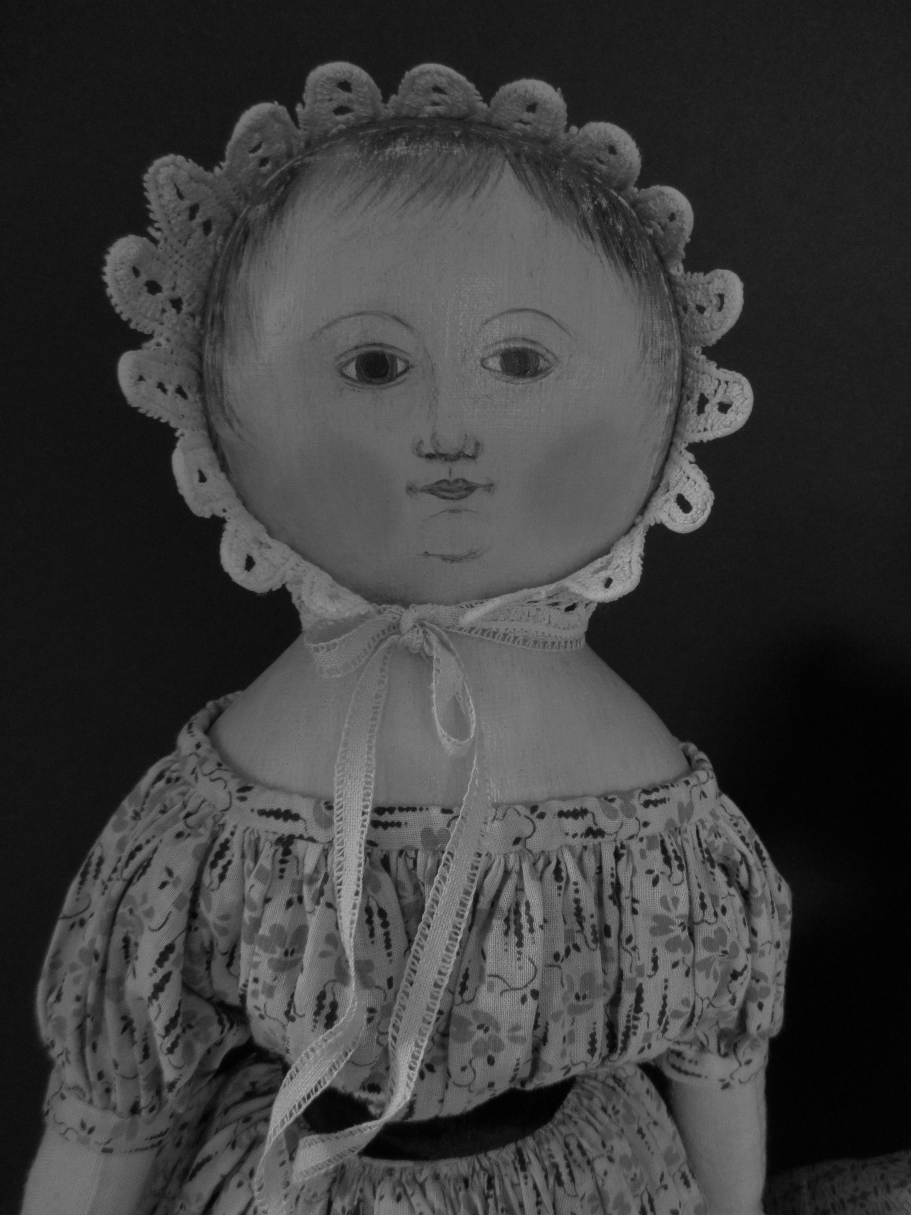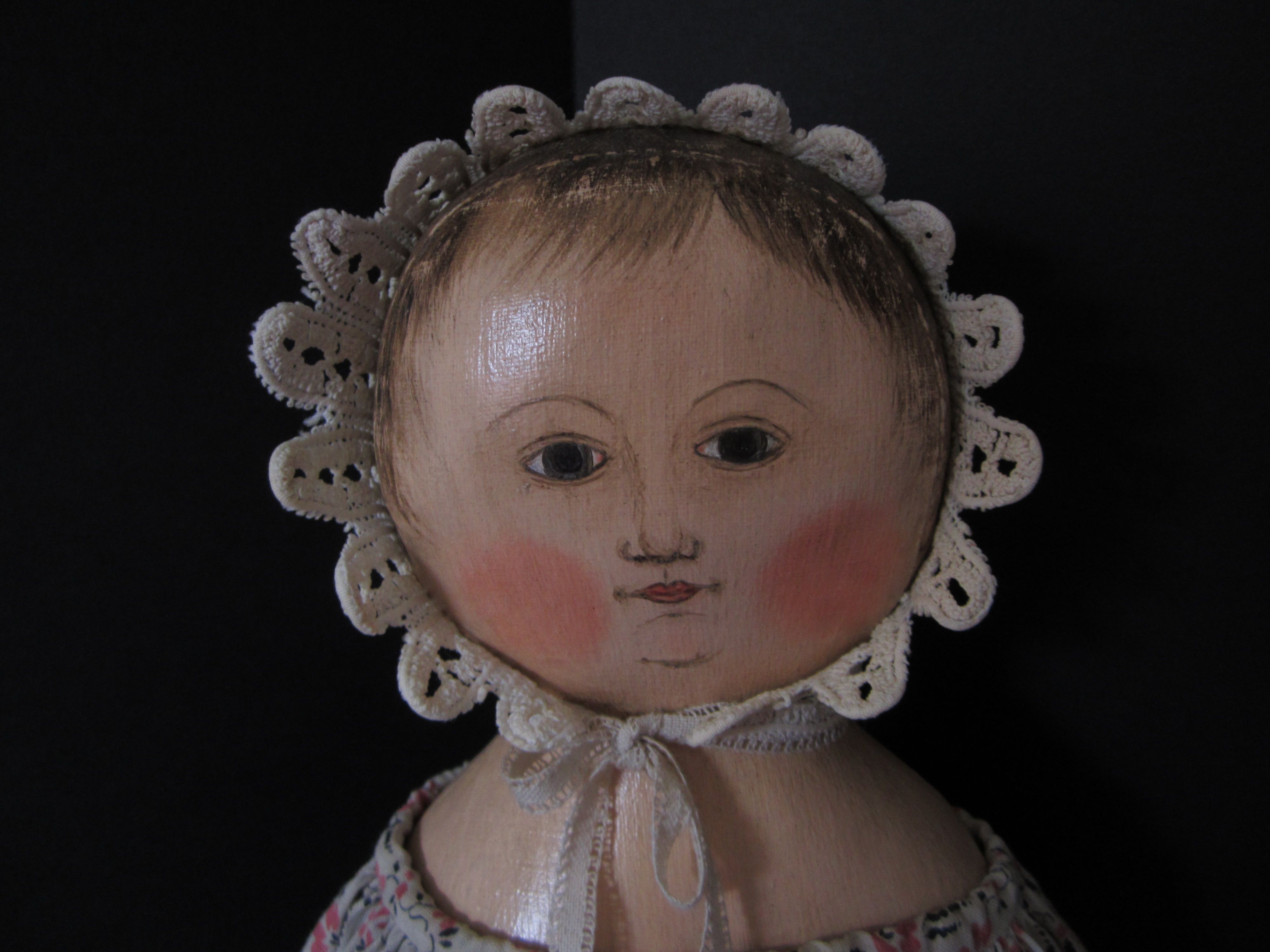 SOLD Sophie is dressed in a pink and black print dress made from antique late 19th century fabric, a petticoat with lavish pink crochet trim and a cap made from antique crocheted cotton lace.  Her face, head and shoulders are painted with artist’s oils.