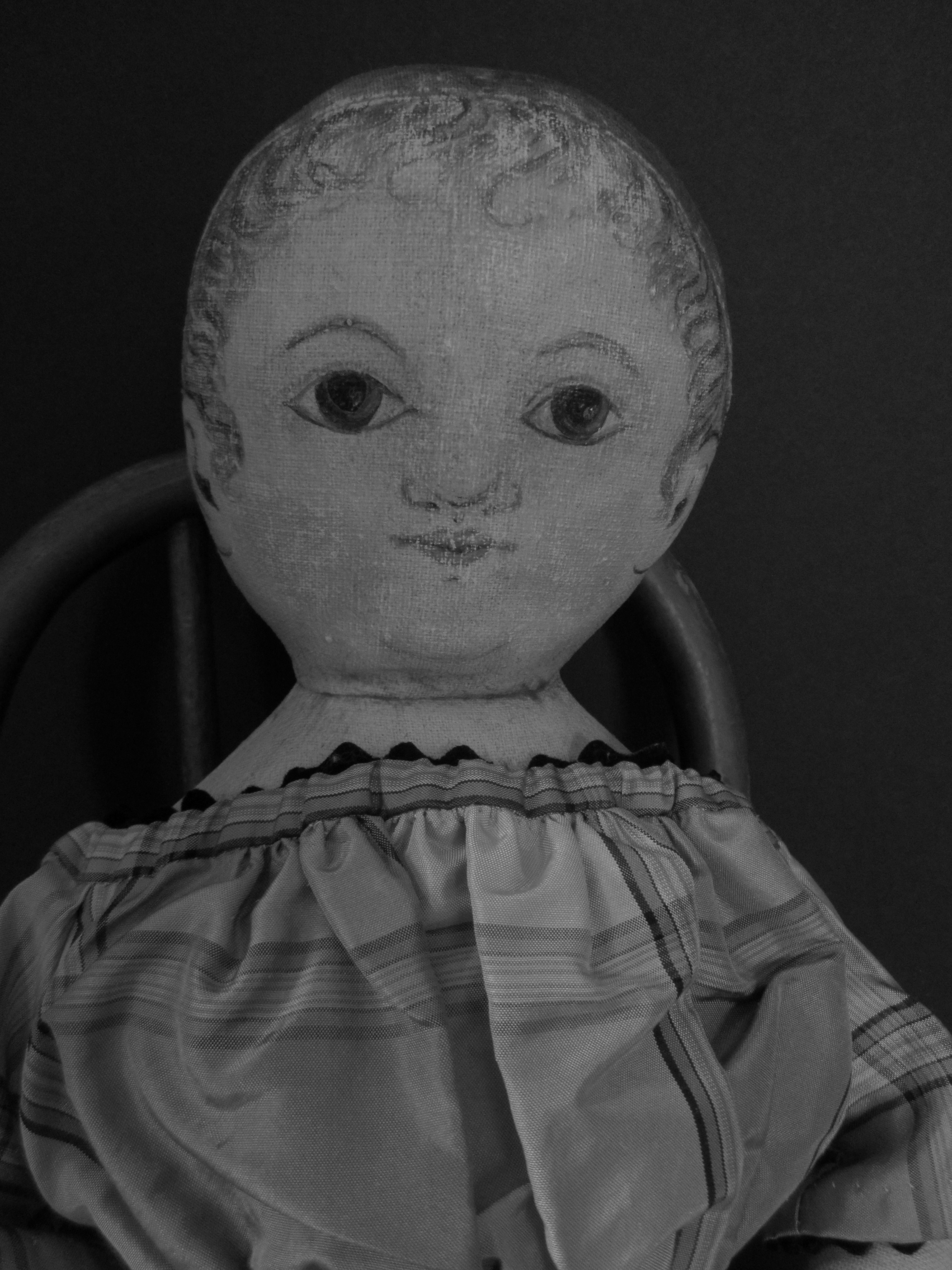Mae is an 18 inch tall portrait face doll, made entirely of cloth. I painted her childlike face using artist oils over gesso. Mae’s face is loosely based on those of two antique painted cloth dolls in my personal collection. Her body is made of cotton muslin, which I aged using dyes. She is wearing a silk plaid dress, with black velvet trim. The skirt of the dress is cartridge pleated into the bodice. I made tiny brown leather shoes for her, which have scalloped tops and vintage ribbon laces. Her bonnet is made from painted straw trimmed with antique lace, with velvet ribbon ties.