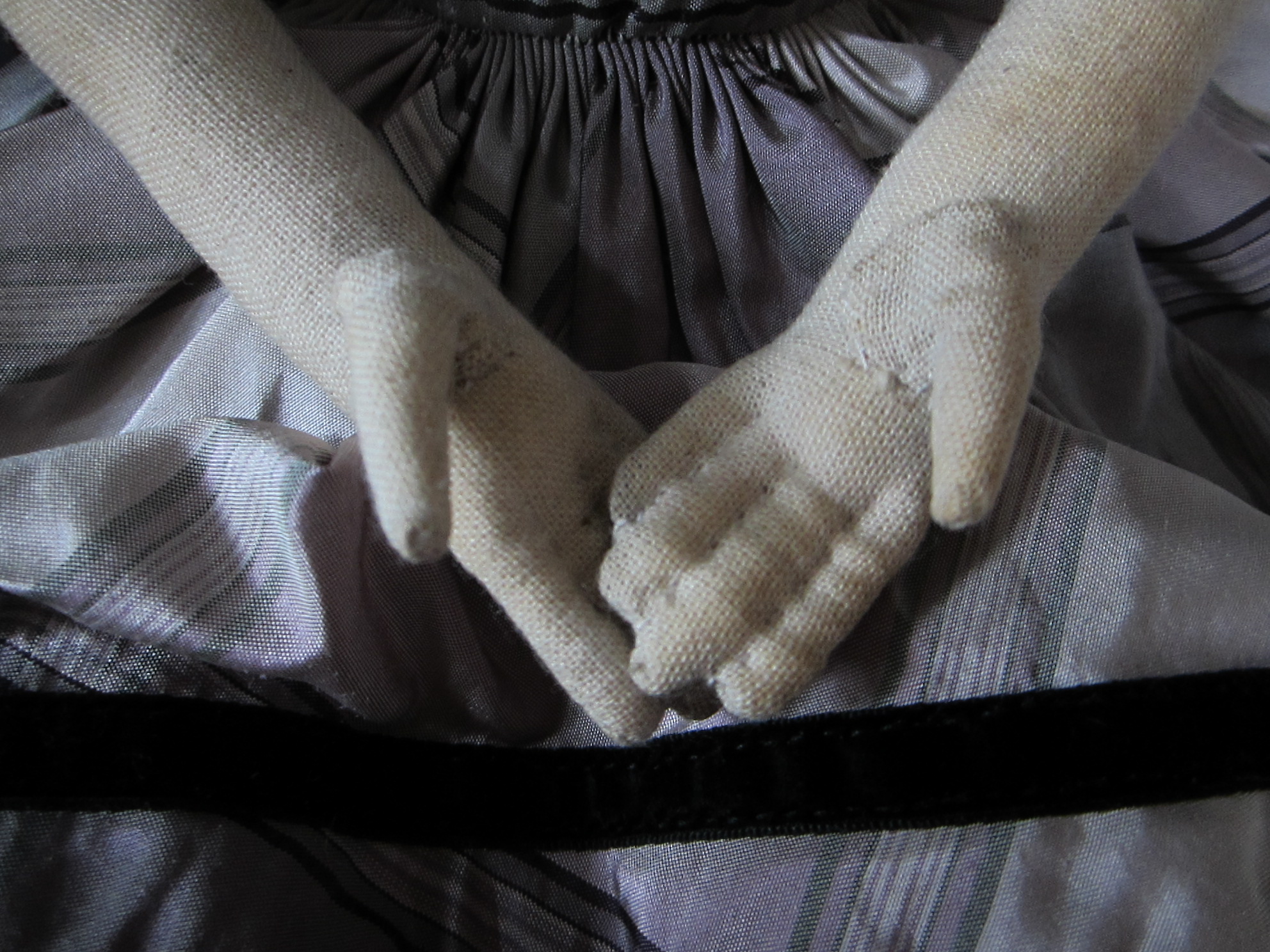 SOLD Mae’s face, head and shoulders are painted with artist’s oils.  She is wearing a silk plaid dress with cartridge pleated skirt and velvet ribbon trim, a white scalloped petticoat, black hand knit socks and handmade brown leather shoes with purple silk laces.