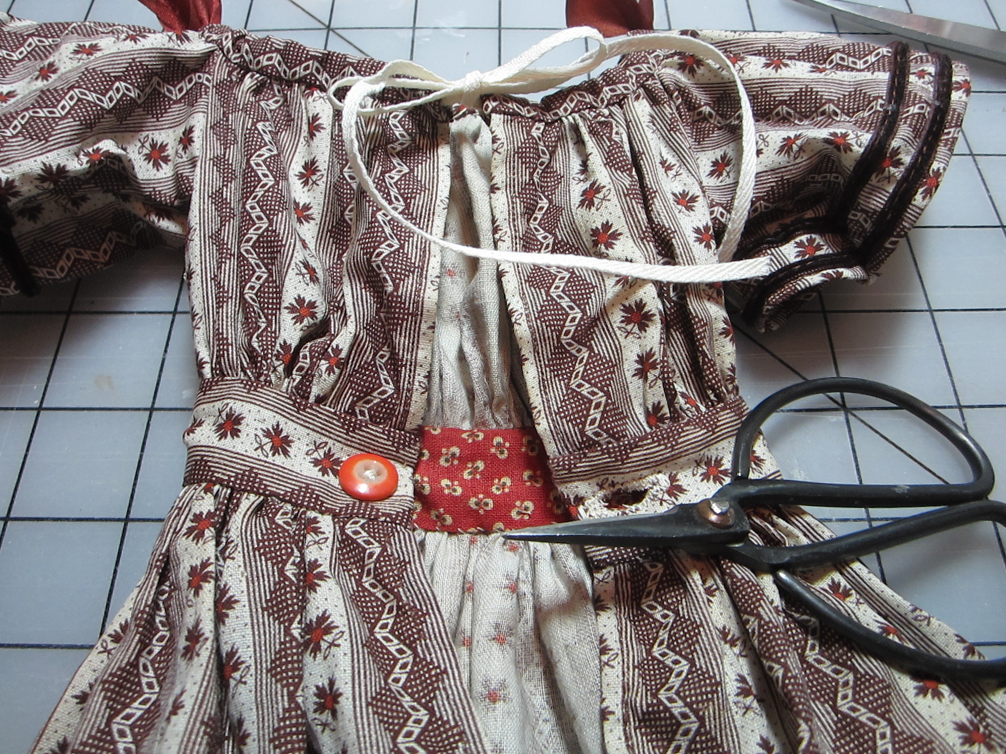 Mary also bought the antique blue trim that is around the neckline and sleeves of this dress.I cartridge pleated the skirt of this dress. Mary requested thumbs that are folded close to the palms of the hands.