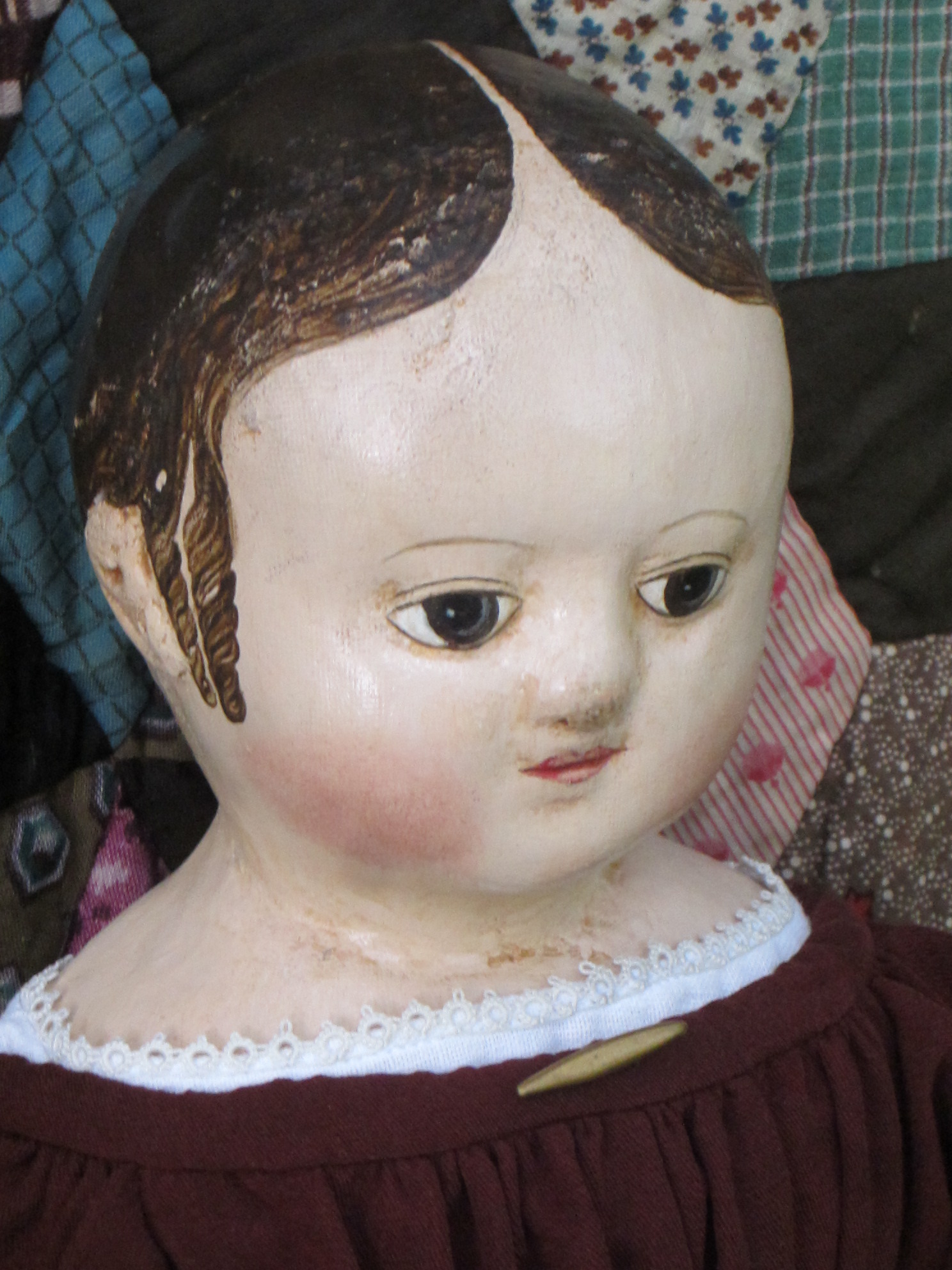 ISADORA IS NOW SOLD – THANK YOU! Meet Isadora, she is the very first doll made from one of my three new molds. She has a sweetly rounded head and features. Her paint is lightly distressed to give her the aged appearance of the original she was reproduced from. I made Isadora’s dress from a very old wool challis paisley shawl. She has an antique bar pin at the center of her neckline.
