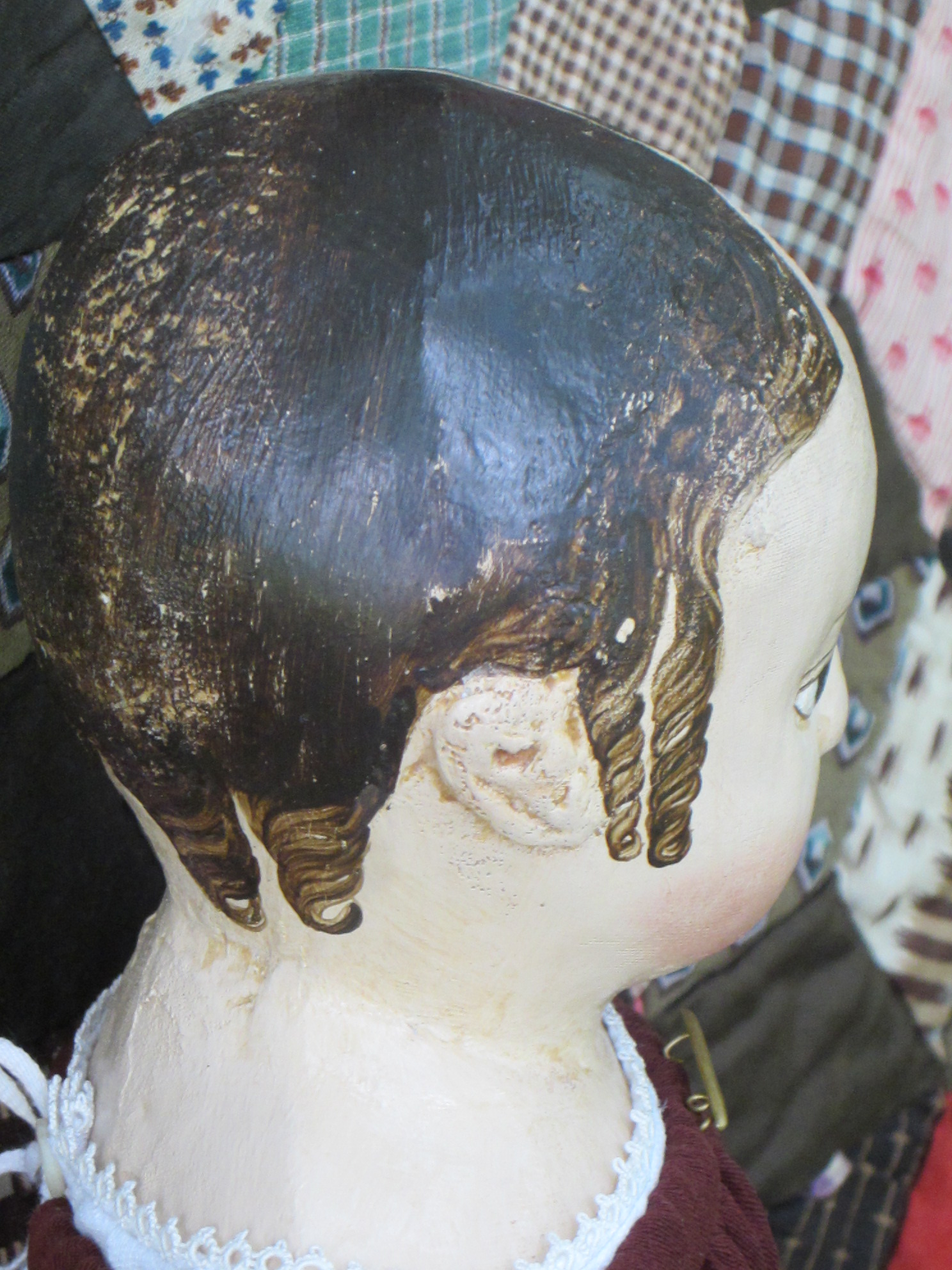 Isabeau #4 WAS LISTED ON EBAY, BUT HAS NOW SOLD. I love her sweet, shy expression and the way her head cocks slightly to one side, as if she is bending nearer to listen to secrets being whispered in her ear. She is wearing a dress made from a rare piece of c.1850 double violet fabric. The dress has one growth tuck in the skirt and a false hem made from antique purple and white polka-dot fabric. If you would like to know more about Isabeau #4 you may email me at paula@asweetremembrance.com.