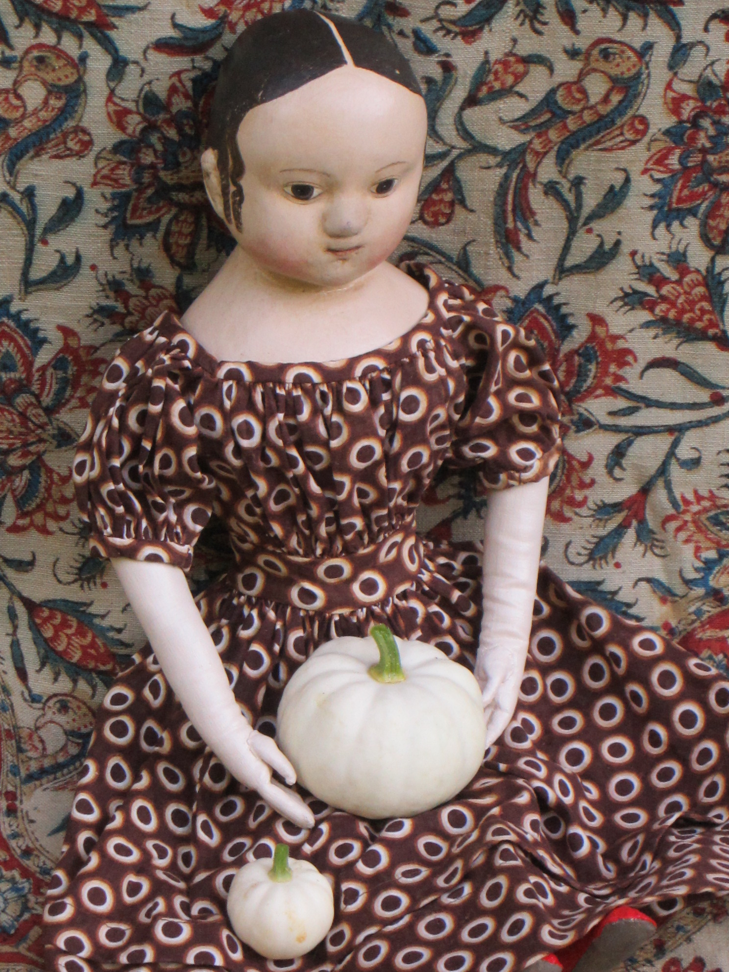1. Hi Paula, there’s a chill in the evening air here in VT. I can see your reasoning in picking pumpkins early. Tonight I picked a nice basket of early mixed tart apples, even though we haven’t had a frost to sweeten them up yet. Guess I couldn’t wait to get out to the orchard and walk thru it. Tomorrow will see what I turn the tart apples into. Your dolls look so cute. Love, Mary G.