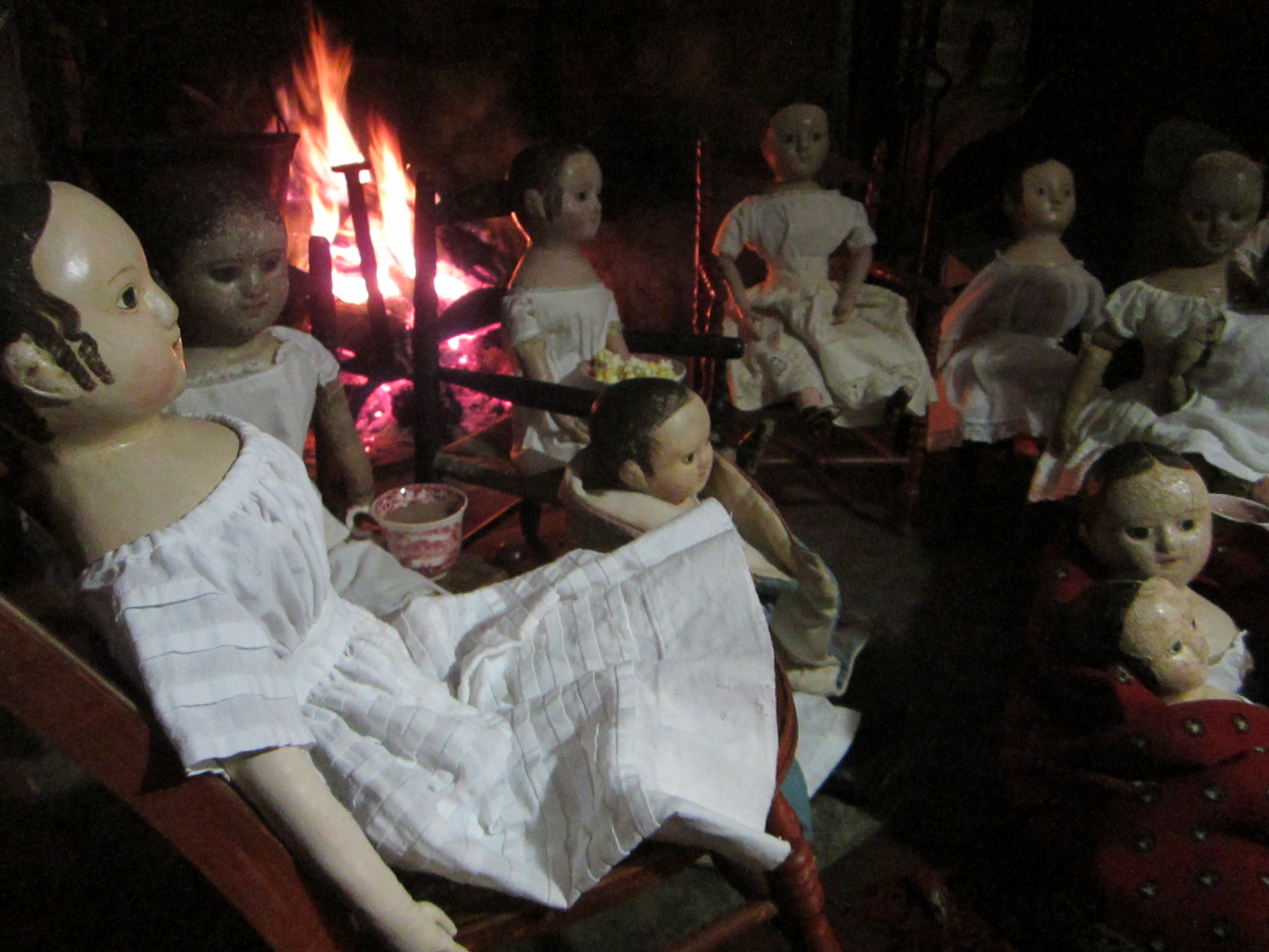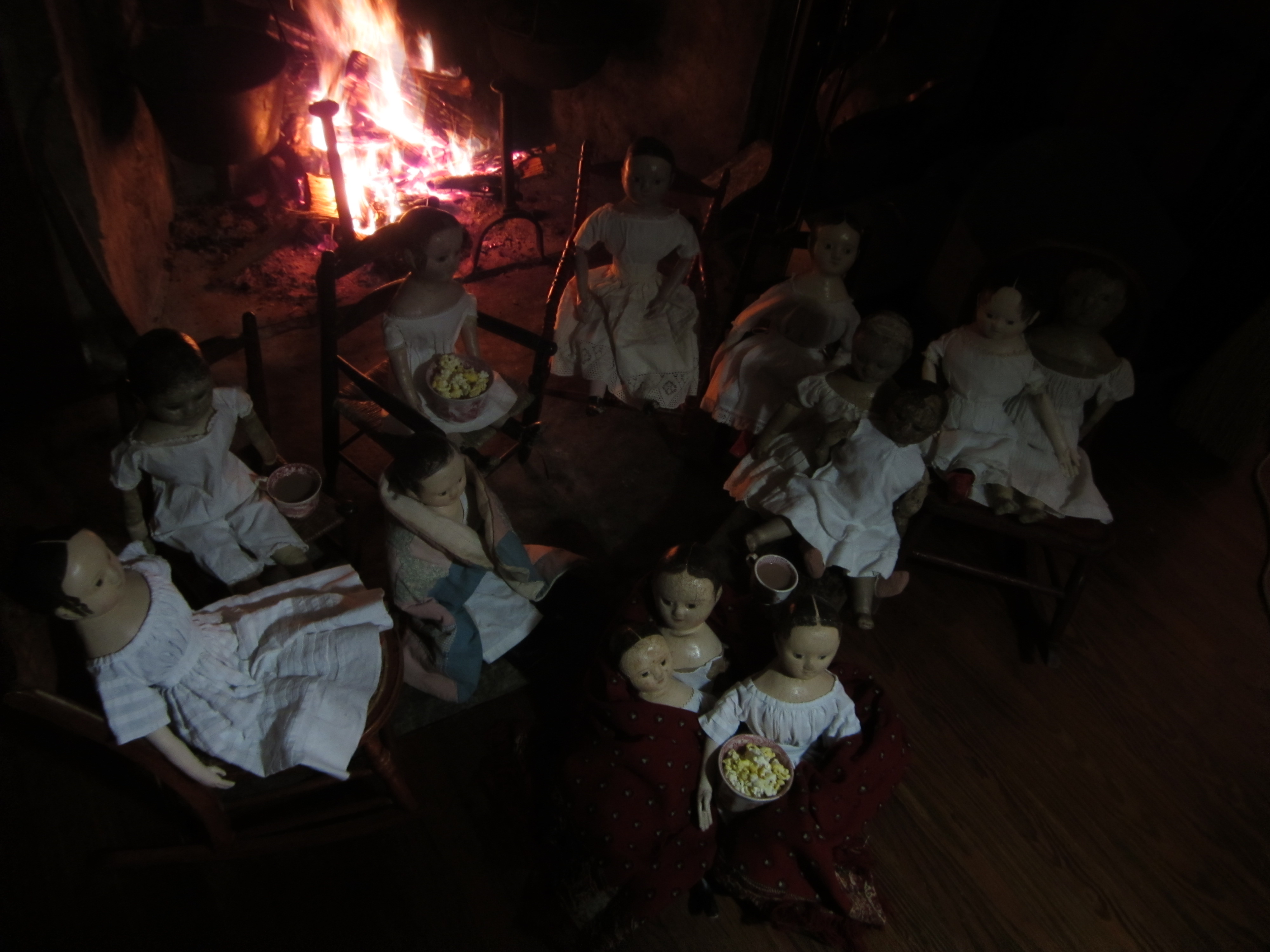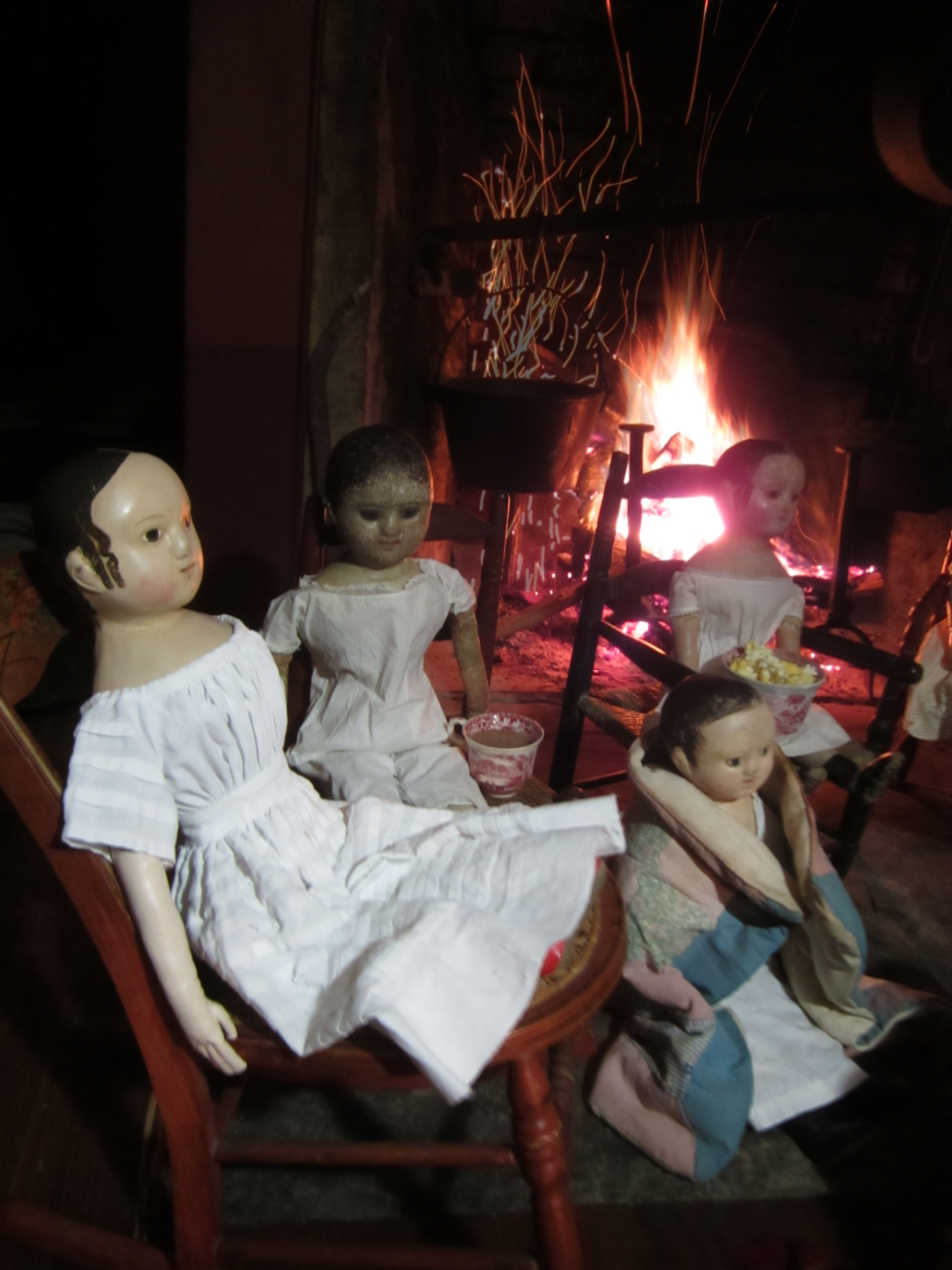 The dolls are all nestled together around a roaring fire.  They are so glad that you came to join them tonight!  This is the very last part of our all day celebration of Izannah Walker’s 197th birthday.  If you missed the first two parts of our party you will want to scroll down or click here for part one and here for part two.