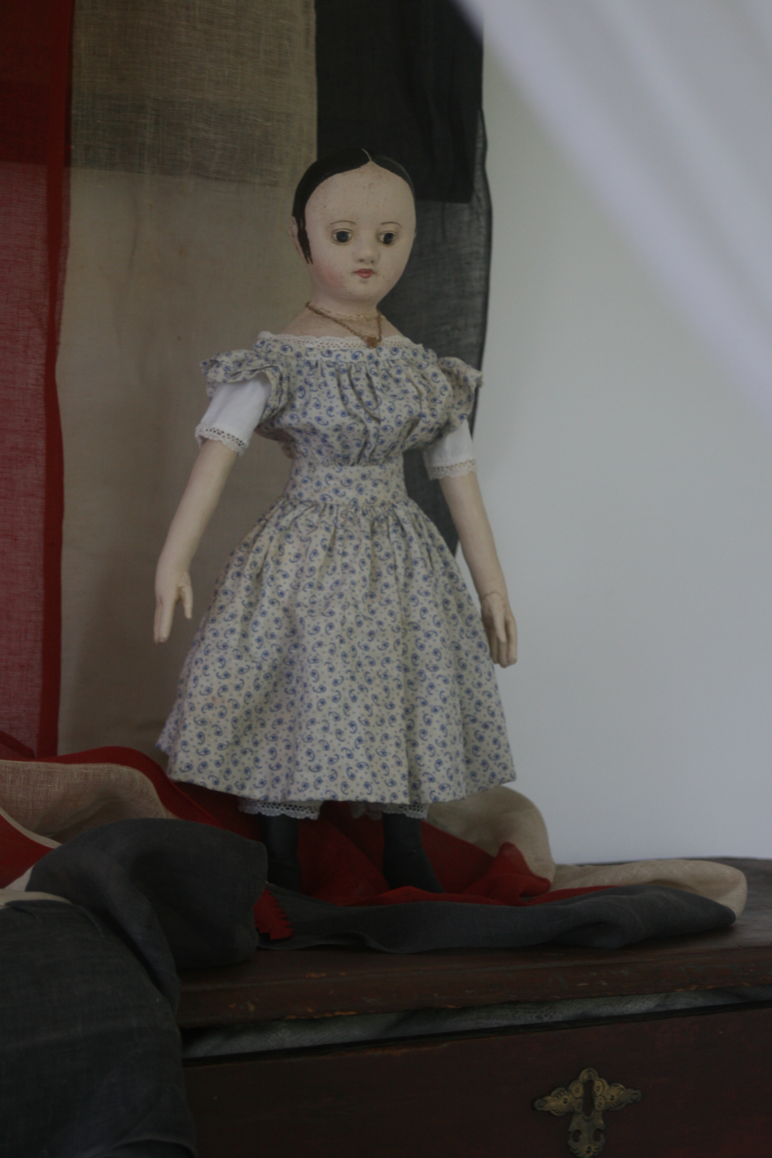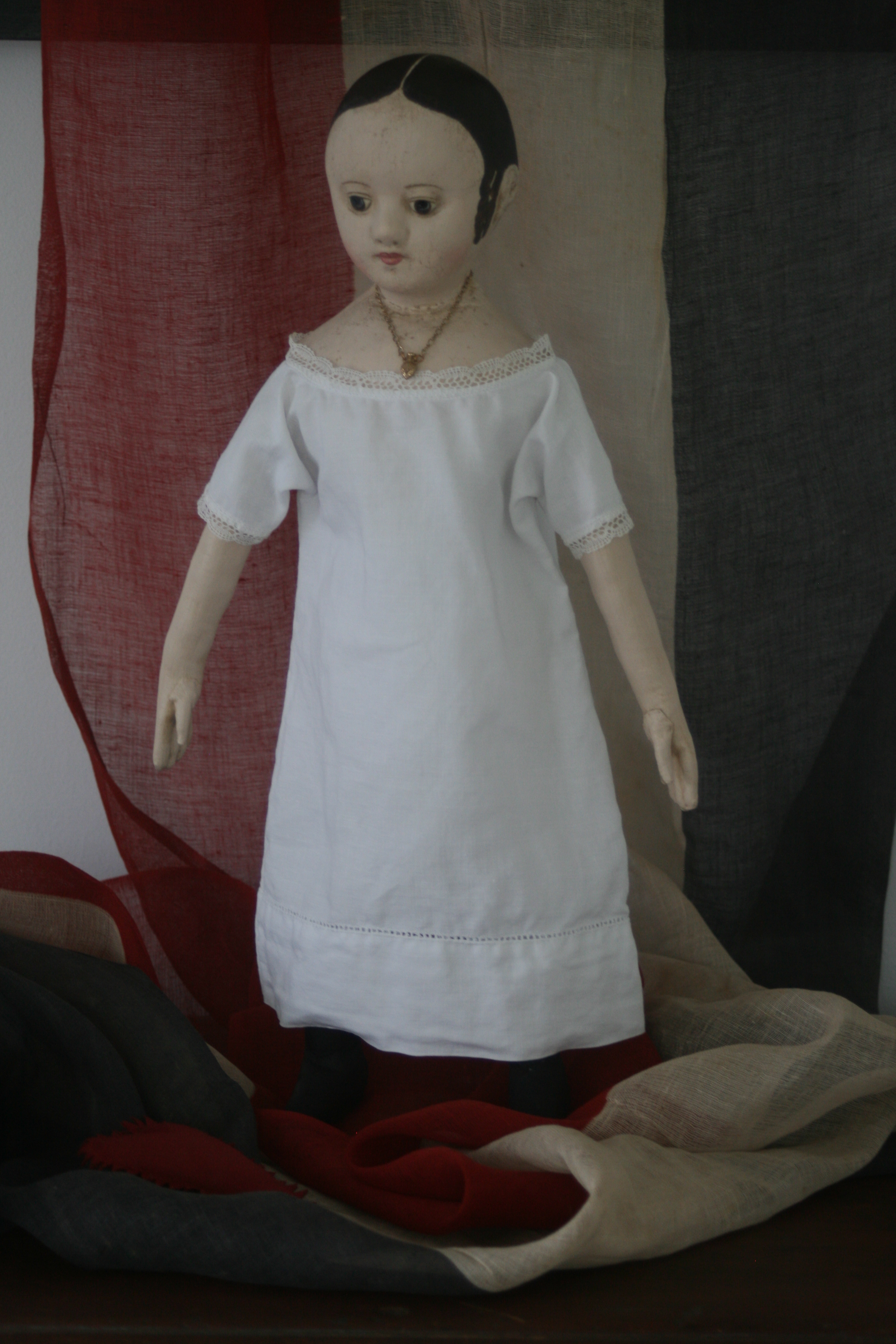 The original Ismay, on the right, is a very early example of one of Izannah Walker’s dolls. My reproduction custom ordered Ismay, on the left, is a faithful recreation of the original, with custom details specified by her new owner.
