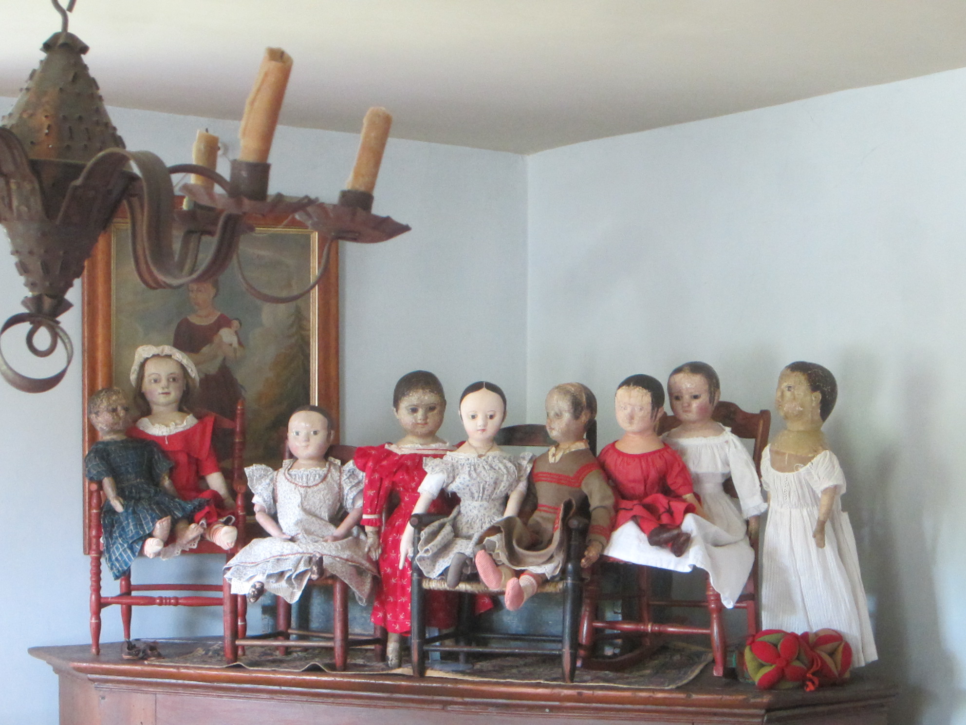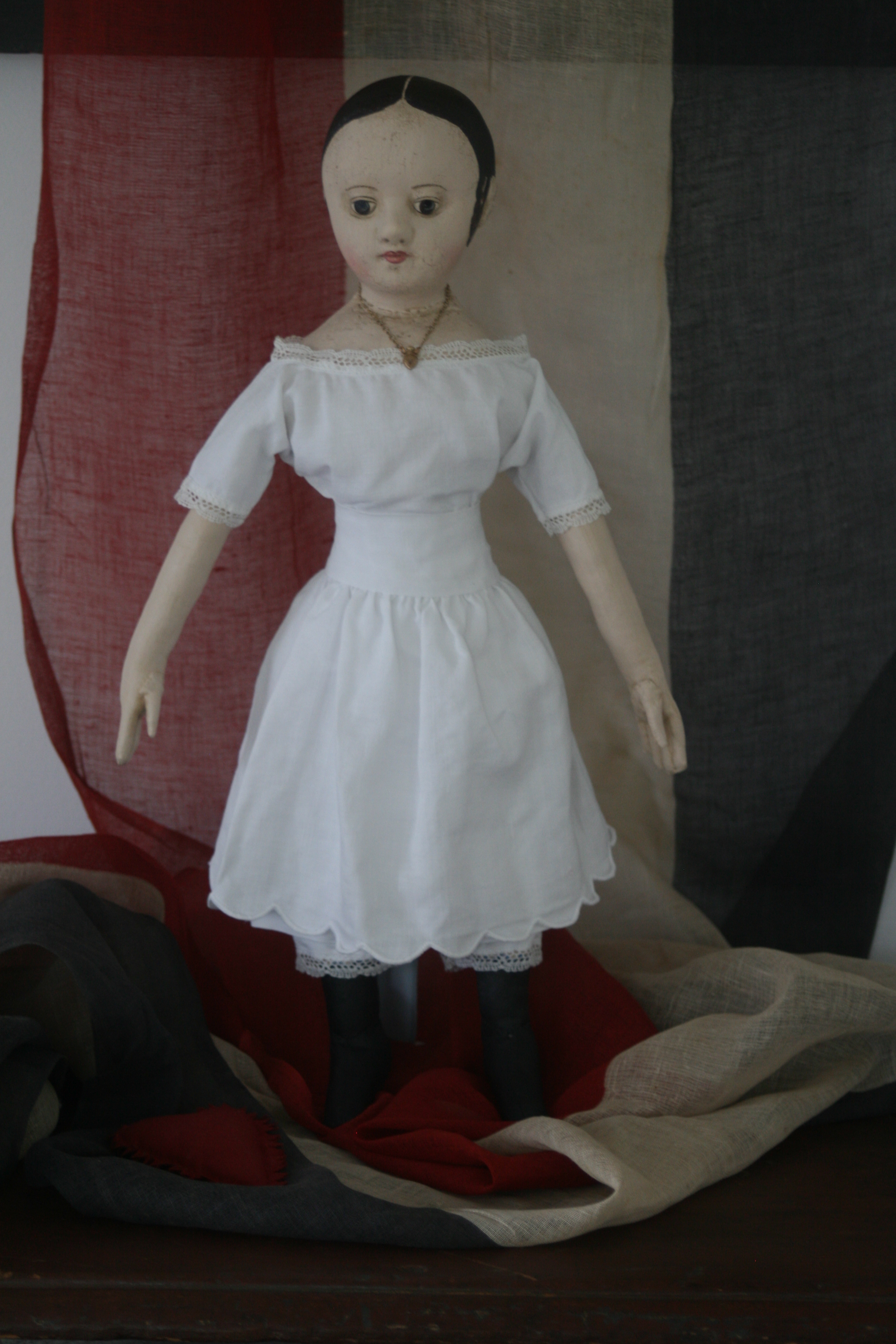 My newly made reproduction doll is shown here with two small antique friends. My goal is to make beautiful, accurate reproduction Izannah Walker dolls that will look right at home with your antique dolls and furnishings and blend perfectly into your collections.