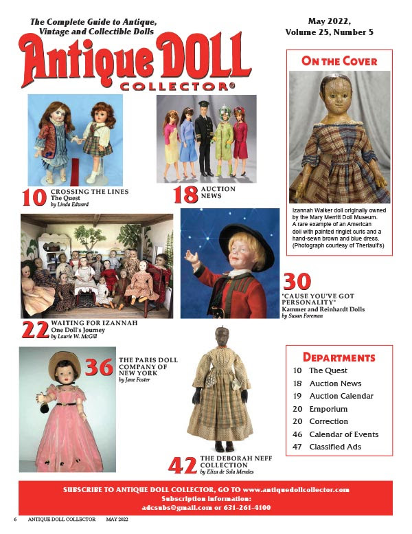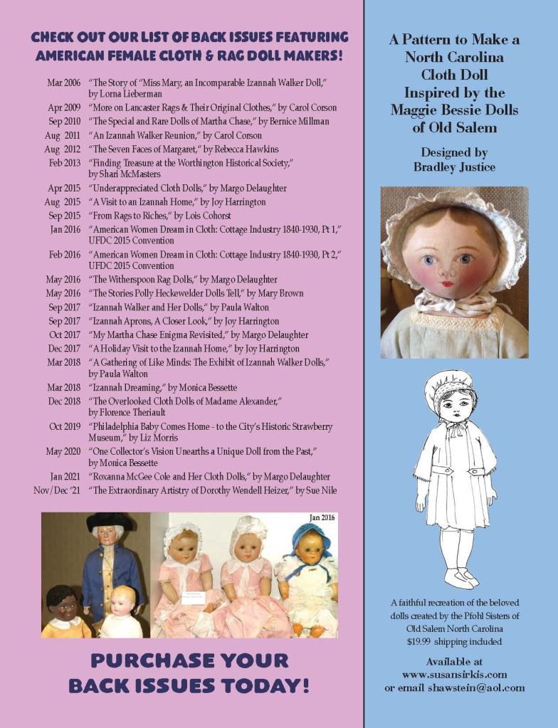 In case this latest article makes you hungry to read more Antique Doll Collector articles about Izannah’s dolls and those of other female cloth dollmakers, here is a list of the ones that have previously appeared in Antique Doll Collector magazine, including the two articles I wrote for ADC. ❤