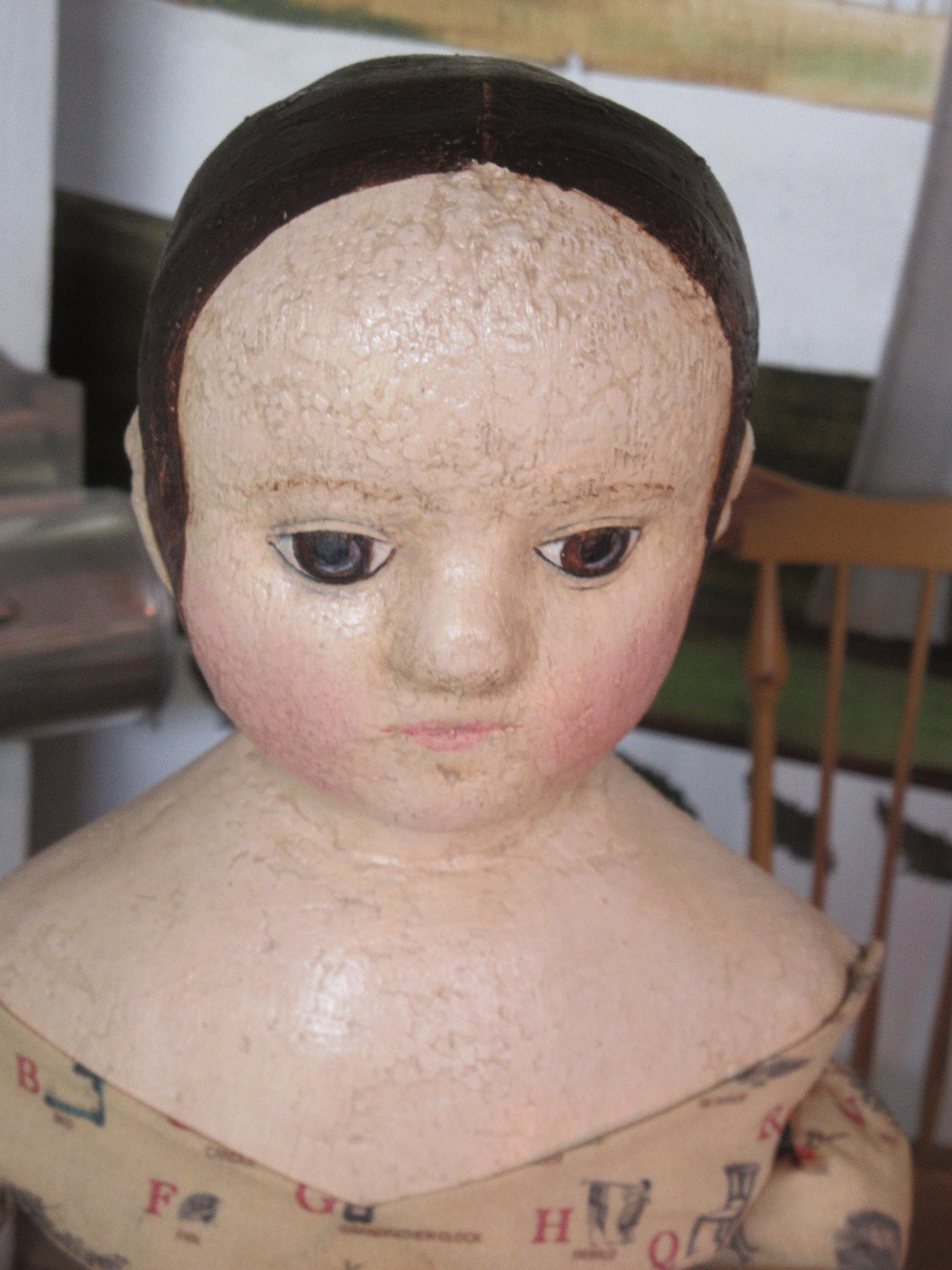 Both of this evening’s dolls have a special alphabet body covering or “second skin”. It seemed appropriate for autumn and the beginning of the school year. I’ve always been charmed by these illustrated letter prints, which are most commonly seen on antique china dolls. This fabric print is also some times known as an “educational print”, and if you search for them you will find quite a few different ones on the bodies of a variety of antique dolls.