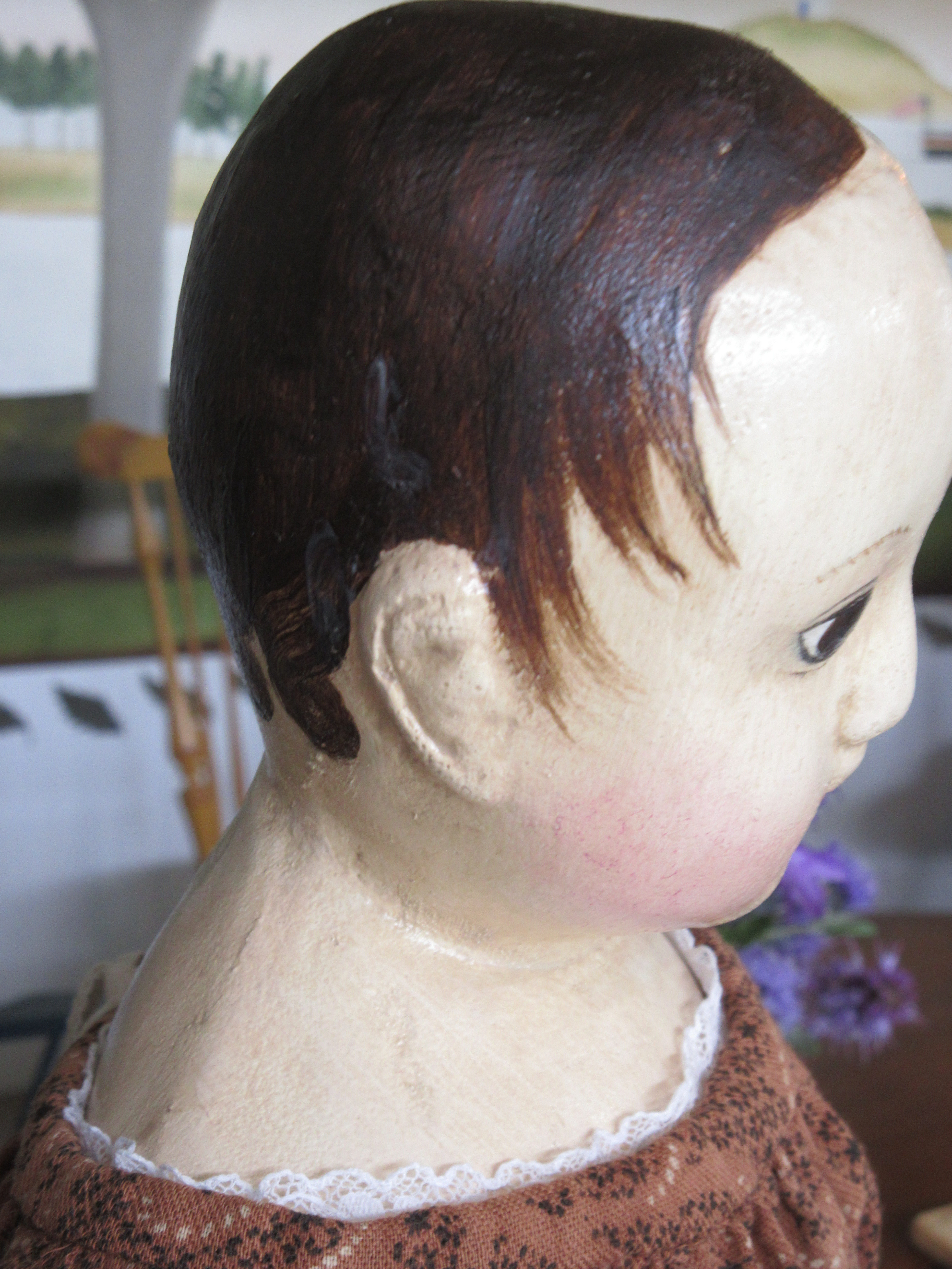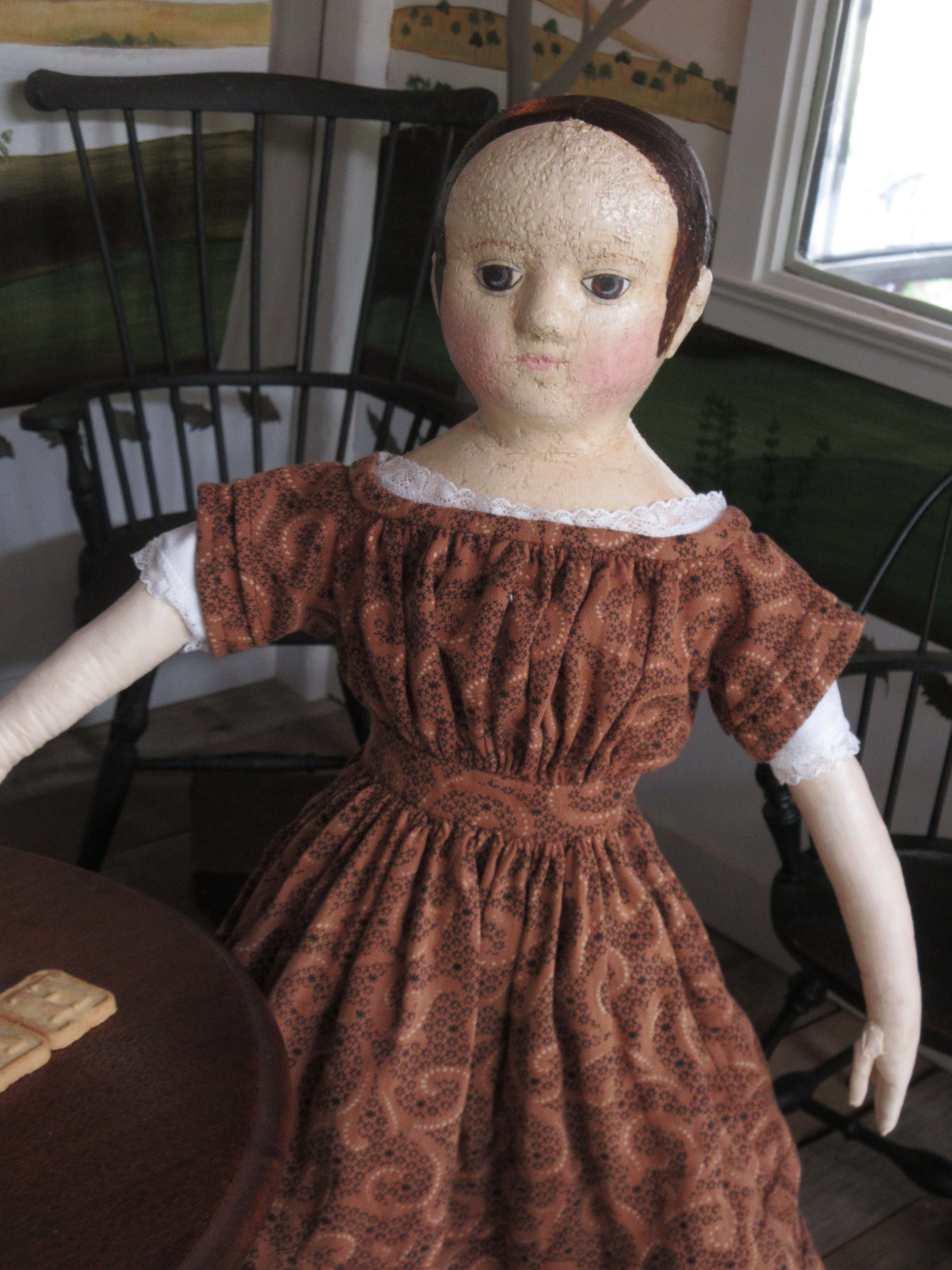 This Isane is approximately 18 inches tall. She comes fully dressed in a handmade chemise, pantalettes, petticoat and dress. Her brown print dress has extra fullness in the skirt and two graduated growth tucks. The sleeves of the dress are also tucked. All fabrics, lace and buttons are antique. PLEASE NOTE I am offering this doll for sale now, but it will take approximately a week to ten days for her to ship. Perhaps you noticed that she has two left arms! Sadly this is not the first time this has happened to me. When I started sewing her together I made the startling discovery that she didn’t have a right arm! lol So I am going to have to make her one and multiple coats of paint are going to have to dry before I can ship her.