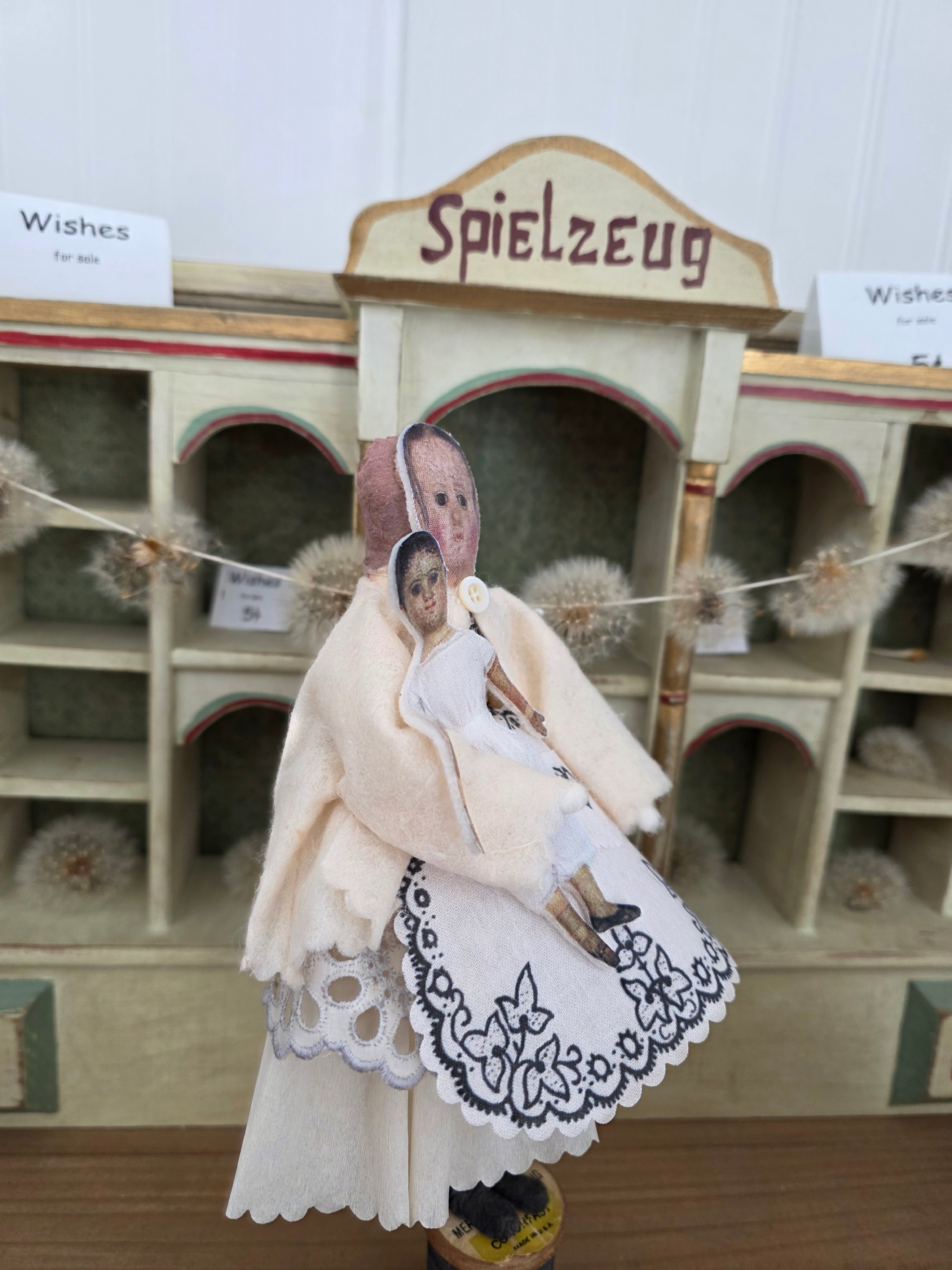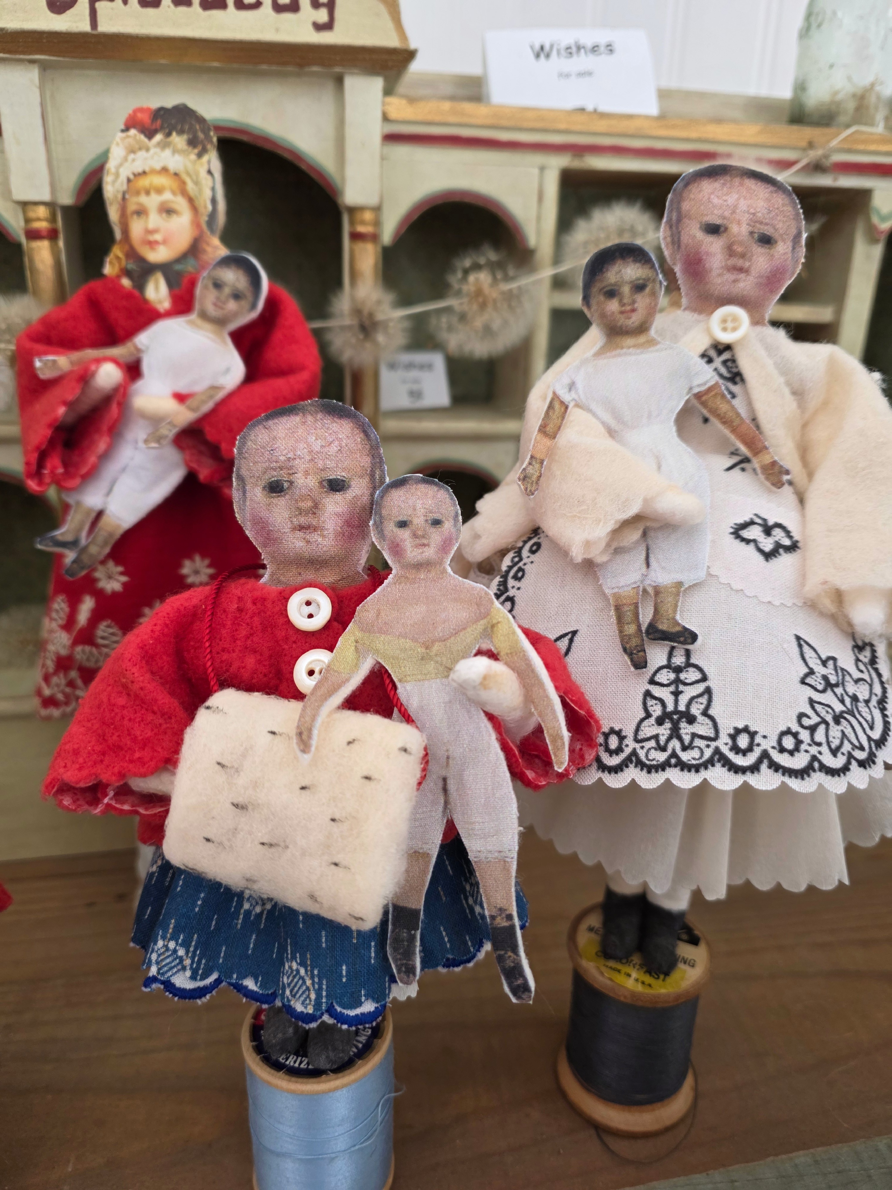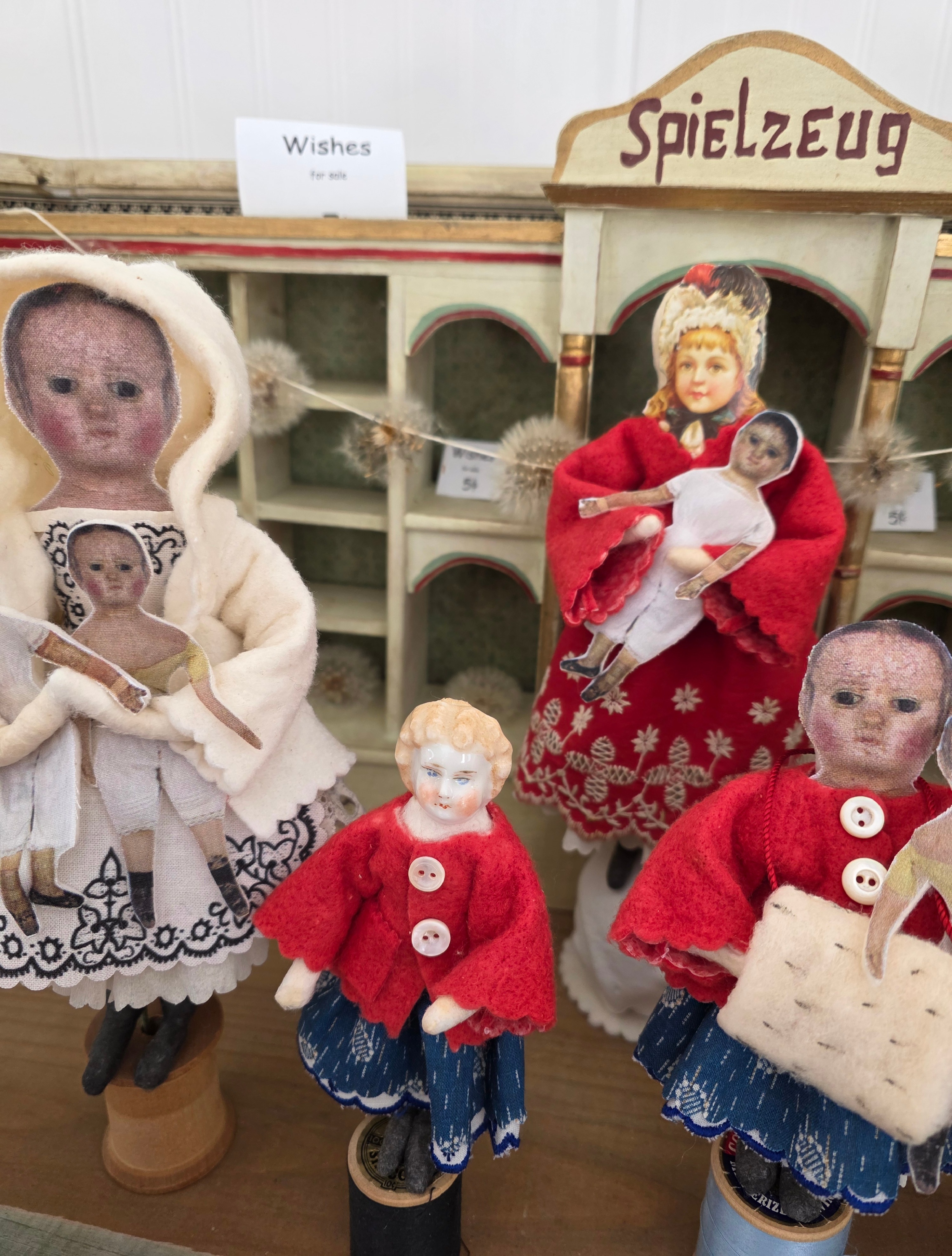 Zanna and Hannah want to welcome you to their tiny shop The Wish Emporium ❤ Tonight they have six Spun Cotton figures for sale. Each figure has a wire armature, with combed cotton fibers that have been hand spun around the armatures. Spun Cotton figures originated as a cottage industry in 19th century Germany. Each of these figures were created in the traditional way, then dressed in layers of vintage crepe paper, antique lace & buttons, plus cotton batting. They have a variety of different faces. Two of them have reproduction lithographed “scrap” paper faces which are very traditional. One has the remnent of a china doll’s head, that was salvaged from the trash pit of a German dollmaking factory, the others have newly custom printed cotton fabric faces that I designed and created using photographs of Isabeau & Zanna, the first two antique Izannah Walker dolls that became part of my antique doll collection. If you are a fan of my cut and stitch fabric doll panels you no doubt recognize them ❤