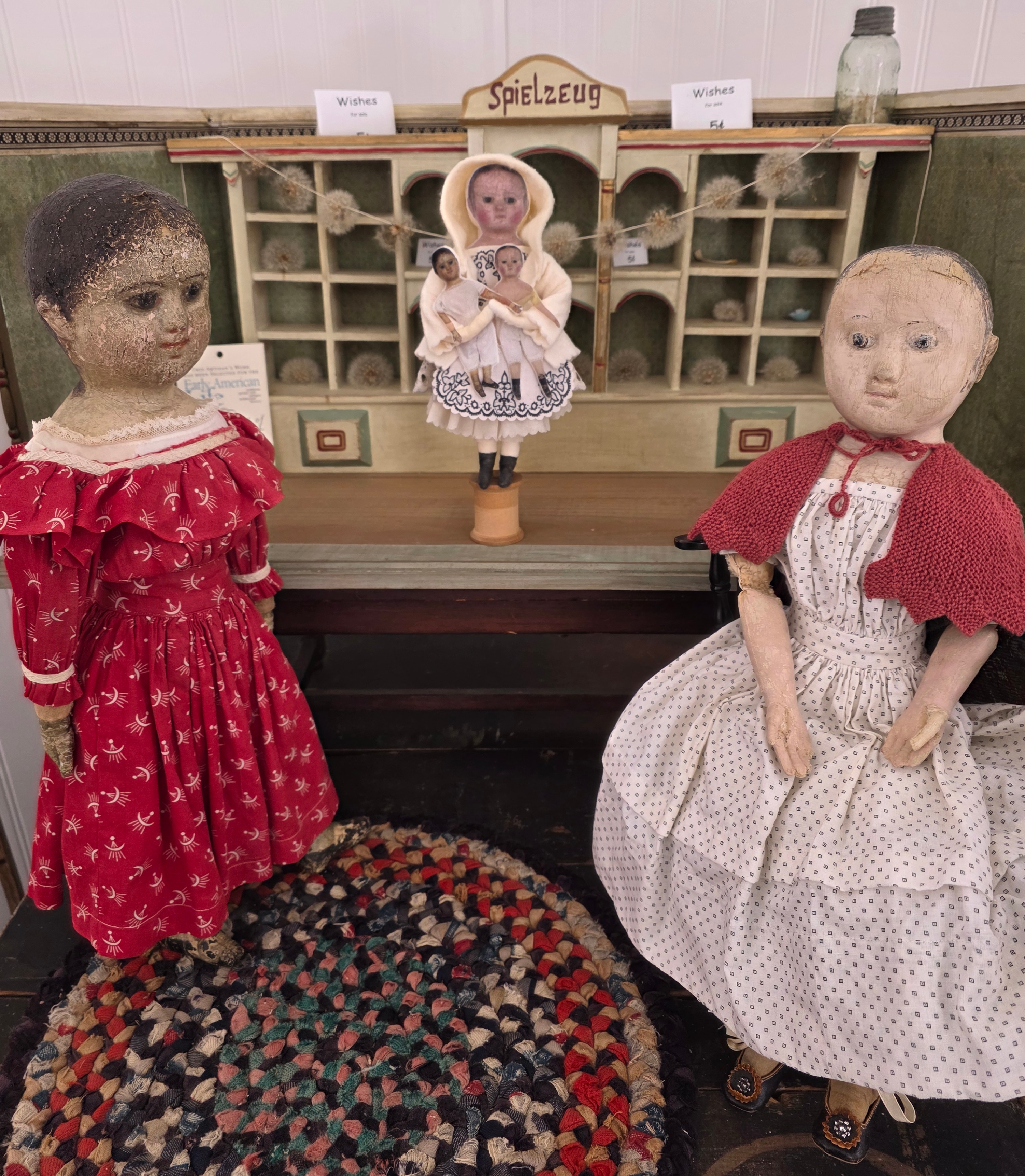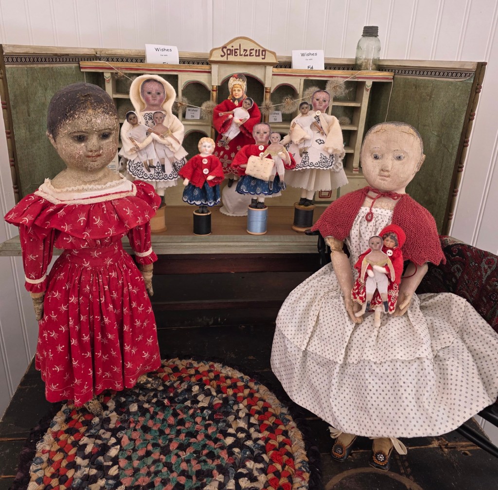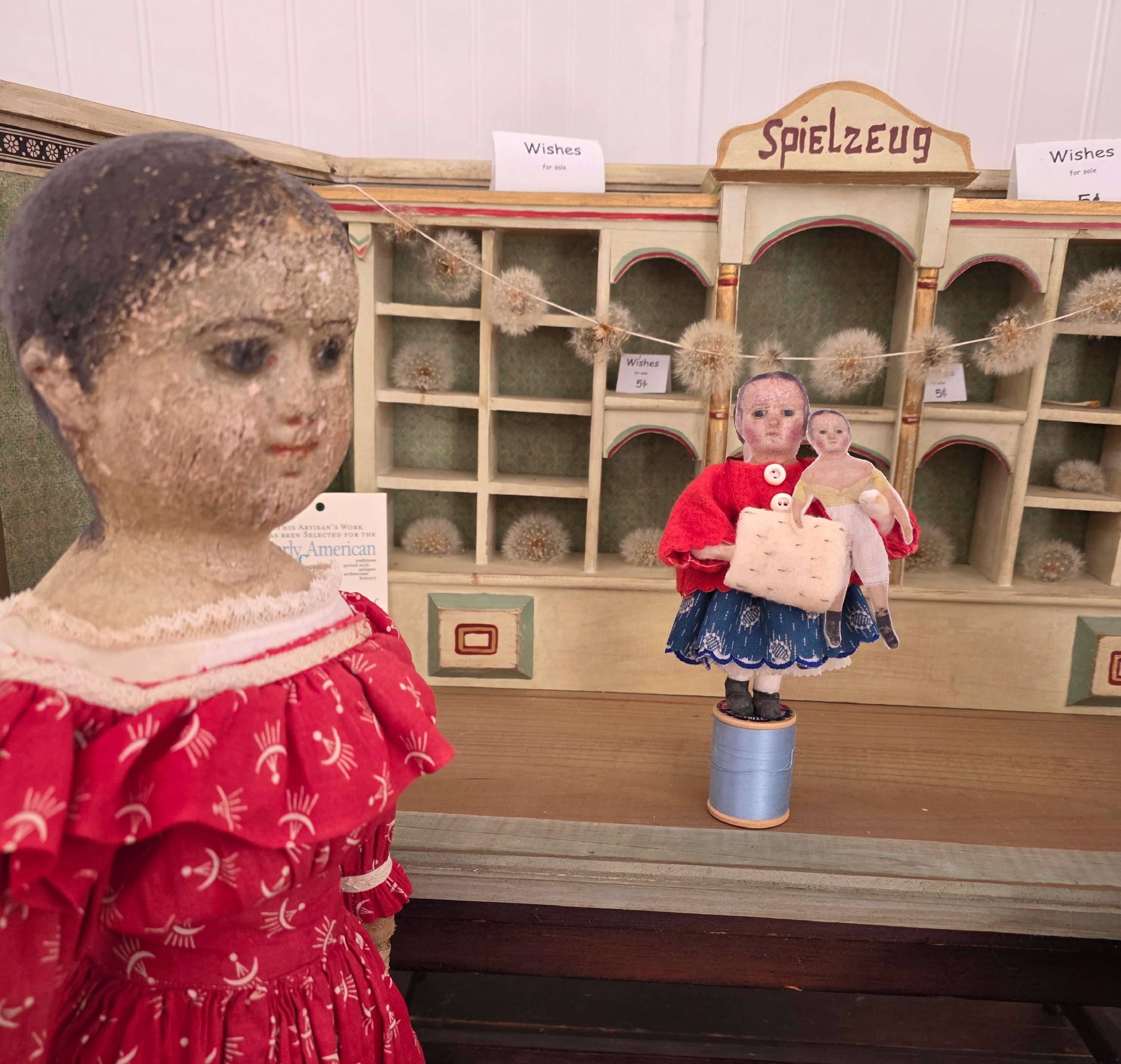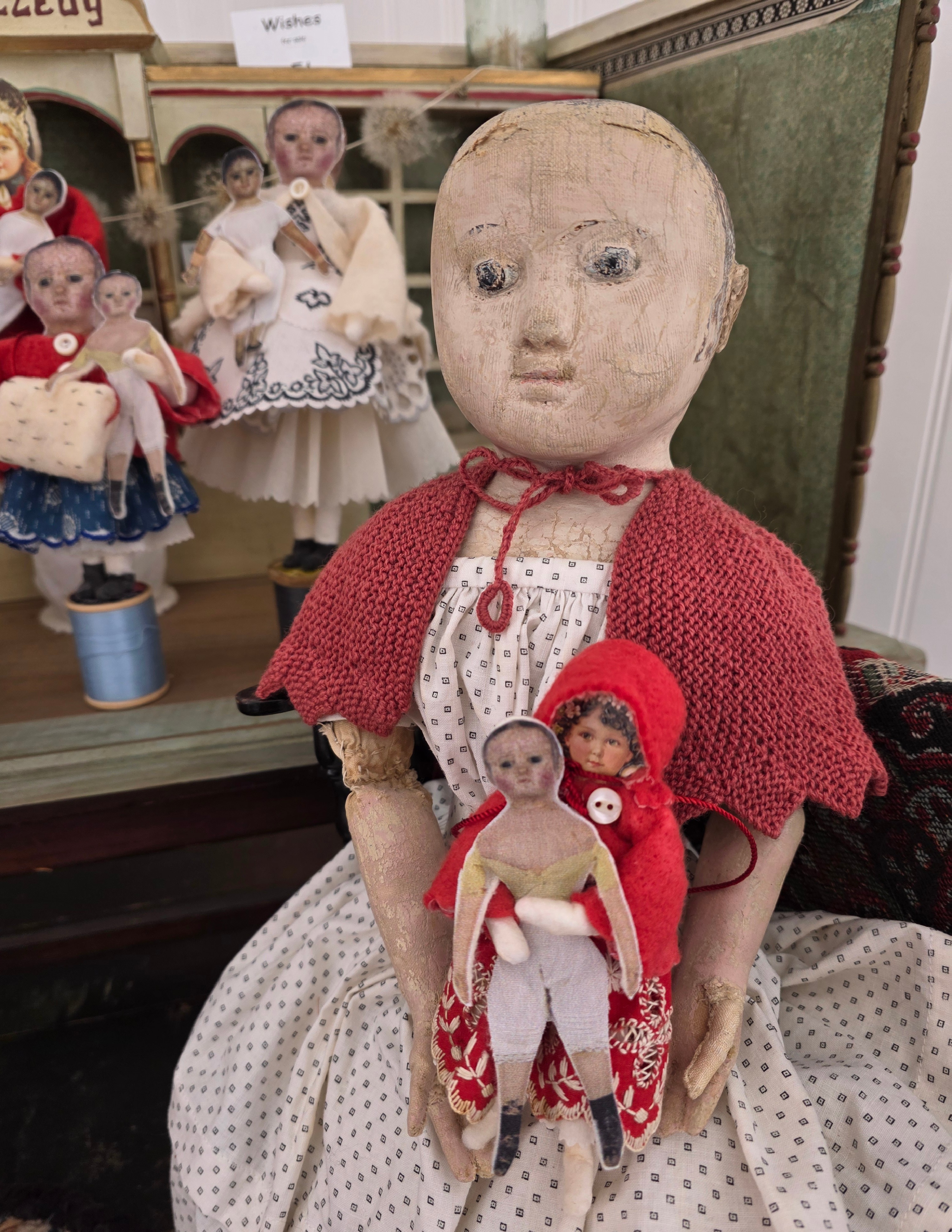 Zanna and Hannah want to welcome you to their tiny shop The Wish Emporium ❤ Tonight they have six Spun Cotton figures for sale. Each figure has a wire armature, with combed cotton fibers that have been hand spun around the armatures. Spun Cotton figures originated as a cottage industry in 19th century Germany. Each of these figures were created in the traditional way, then dressed in layers of vintage crepe paper, antique lace & buttons, plus cotton batting. They have a variety of different faces. Two of them have reproduction lithographed “scrap” paper faces which are very traditional. One has the remnent of a china doll’s head, that was salvaged from the trash pit of a German dollmaking factory, the others have newly custom printed cotton fabric faces that I designed and created using photographs of Isabeau & Zanna, the first two antique Izannah Walker dolls that became part of my antique doll collection. If you are a fan of my cut and stitch fabric doll panels you no doubt recognize them ❤