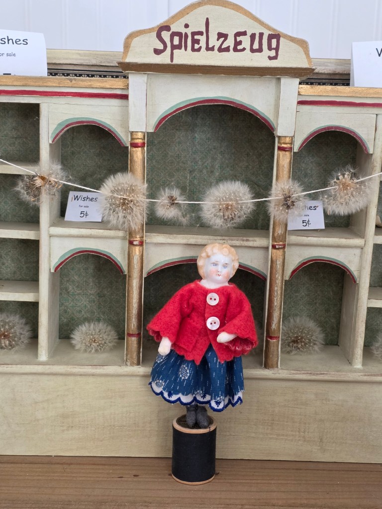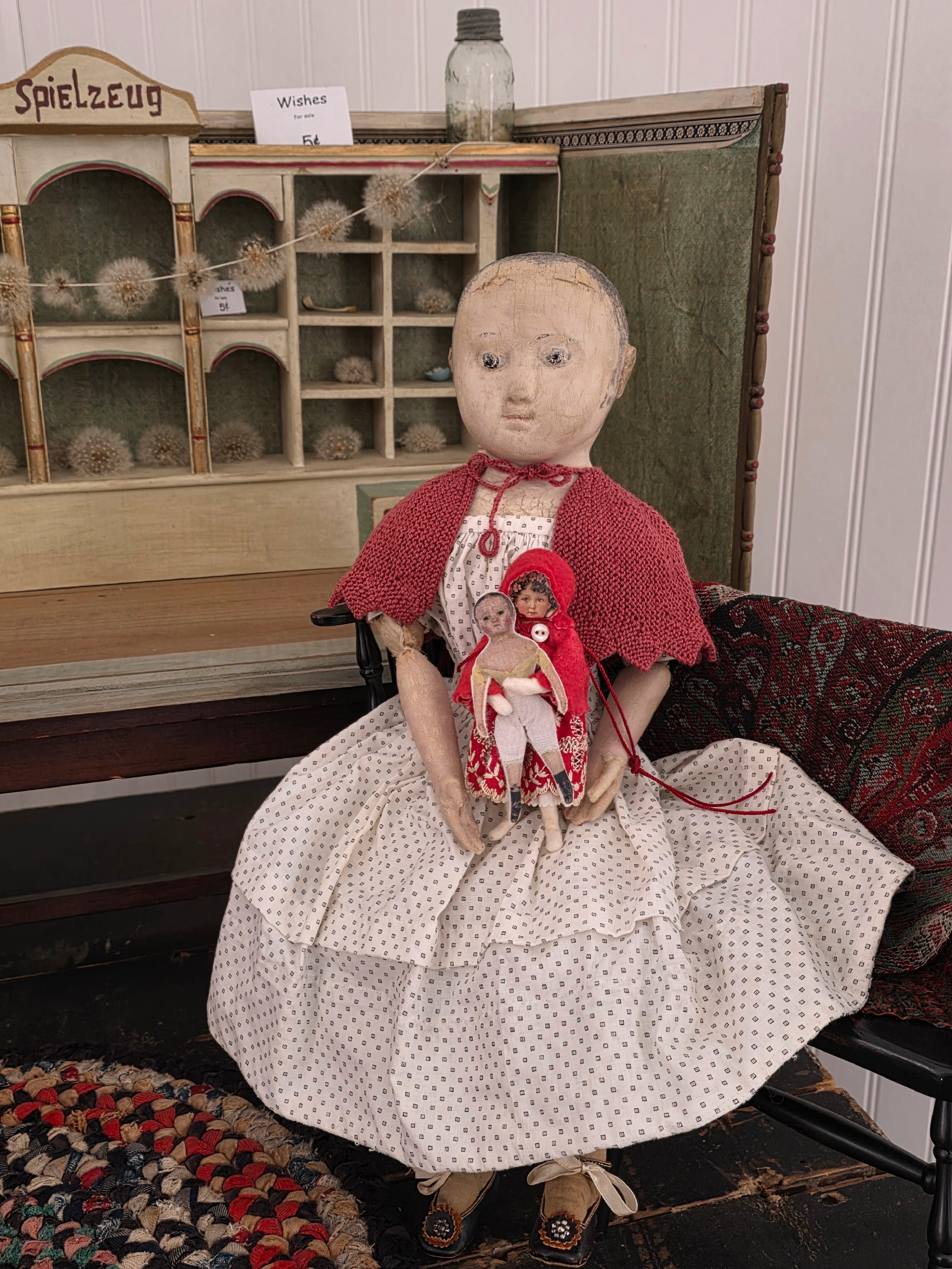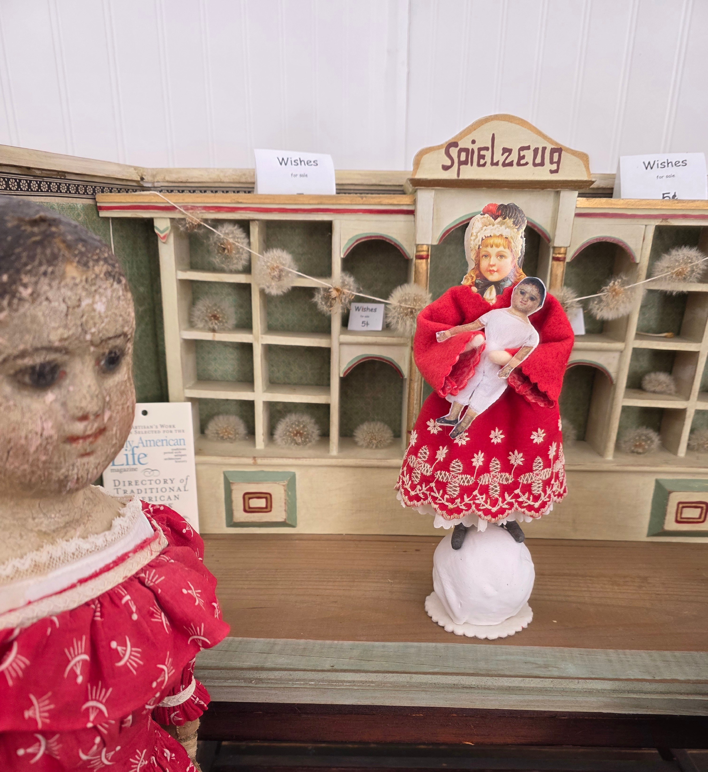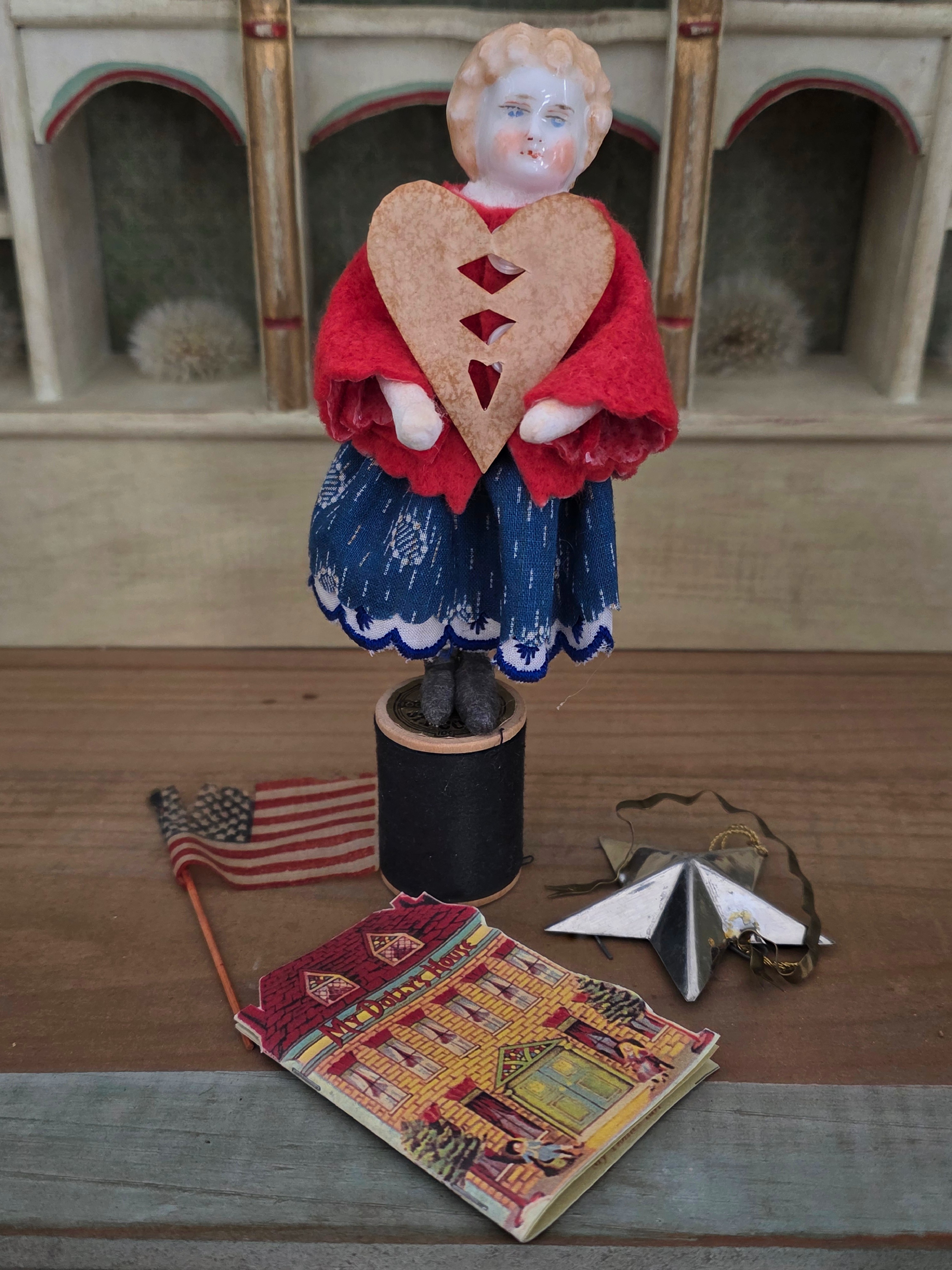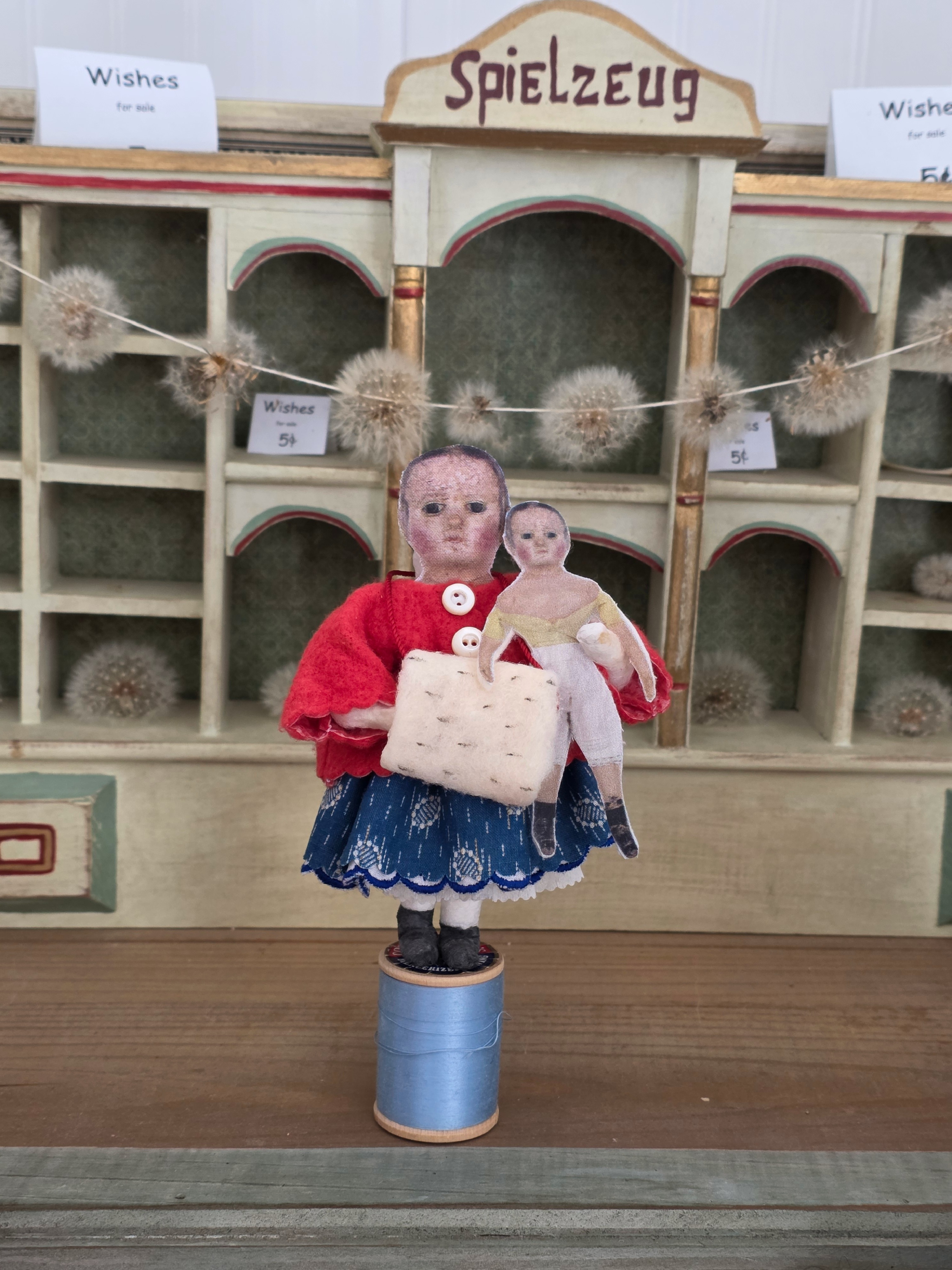 3. Spun Cotton Girl with Antique China Face mounted on an Antique Spool of Thread ~ total height 6.5 inches. A small spun cotton girl with an antique blonde china doll face. Dressed in a red hand dyed paletot, blue embroidered antique eyelet petticoat and antique indigo blue fabric skirt. Mounted on a spool of black antique Star thread. $110, plus shipping.