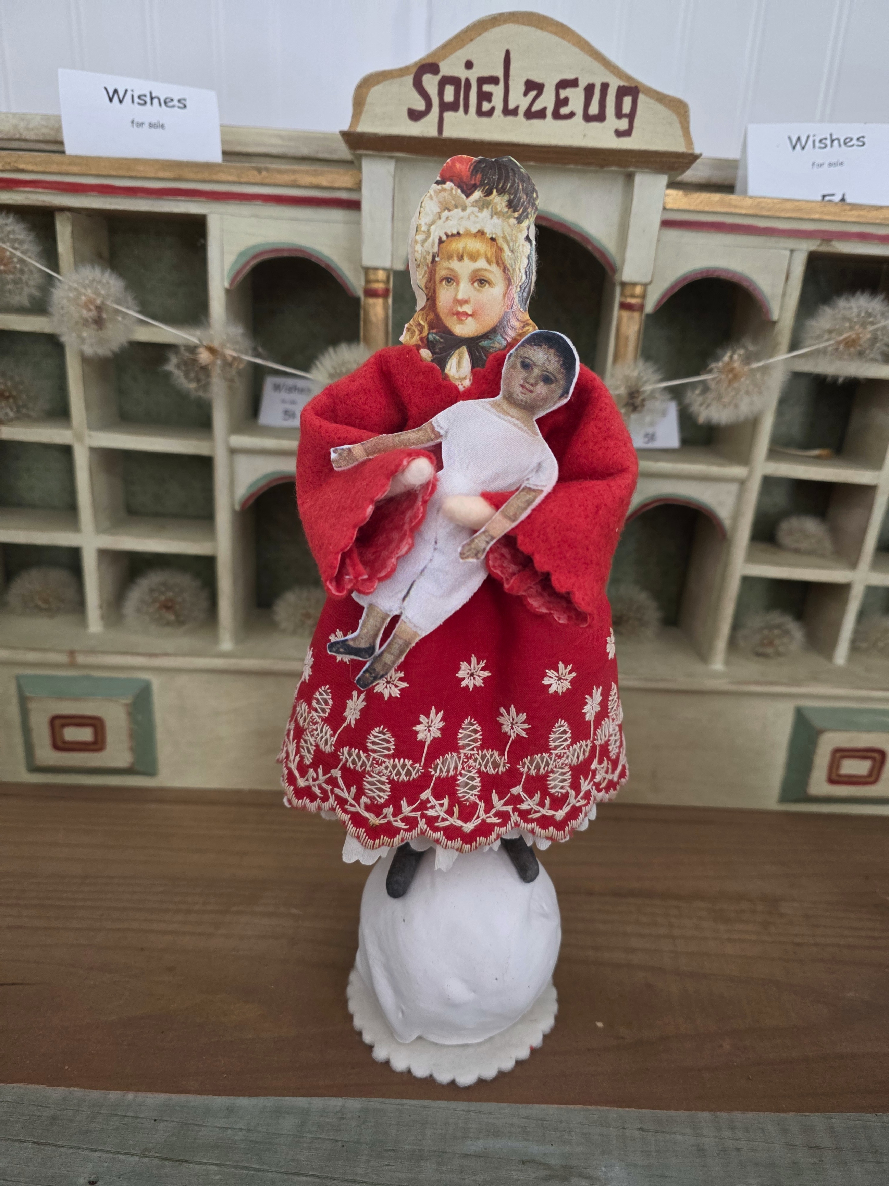 4. Lithographed Face Spun Cotton Girl Dressed in Red mounted on a Plaster Snowball ~ 11.5 inches over all. She is wearing vintage crepe paper pantalettes & petticoat, a skirt made from antique red eyelet, and a paletot fashioned from hand dyed cotton batting. She has fi her cotton Zanna firmly clasped in her arms. $155, plus shipping.