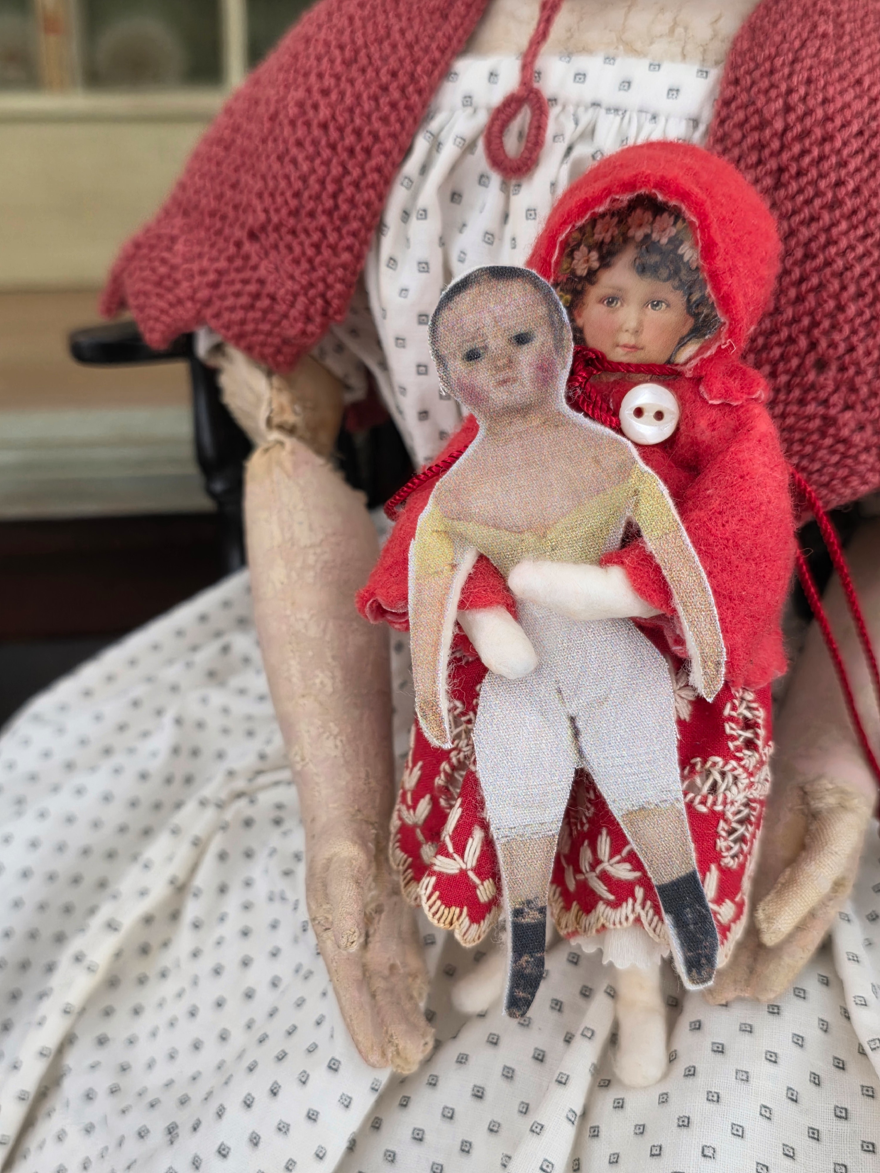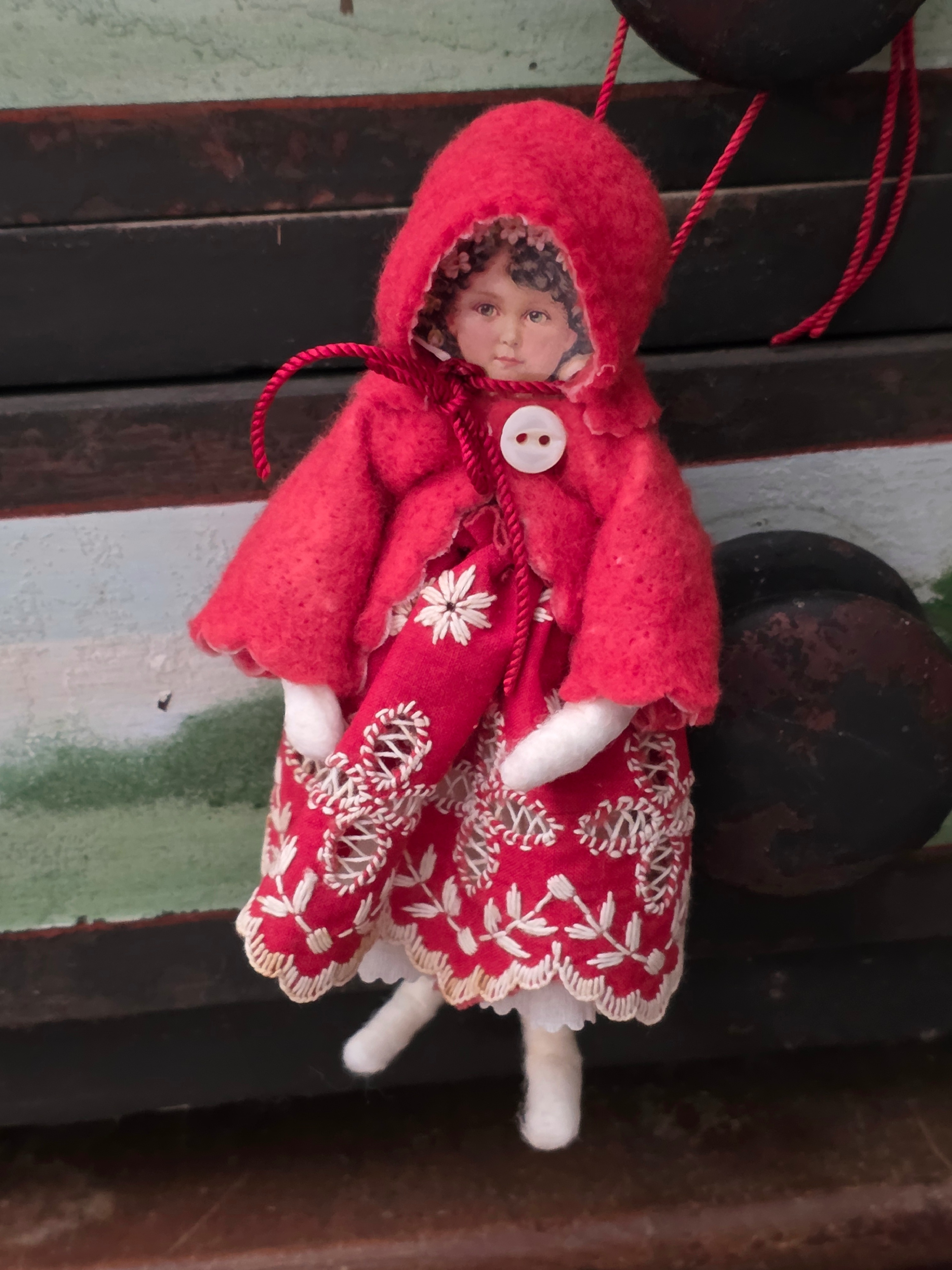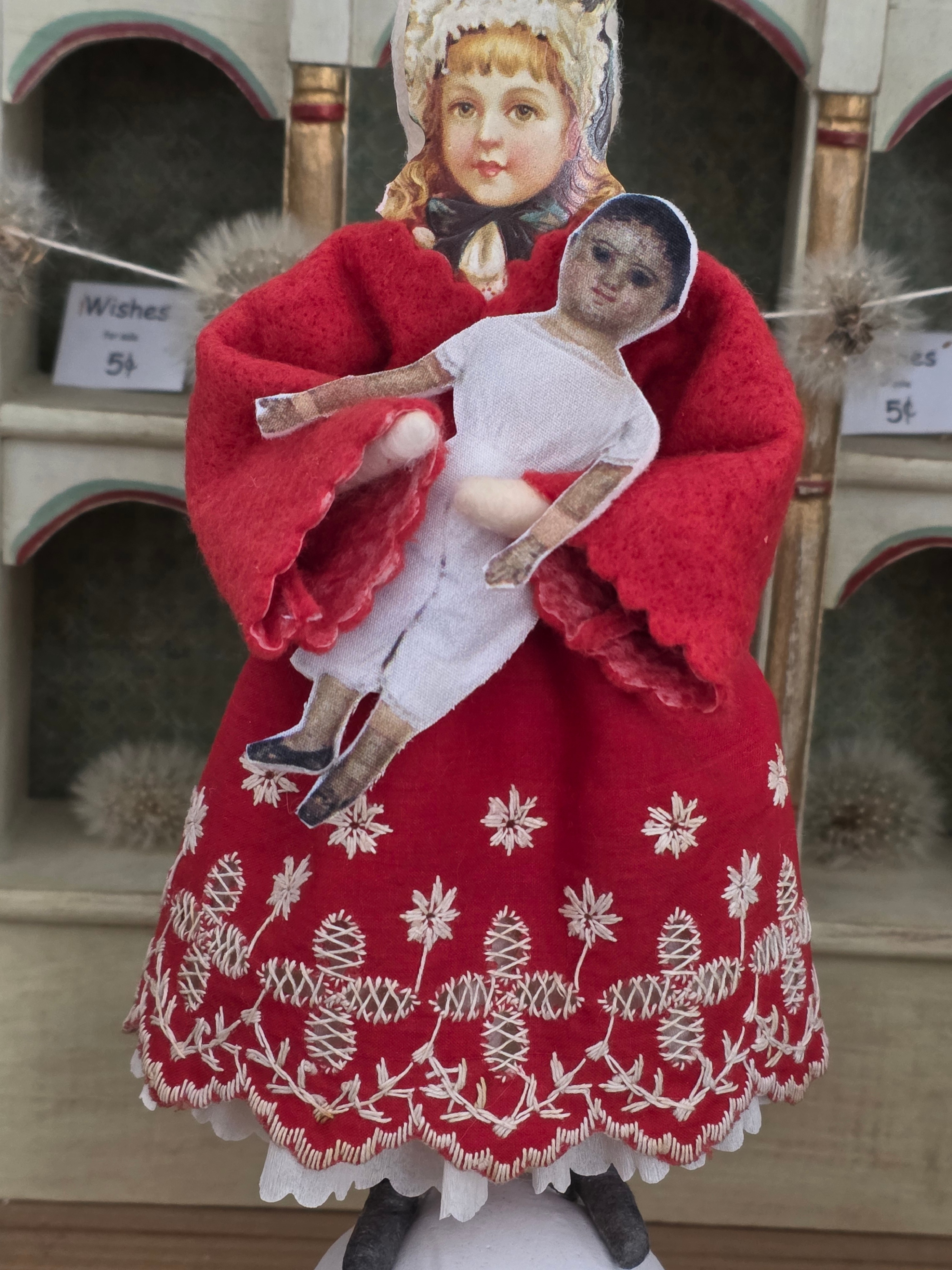 - Red Spun Cotton Girl with Lithographed Scrap Face ~ 5 inches tall, vintage crepe paper petticoat, red antique embroidered eyelet, hand dyed cotton batting paletot (this style of 19th c.outerwear) and tiny red batting handmade bonnet. She has a antique red cord attached for hanging, which you can shortened to your desired length. In her arms she has a tiny cloth Zanna that is backed with cotton batting. She would be wonderful on a Christmas tree, or hanging from the knob on a cupboard door. $87, plus shipping.