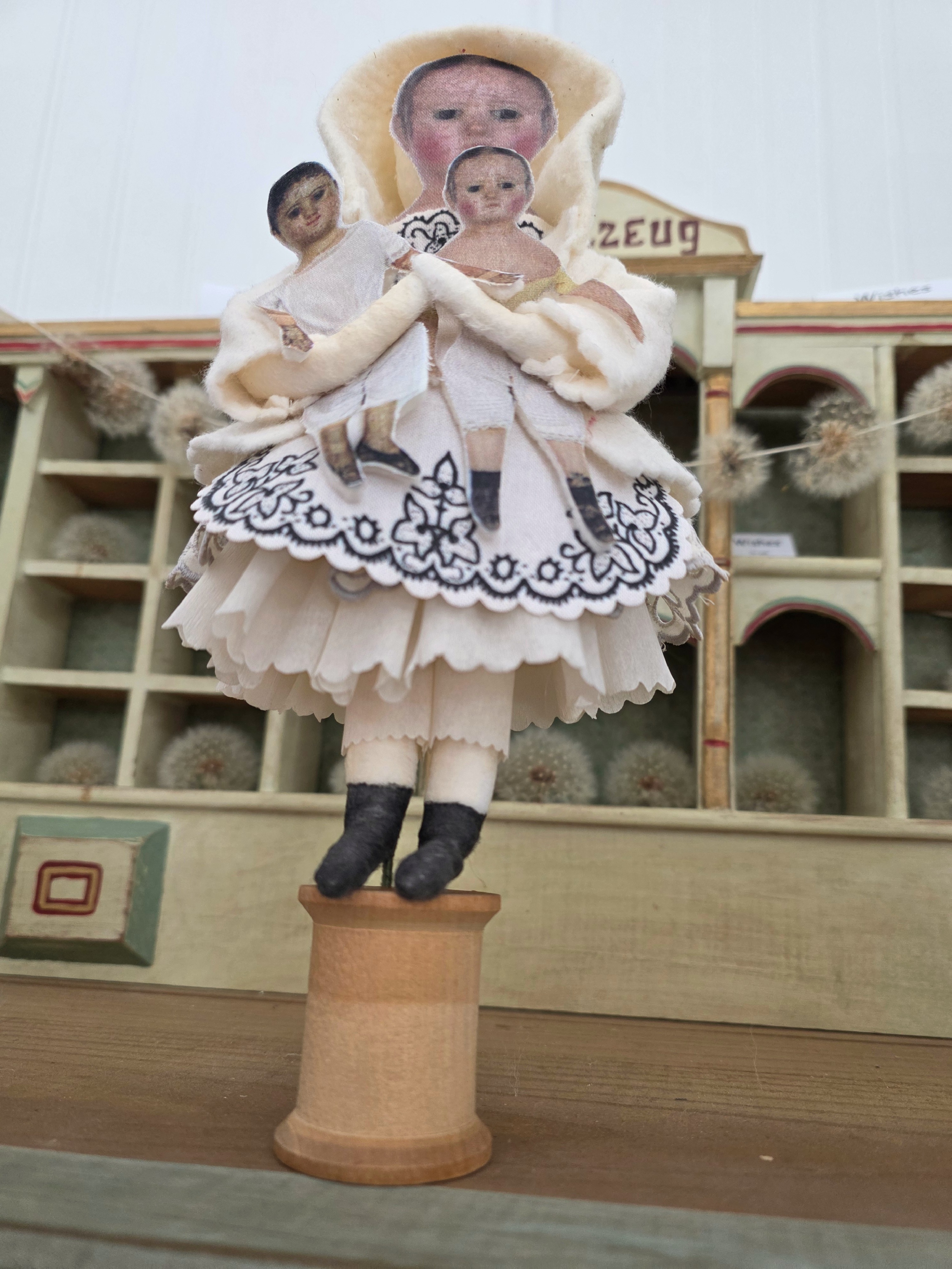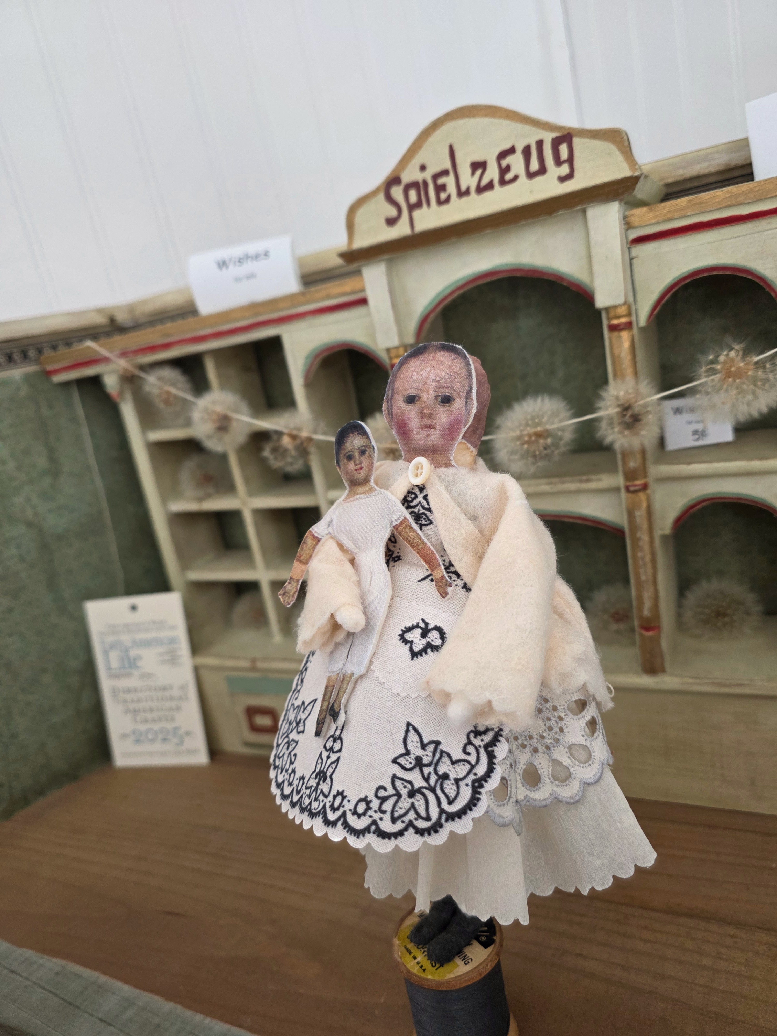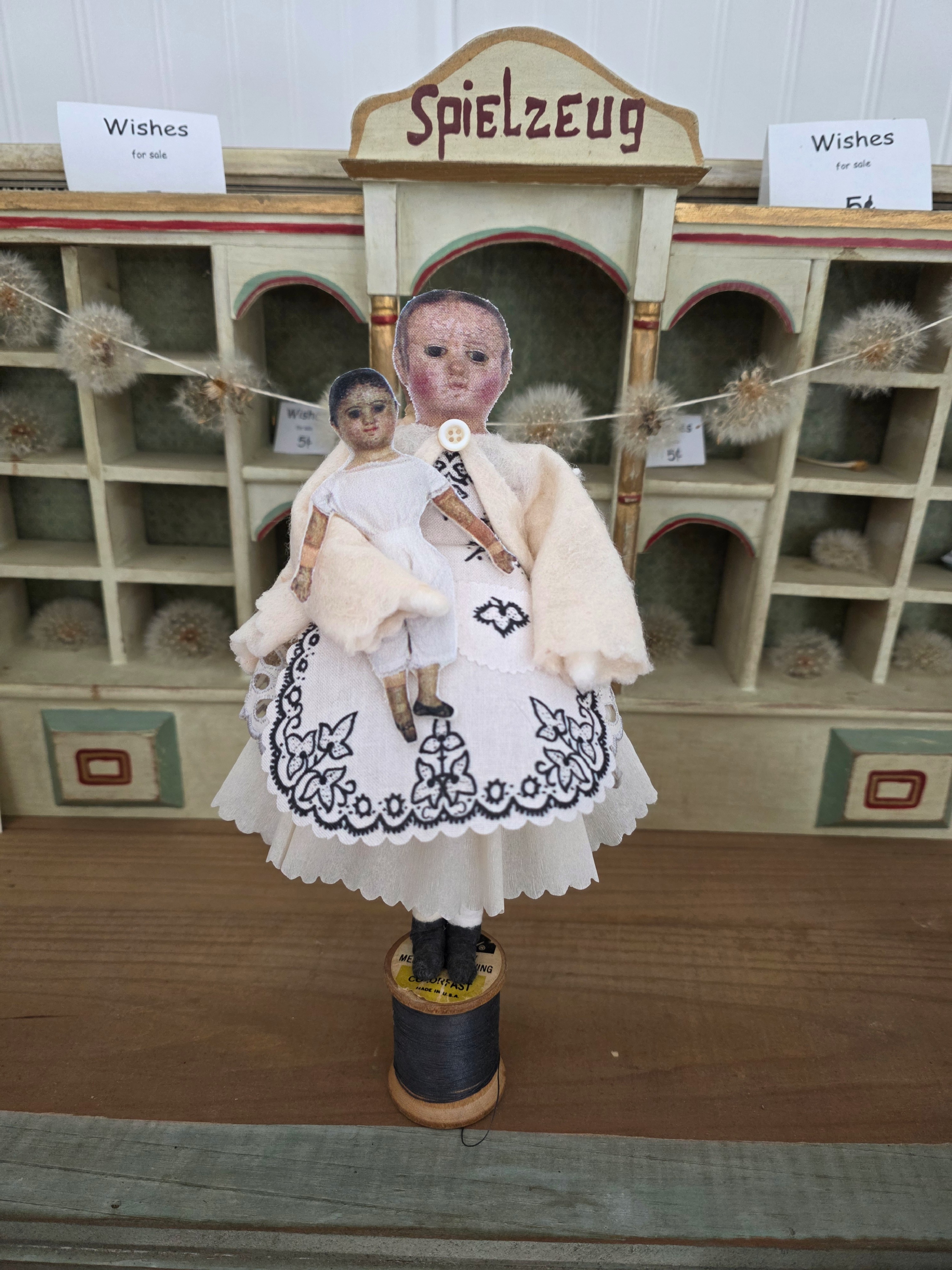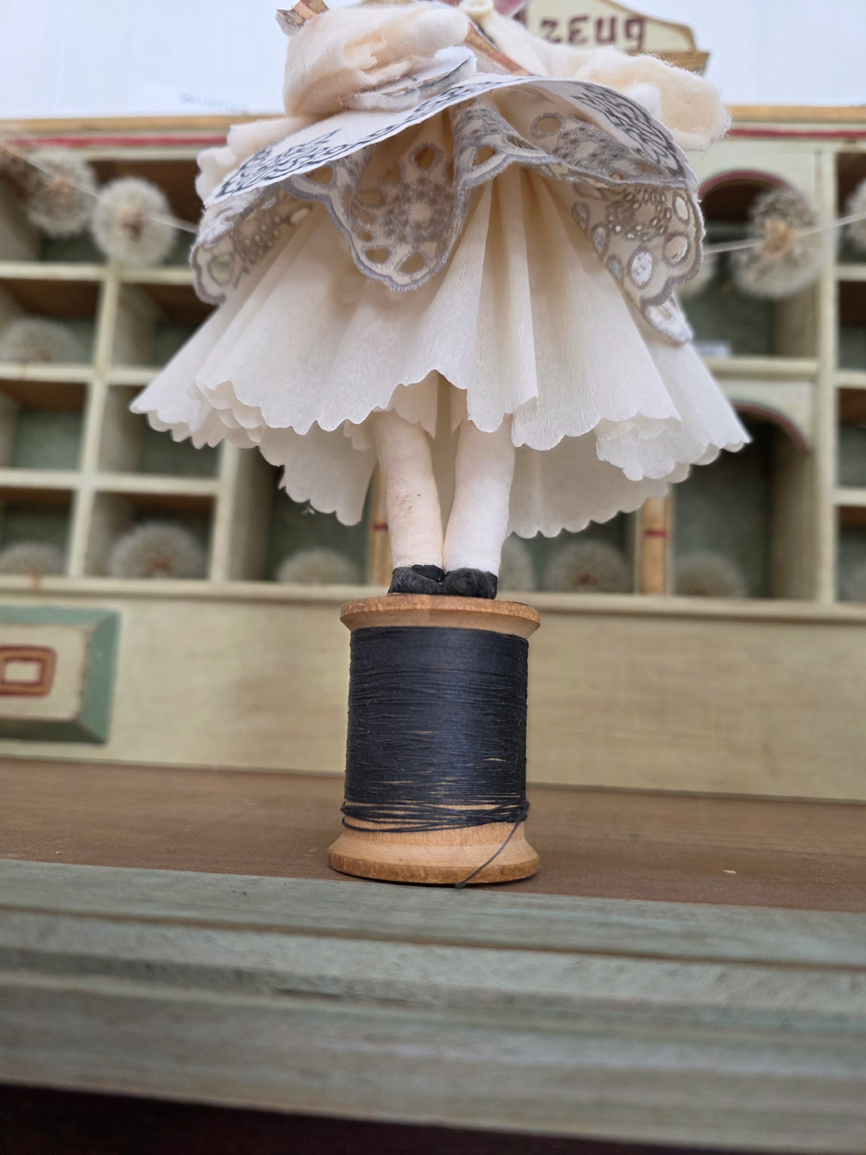 5. All White Spun Cotton Isabeau with Tiny Zanna Standing On An Antique Wooden Thread Spool. ~ 9.75 inches overall. She has a printed cotton face and is wearing vintage crepe paper pantalettes and petticoat. Over her crepe paper unmentionables she wears a skirt of antique pale gray embroidered whilte eyelet and a printed version of an antique pinner apron, plus a cotton batting paletot. Her dearest dolly is a cotton printed Zanna. She is standing on an antique black wooden thread spool. $165, plus shipping