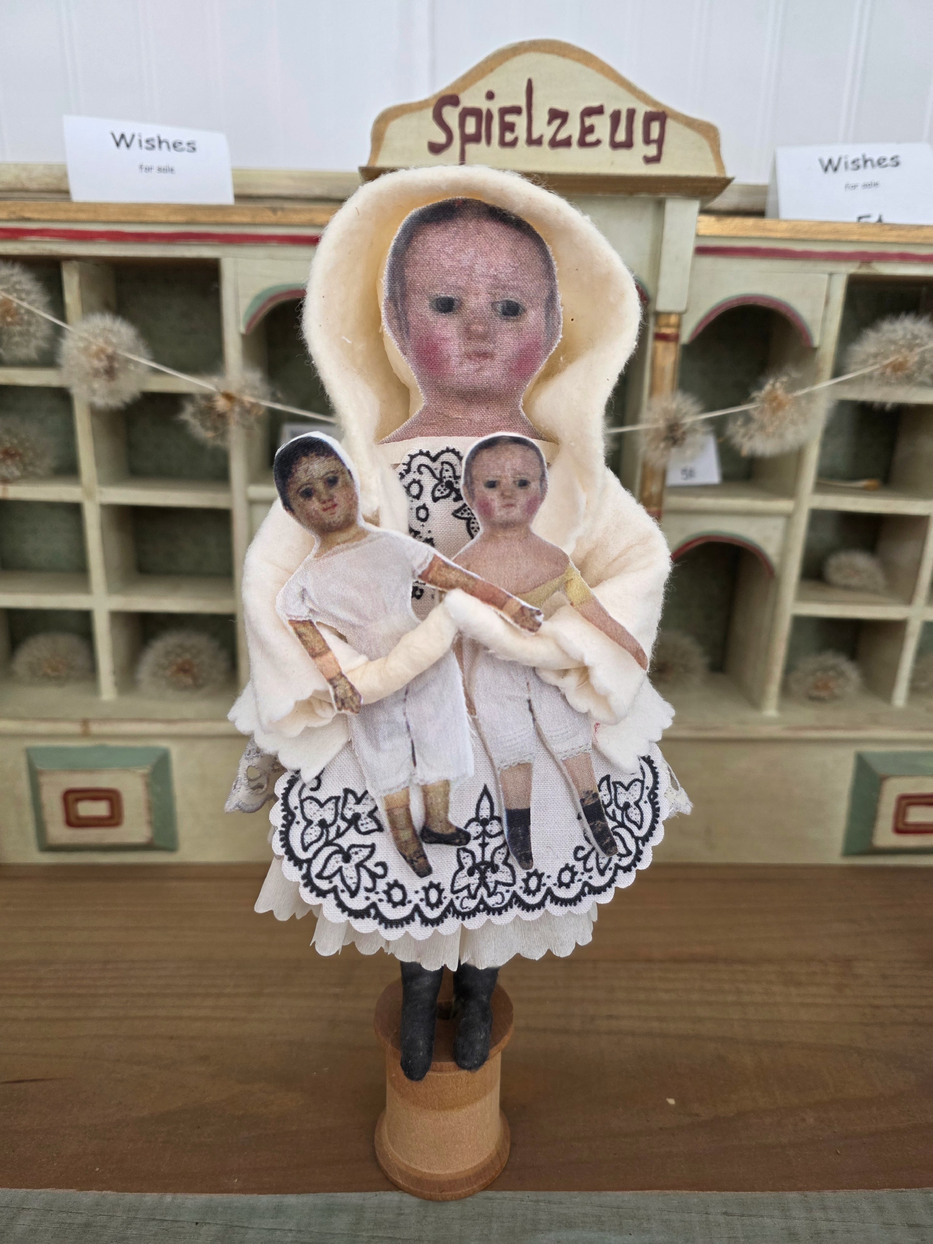 6.SOLD All White Spun Cotton Isabeau w Hood and 2 Little Izzies ~ 10 inches overall. She has a printed cotton face and is wearing vintage crepe paper pantalettes and petticoat. Over her crepe paper unmentionables she wears a skirt of antique pale gray embroidered whilte eyelet and a printed version of an antique pinner apron, plus a hooded cotton batting paletot. She stands on an empty antique wooden thread spool. In her arms she is carrying tiny printed cotton versions of both Zanna and Isabeau that are backed with cotton batting. $175.00, plus shipping
