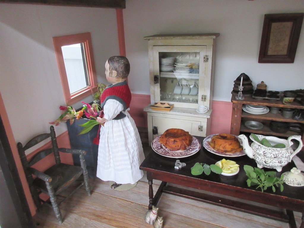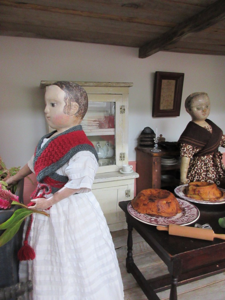 The dolls are all rushing around with last minute party preparations, Isane and Ismay are in the kitchen, along with their dearest friend Prudence, who came early to help. Isane is arranging all of the freshly cut garden flowers, and Ismay is making the Sage Tea while the Birthday Puddings cool. The tea is from their grandmother’s receipt book and one of their favorite teas. Prudence has volunteered to read them some poetry to keep them amused while they work. ❤