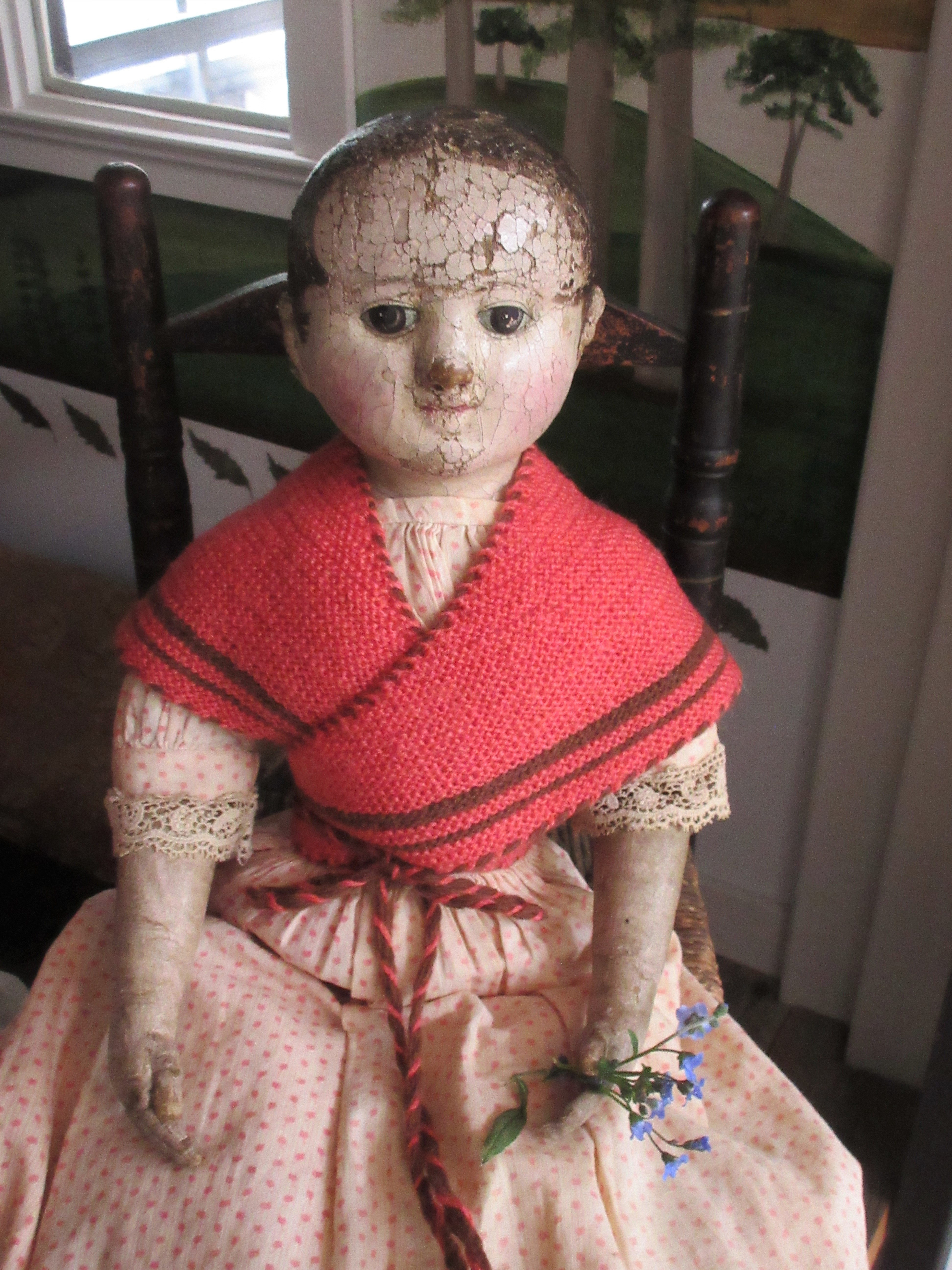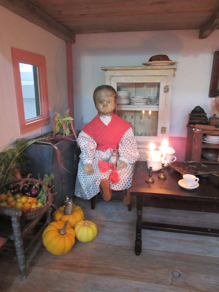 The dolls and their girl did indeed have a wonderful party, where there were a great deal of flowers, paper dolls hung up on bright red string, sweet treats galore, stories read, and yes ~ a special present for them all to play with! A Hitty doll and her book!!! All the little girls, both cloth and real, are looking forward to playing with their present. ❤