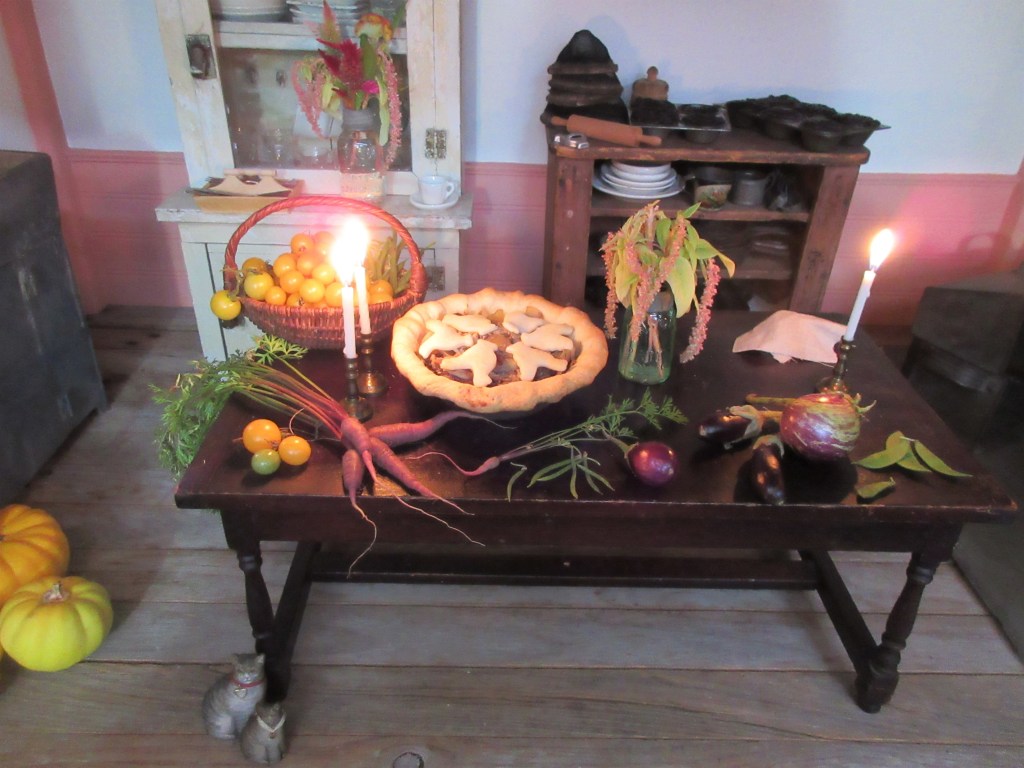 Before this evenings invited guests arrived Tilly Lamb and Isabeau cooked a delicious birthday dinner. They made a huge chicken and mushroom pie, then prepared all the wonderful vegetables that the dolls purchased at the Thyme Forgotten Farm Stand on Thursday, when they did their marketing. They are hoping that their younger sisters and friends will eat something healthy for dinner, before they have their midnight snack of sweets!
