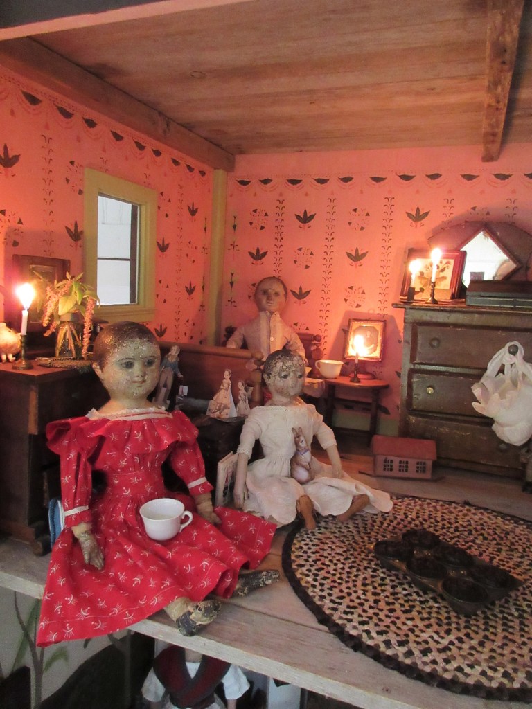 It’s been a very busy Saturday here in the doll’s house. All the little cloth girls were up very early, excitedly chattering away about who they needed to take a May Basket to, what to put in the baskets, and most importantly ~ how to keep from being seen after they left the basket on the doorstep and knocked on the door!