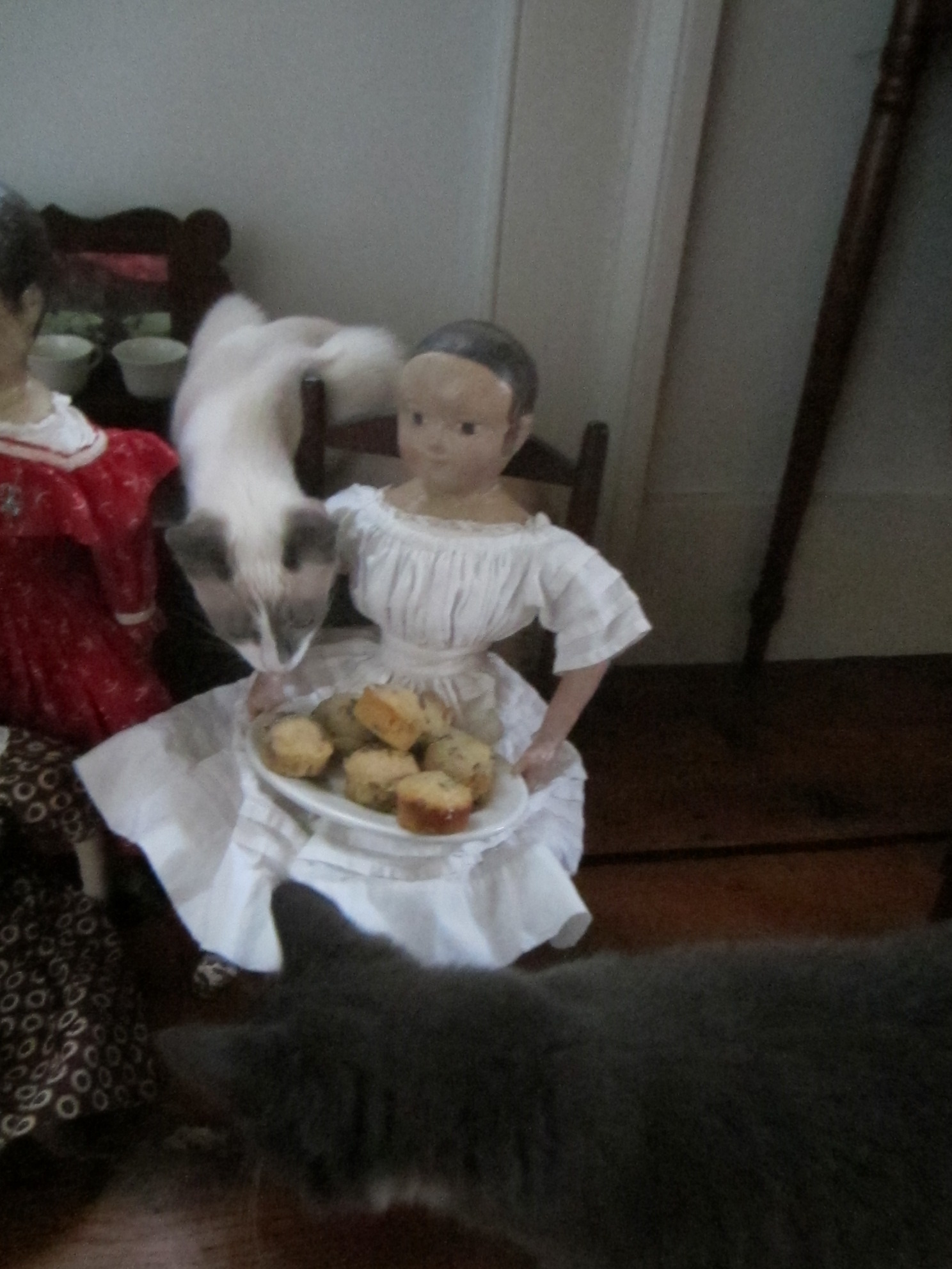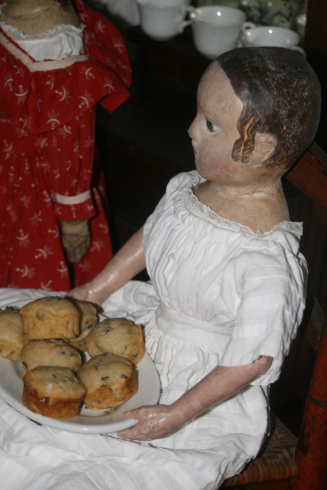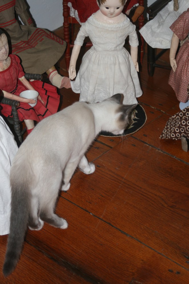 A large scoop of Earl Grey tea, lavender flowers and a pinch of ground vanilla beans… total bliss!“Welcome!” “We are so glad you could come!”“Have you met our dear friend Lily? She just moved from Toledo to Michigan and now she has come to pay us a visit.” ” Sharon’s doll is also visiting us. We are so happy she could stay for the party!”“Does everyone have a seat?” “I’m going to go get the tea. I’ll be right back!”“This is Sadie, one of our new kittens.” “Izzybelle, be careful! Don’t let Sadie knock you off of the piano stool!” “Don’t worry Isane, I’m holding on tight!”“Here comes Jack. He follows Sadie everywhere!”Jack very much wants to play with Billie’s doll, who is another one of our party guests.“Would you care for a Honey Tea Cake?”“No Jack, not you!” “Tea cakes aren’t good for kittens.”“Isane don’t let them get the cakes!”“That’s right Jack, go see Anna, she’ll pet you.” “Petting is much better than cake!”” Sadie, I’ll pet you too.”“Now that the kittens have settled down, would anyone like a cup of tea?”“Oh no! Lily did Jack knock your cup out of your hand?”“Don’t worry. Nothing broke and I have a clean cup right here for you.”Too much excitement! The kittens are all worn out and have gone off to take a nap…“I would really like that cup of tea now!” “And I’d like a bit of quiet, civilized conversation!” “Well I LIKE having the kittens come to tea! It makes everything so much more interesting!” “Hush Izzybelle…”“I know what we should do. Have you seen Joy Harrington’s article in Antique Doll Collector magazine? It’s all about the house she had made for her Izannah Walker dolls.” “You can tell Billie all about it when you go home to Kansas.” “I think next year we should ask for a house of our very own as a birthday present!”“Cake? “I don’t know anything about cake.” “Or falling teacups…” “You must be thinking about some other kitten.” “Yawnnnnnnnnn”