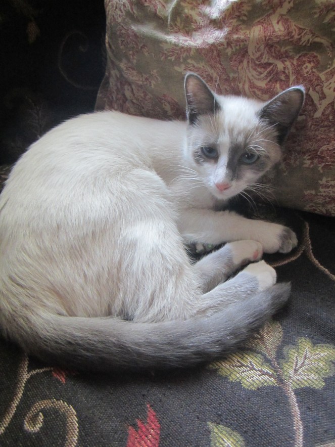 Apparently not only American women, but small cats have a fondness of cloth. Sadie was captivated by the fabric of this antique baby dress ❤