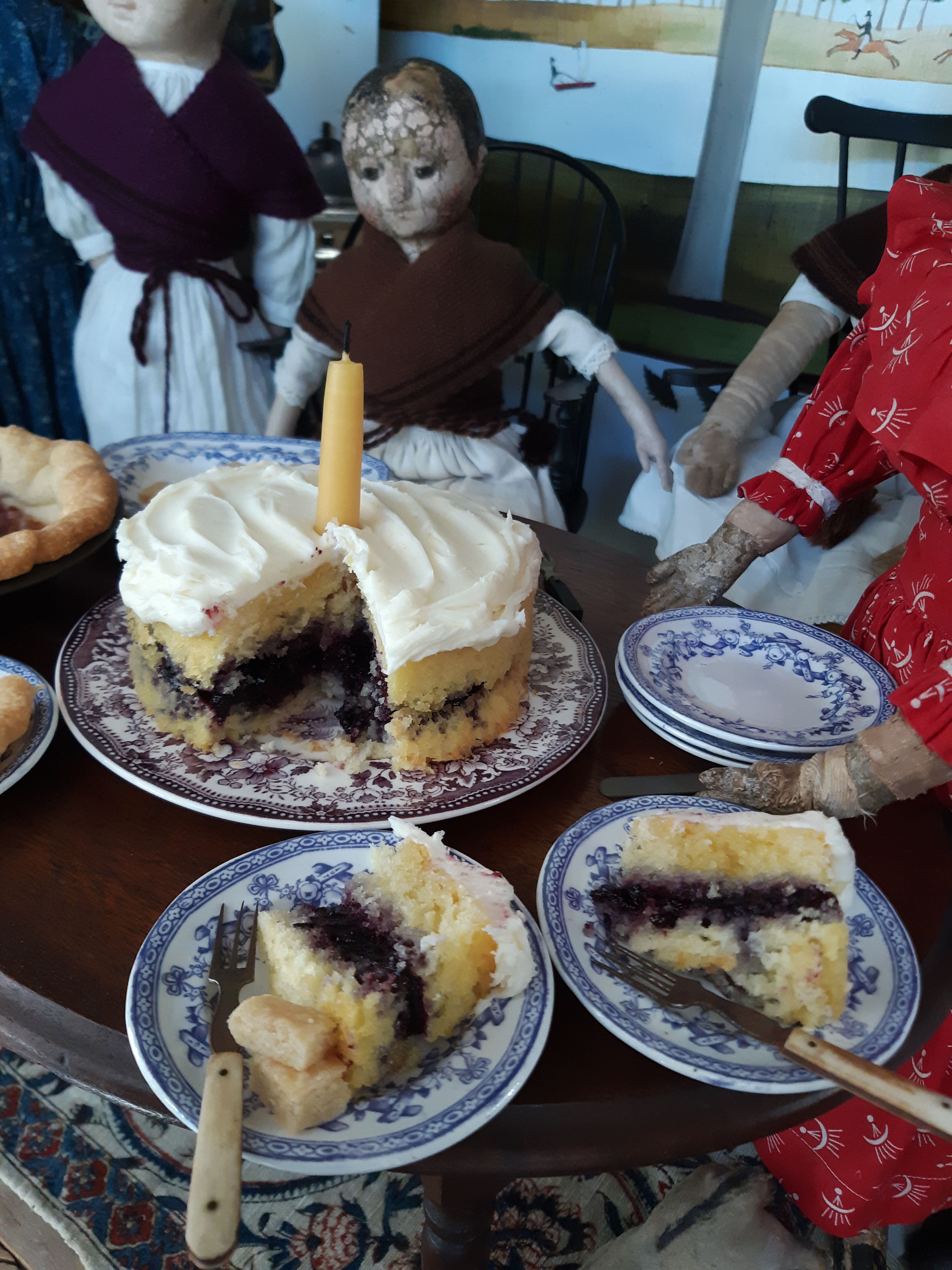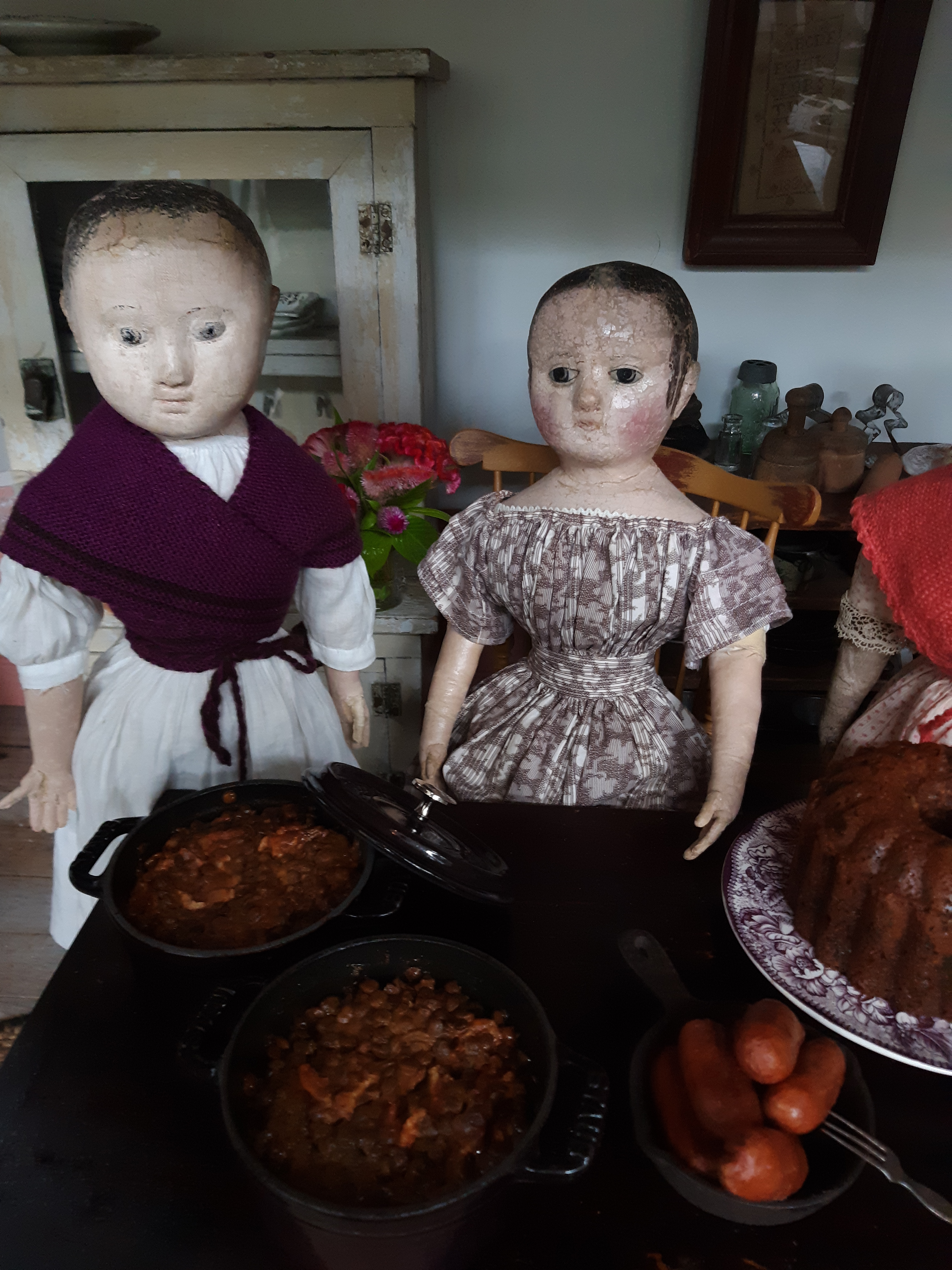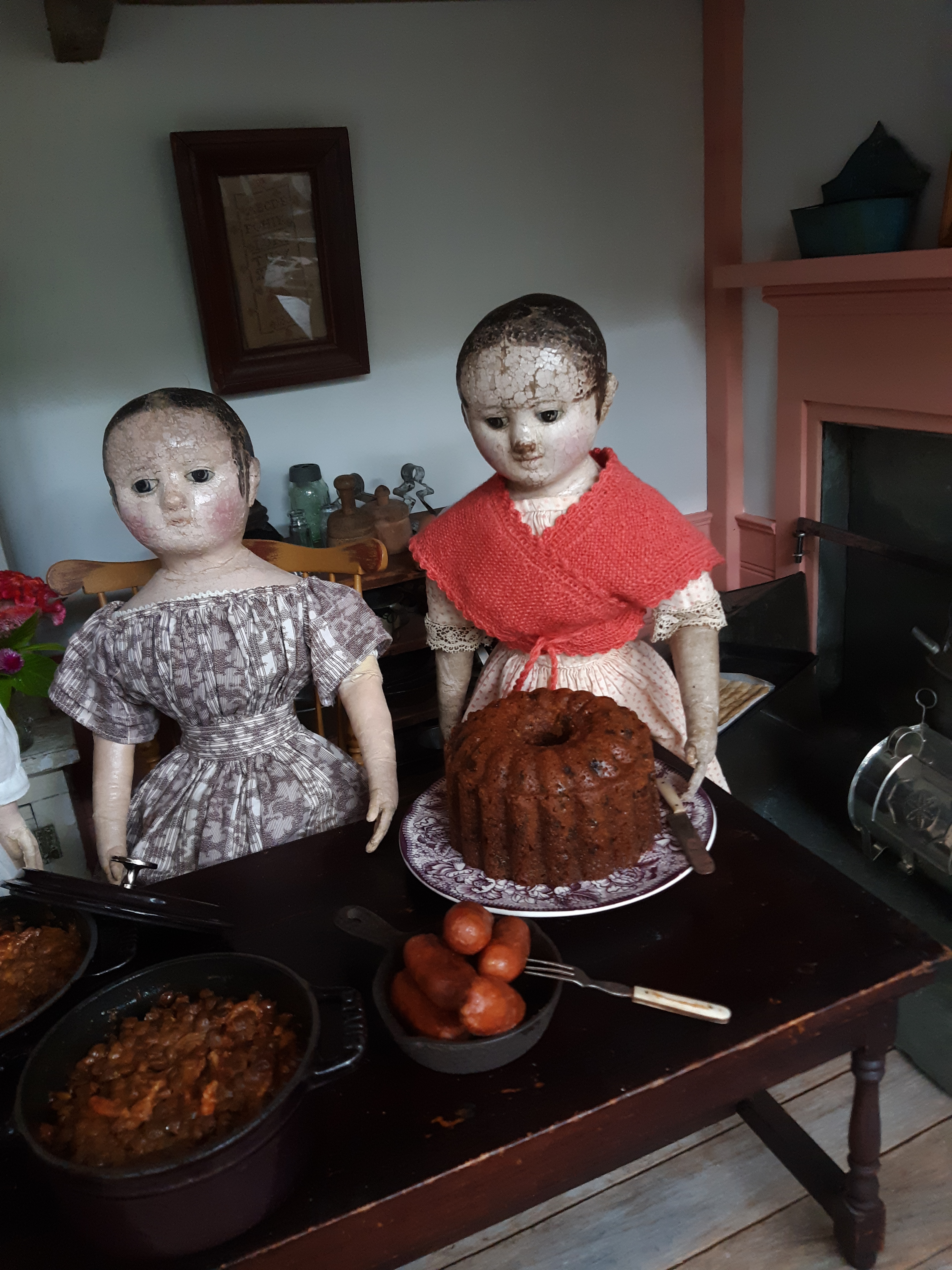 An important part of every good party is food! This year I baked Joe Frogger cookies, which are a great favorite of both the dolls and mine. The recipe that I use comes from my very worn and tattered 1982 copy of Better Homes & Gardens Classic American Recipes. One of the things I’ve always loved about this cookbook is the little bits of history that accompanies each recipe. “Uncle Joe was an old man who made molasses cookies in Marblehead, Massachusetts. They were called Joe Froggers because they were as big and dark as the frogs in Joe’s pond. Fishermen found that they kept well at sea and traded them for rum, one of Joe’s secret ingredients.