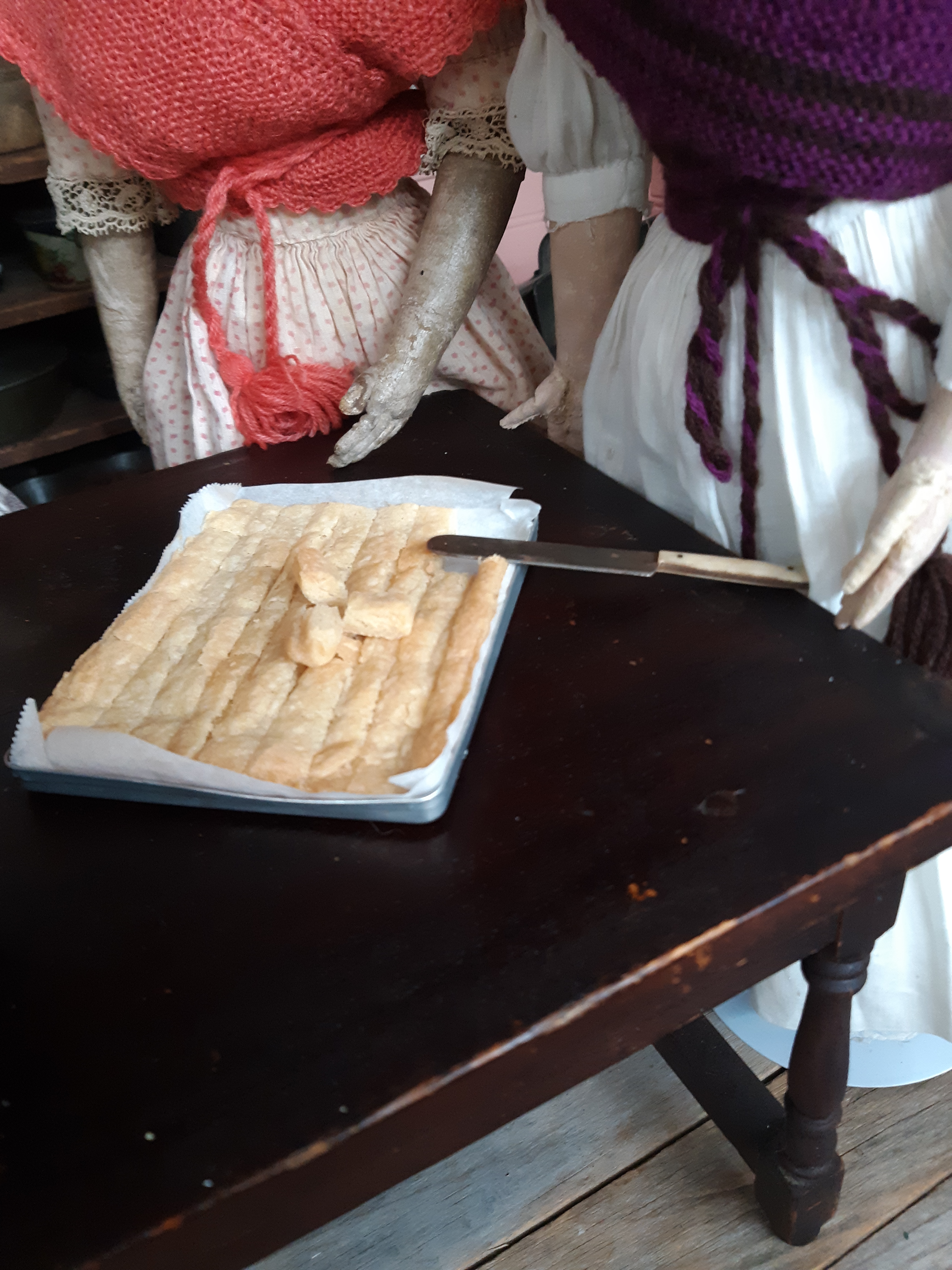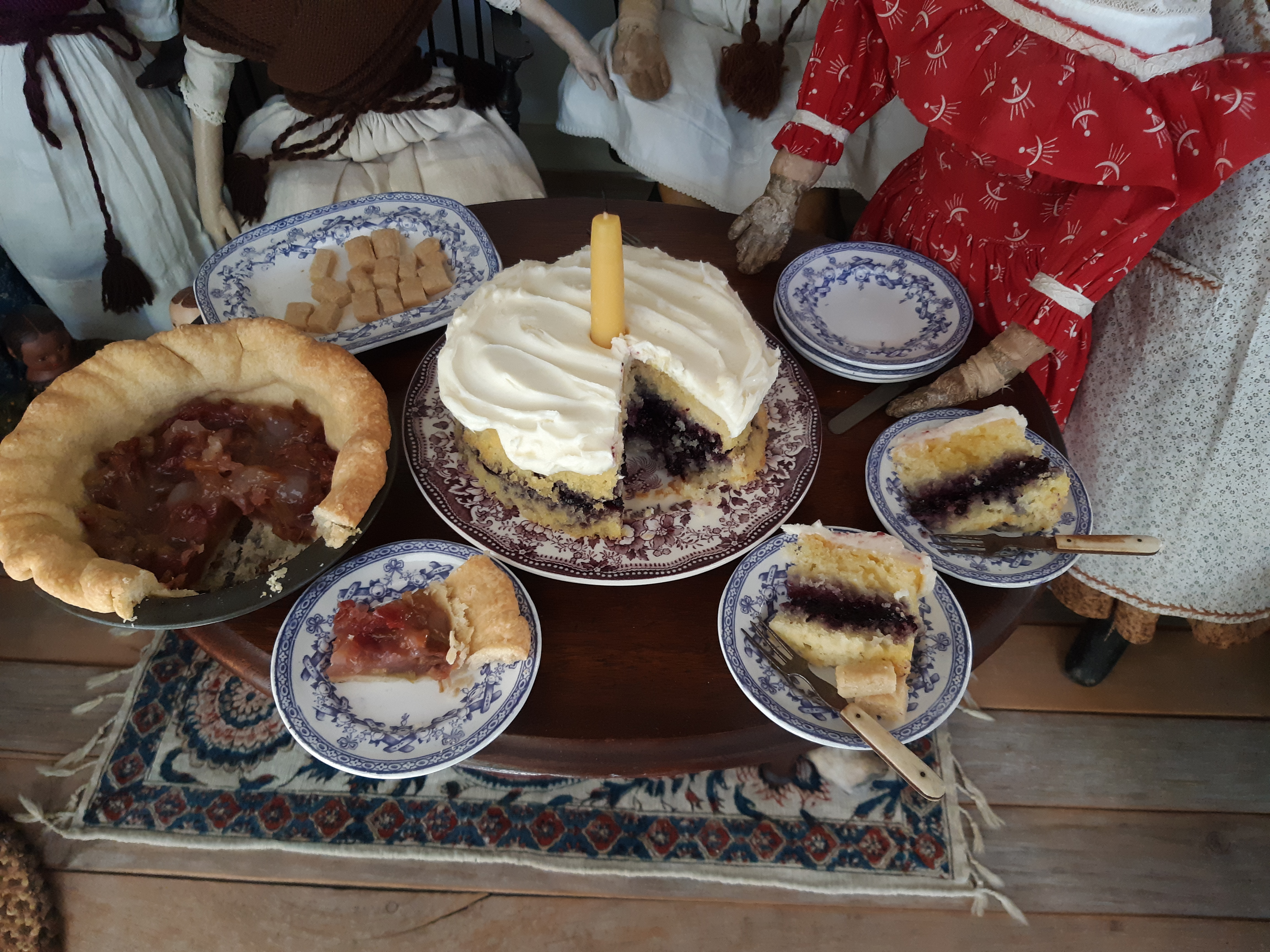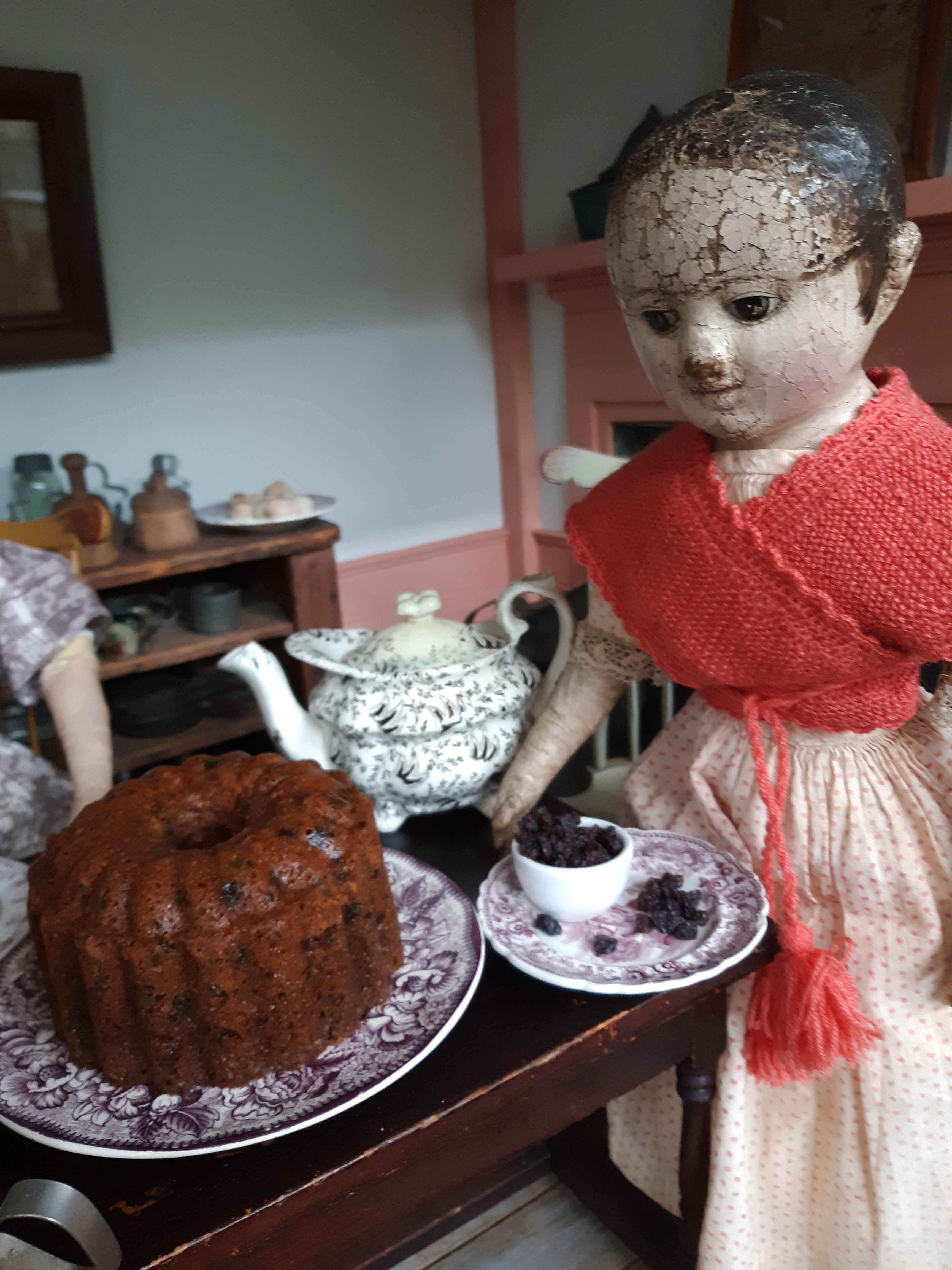 An important part of every good party is food! This year I baked Joe Frogger cookies, which are a great favorite of both the dolls and mine. The recipe that I use comes from my very worn and tattered 1982 copy of Better Homes & Gardens Classic American Recipes. One of the things I’ve always loved about this cookbook is the little bits of history that accompanies each recipe. “Uncle Joe was an old man who made molasses cookies in Marblehead, Massachusetts. They were called Joe Froggers because they were as big and dark as the frogs in Joe’s pond. Fishermen found that they kept well at sea and traded them for rum, one of Joe’s secret ingredients.