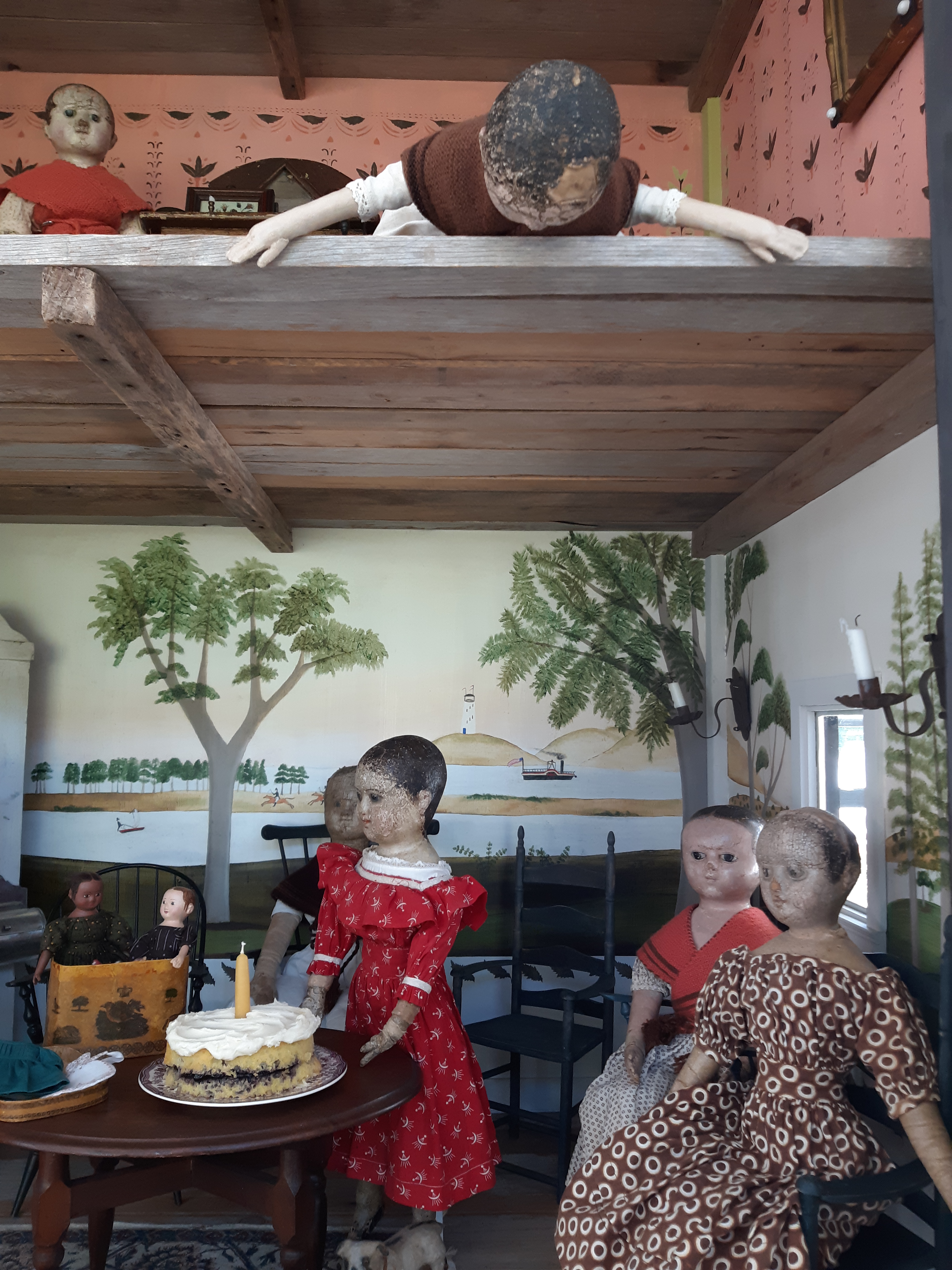 I love my painting studio! It’s filled with windows and generally has wonderful light all day long. When the week prior to the party started to have weather forecasts that were filled with dark clouds and rainy days I knew that I might run into difficulties trying to photograph the doll’s celebration and all of the little details in their house. My solution was to pull the umbrella photo light stands, that I bought over 20 years ago from local artist and dollmaker Rainie Crawford, out of the top floor of my tack barn. At the time that I bought the lights my youngest son was getting ready to apply to several art schools. I knew that I was going to have to photograph his portfolio and thought they would also be great when photographing my own work. The lights were far from new when I acquired them, as Rainie had used them for years to photograph her own dolls and bears for the ads she ran offering her patterns for sale in the back pages of popular women’s magazines.