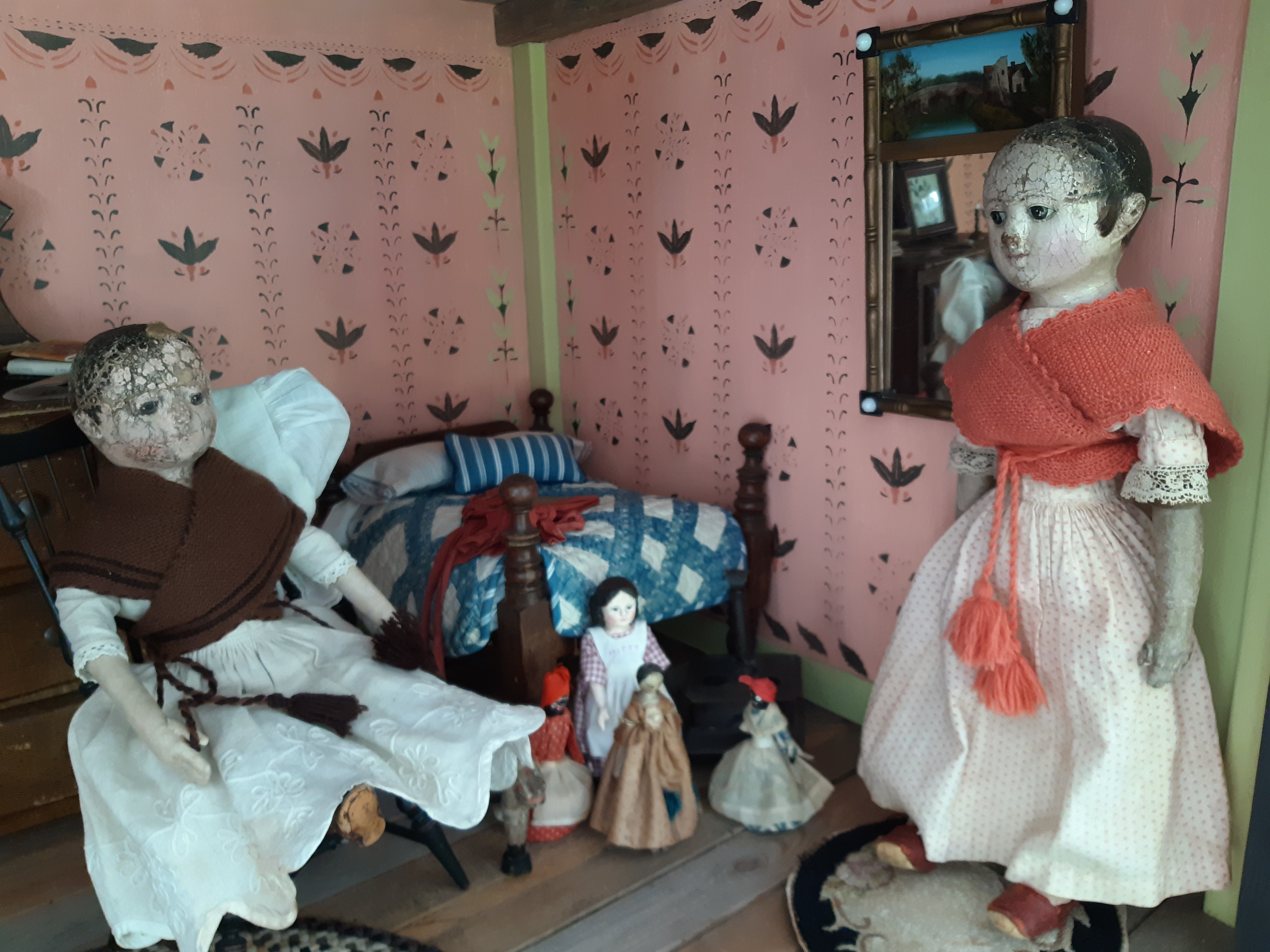 The tiny printed and stuffed kitten & hen that the sisters made for Izzybelle ~ These miniature marvels were actually made by the extremely talented Lolly Yokum of Laurel Leaf dolls. She also makes a variety of miniature cloth dolls that include amazing tiny Izannah Walker dolls https://laurelleaf.com/toys.htm