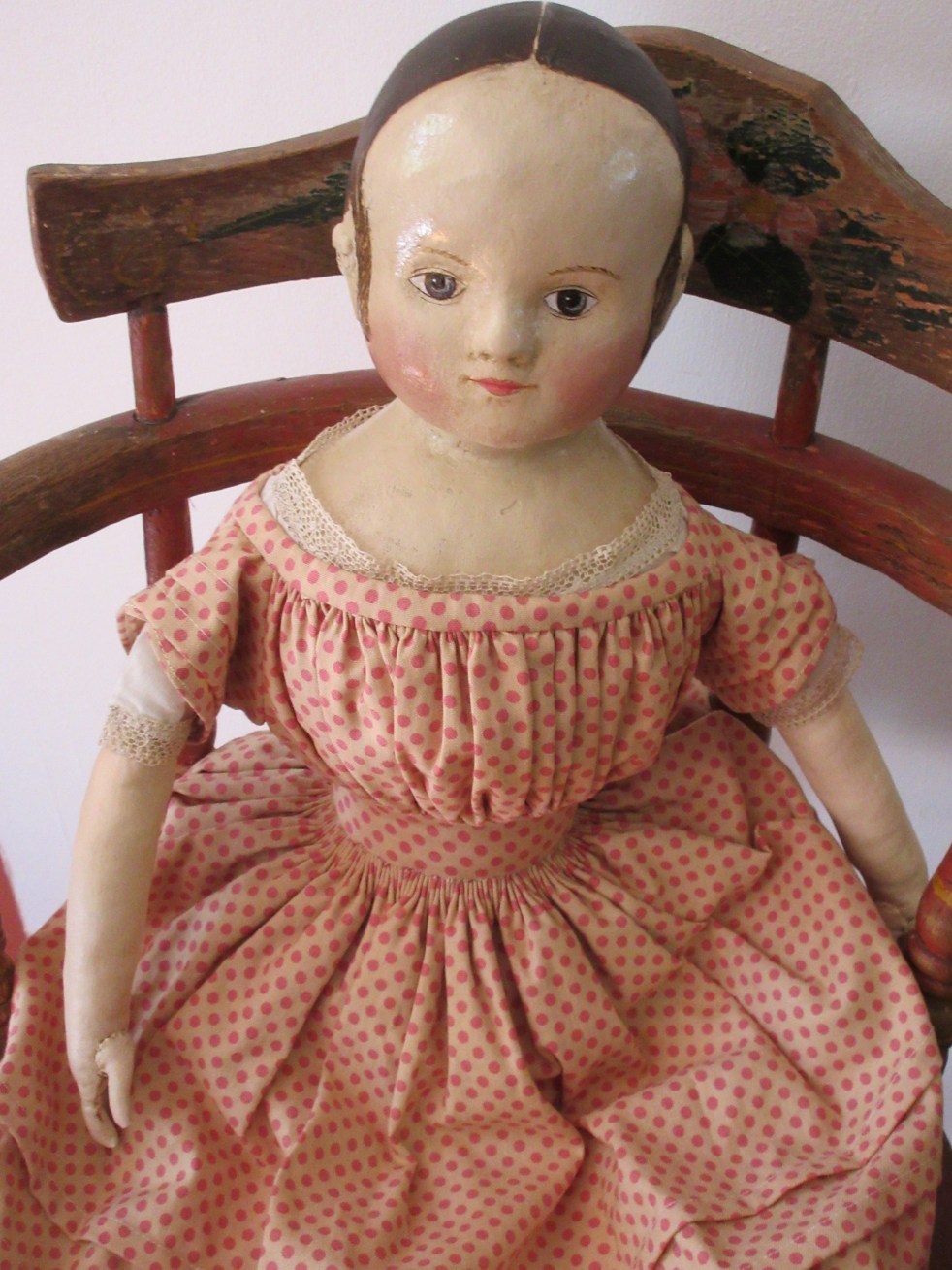 Delores asked me to make a reproduction Izannah Walker doll for her, based on Ella, a c. 1857 doll that she purchased in 2008 and later sold to another collector. The original Ella is a wonderful doll! Delores and I had such fun discussing all the little details of the doll I created for her. Together we sat down and looked through a box of antique fabrics that Delores had collected, weighing the pros and cons of each piece and finally deciding which should be used for the new doll’s dress. Delores was such a delight to work for and I think she enjoyed our discussions about her doll as much as I did.
