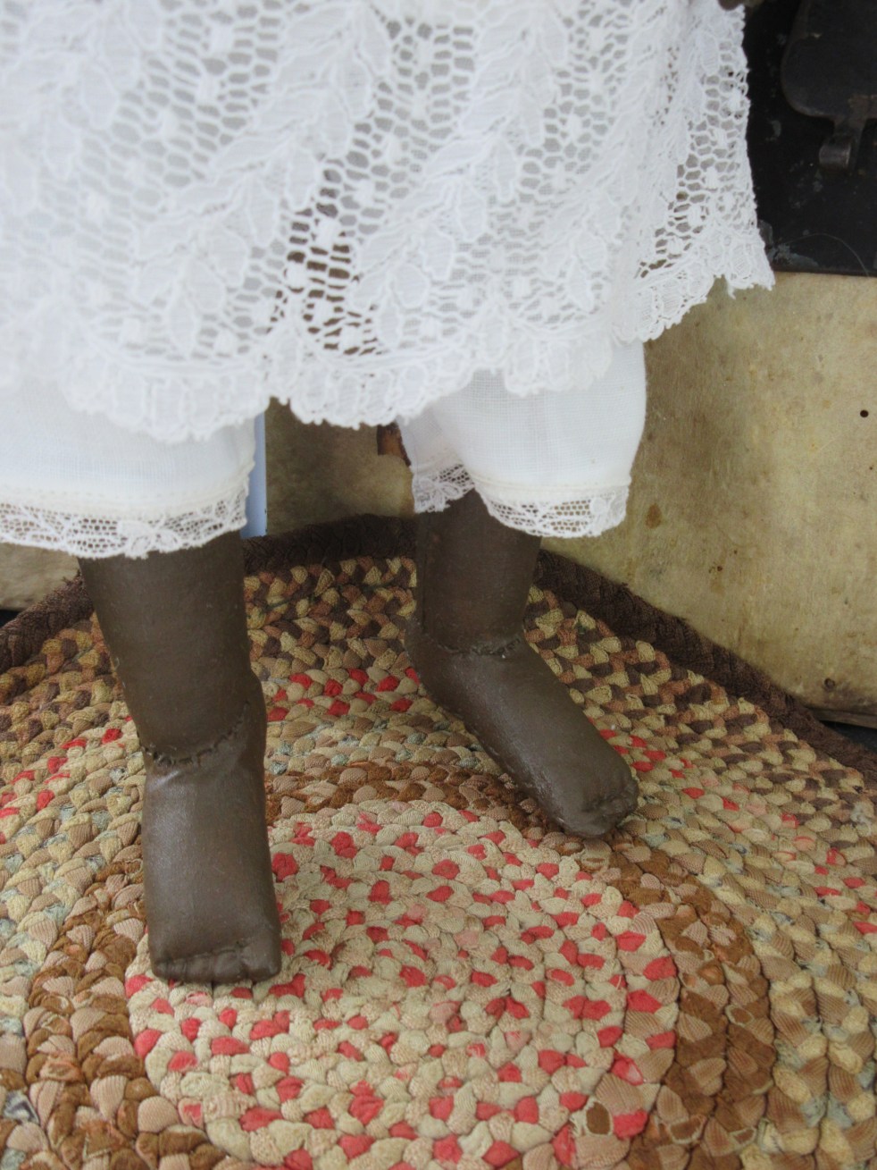 I don’t get asked to make too many black reproduction Izannah Walker dolls, so it is always a pure pleasure when someone requests one. ❤ This is Beth’s doll. She is a black version of my Hannah, with a vintage Tibetan lambskin wig, and bare feet. I’m just finishing her shoes, which was fine with this little Hannah. She told me quite firmly that it was too hot to wear shoes today, and if they had been finished that she wouldn’t have put them on!!! She definitely has a mind of her own…