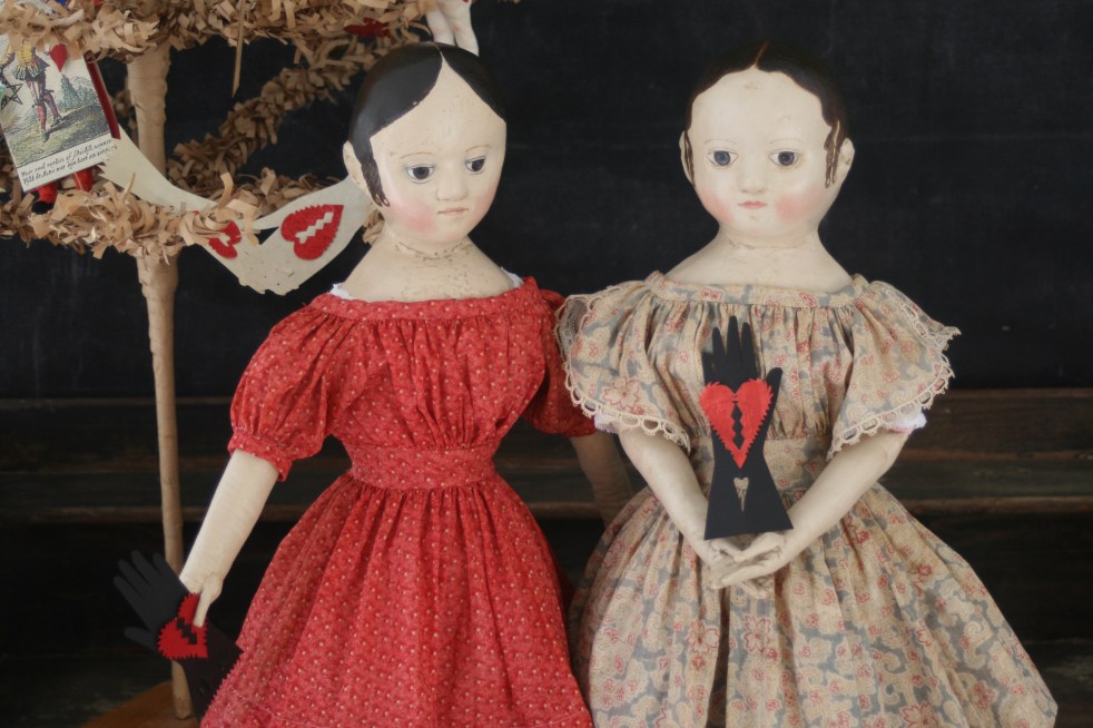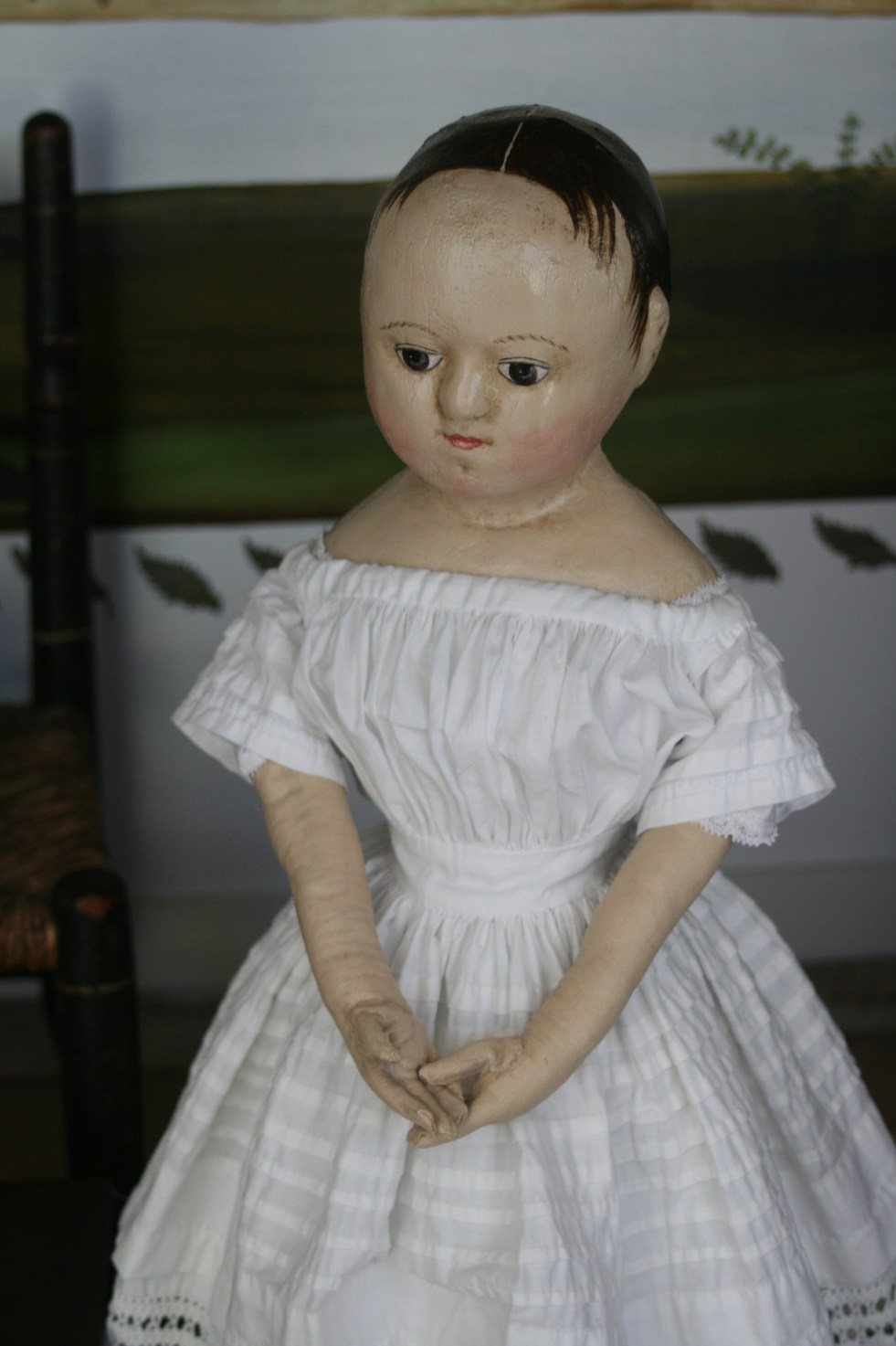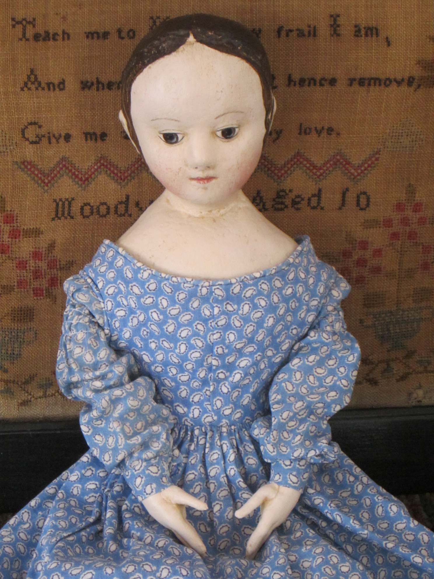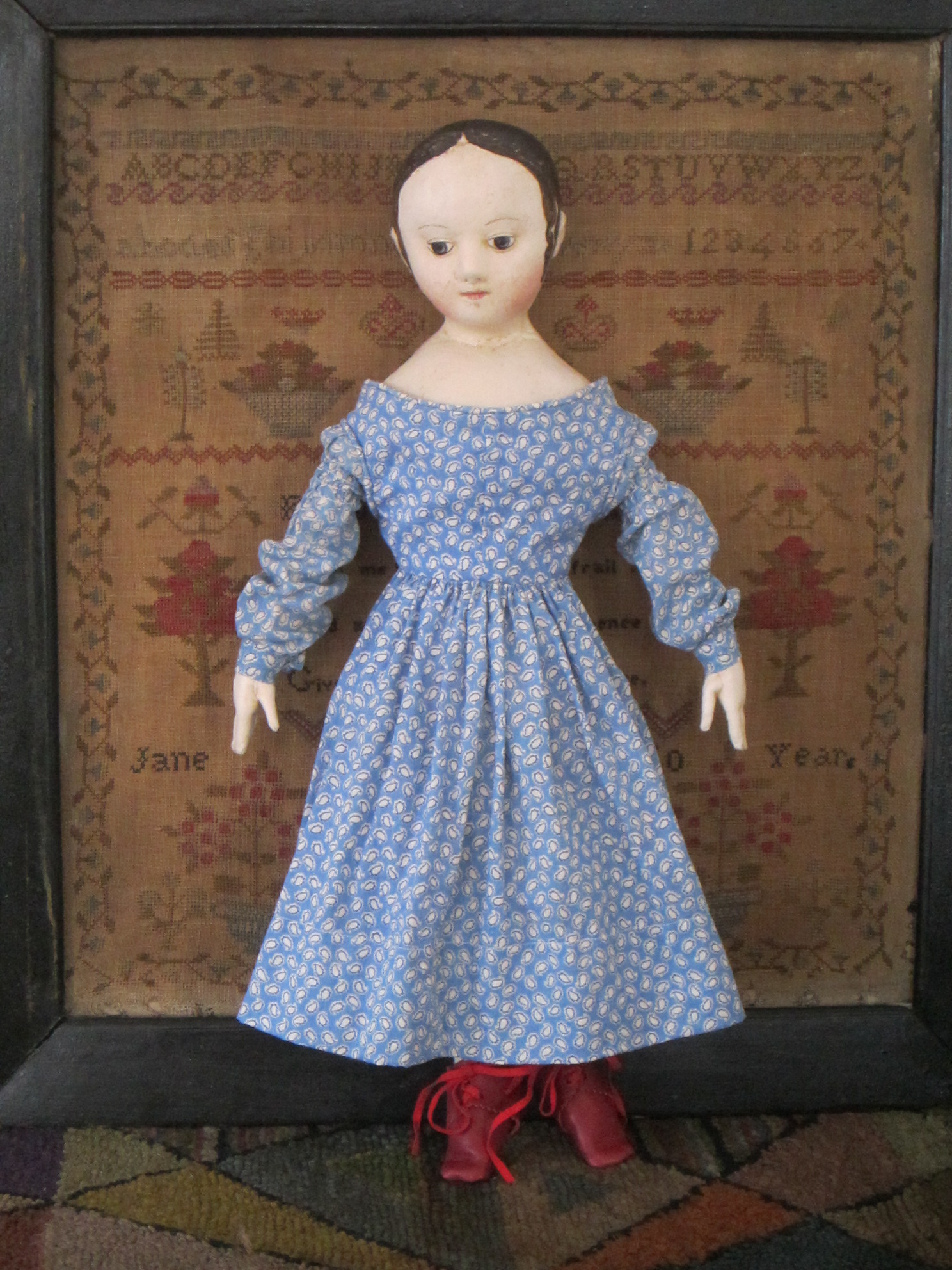 I’d like to introduce you all to Melissa’s doll. She is a wonderful example of one of my custom ordered reproduction Izannah Walker dolls. Melissa requested a doll with a very thin neck and downward tilted head, that had an appearance reminiscent of one of her favorite antique Izannah Walker dolls (a doll that was previously part of the Popp collection and later owned by R. John Wright). She asked me to give her doll a pale complexion, but one without the grey tint that many antique Izannahs have. Melissa also wanted a paint surface that showed some moderate wear and age, but preferred her doll to have a “perfect” nose. She chose the antique blue paisley print dress fabric from my fabric swatch book and found a photograph of a dress she loved in a museum collection for me to use as a reference.