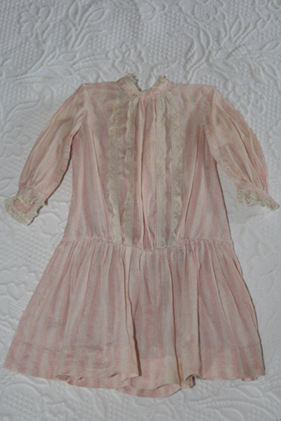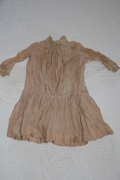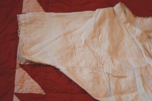 The dressmaking details of her clothing include French seams to join the panels of her sheer white skirts, two rows of tucks at her dress and sleeve hems, three rows of tucks on the bottom of her pantalettes, and hand stitched lace flounces around the edges of her knee length chemise, pantalettes, and apron. All of the fabrics and laces that I used in making her clothing are antique, and she comes with an antique doll’s petticoat that I have cleaned and restored. I wish that I would have been able to add a few more rows of tucks to her dress, but I just did not have enough fabric.