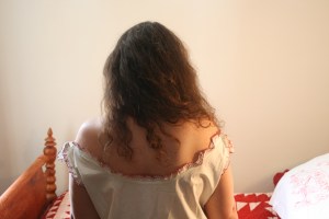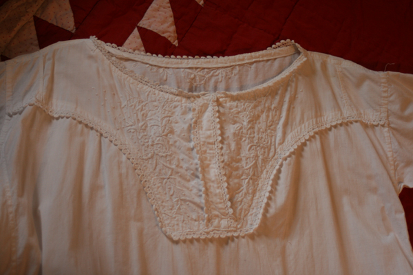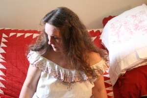 Even though it is overcast and rainy again today, I think this young lady needs a ruffled white sunbonnet to keep her shoulders from burning and ward away freckles. I do still have a few bits of fabric and lace left…