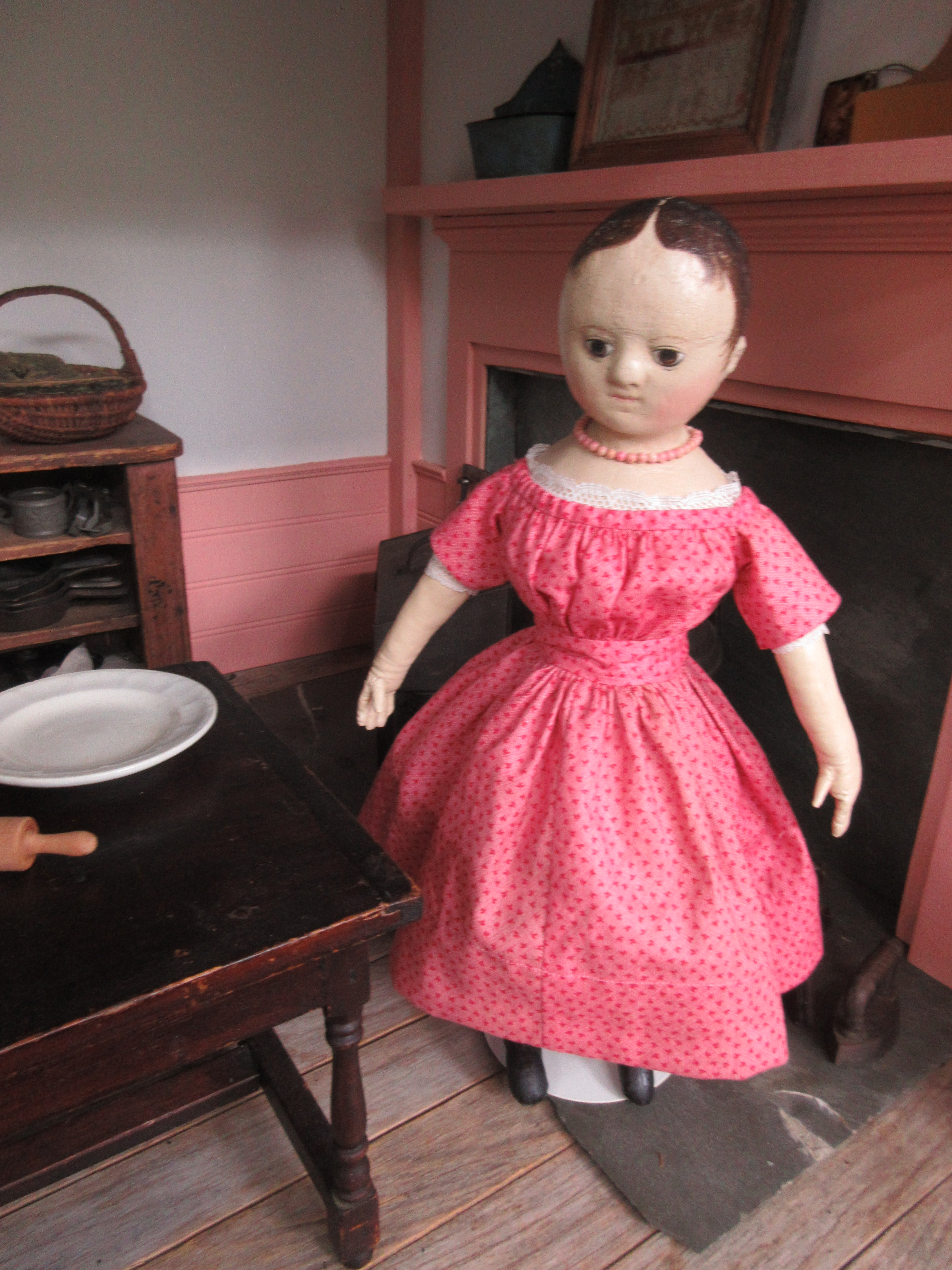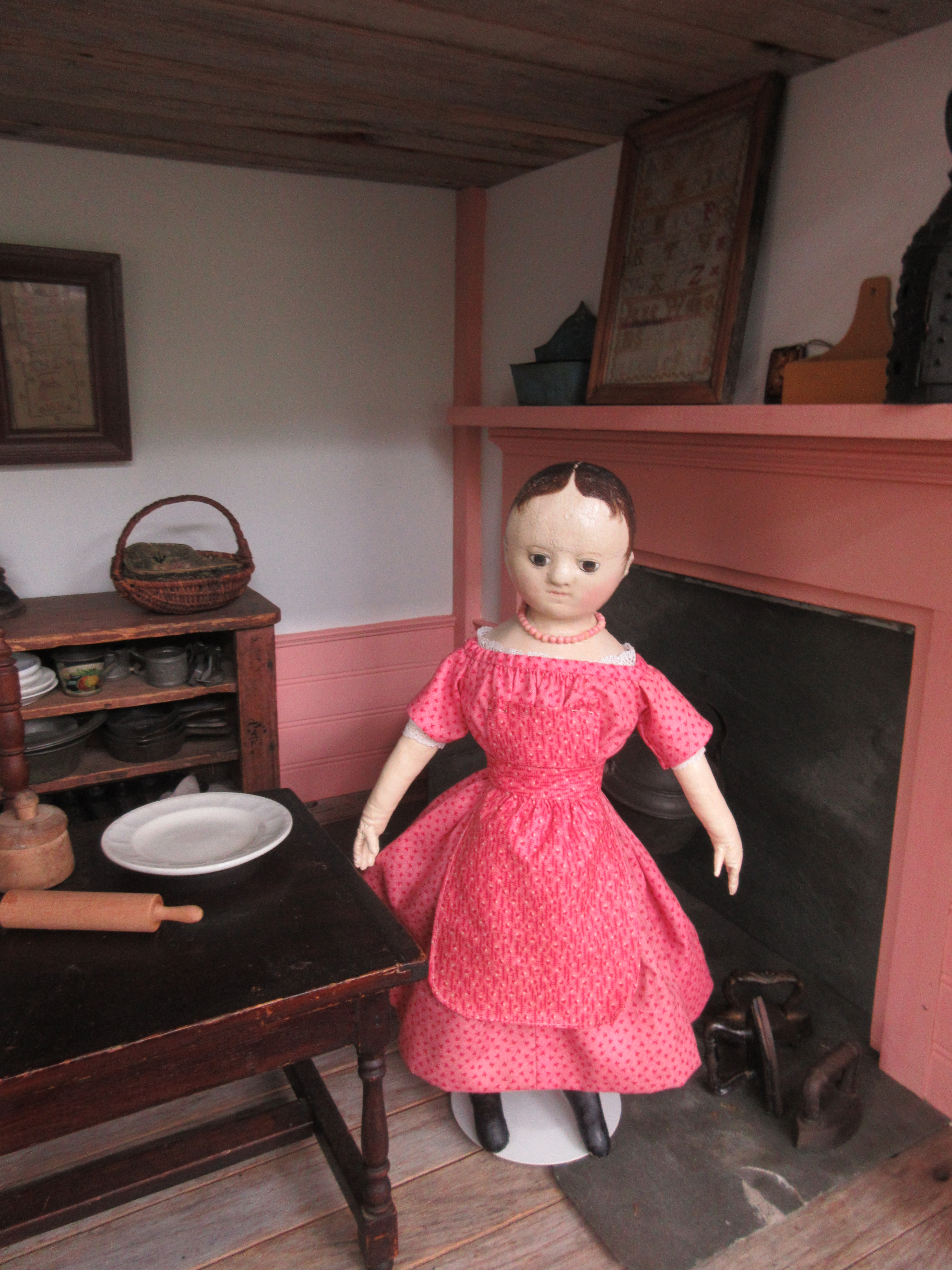 I’ve just put the final stitches in my newest reproduction Izannah Walker doll! She is an adorable 16 inch doll, with short wisps of hair painted around her face and, long ringlet curls at the nape of her neck.