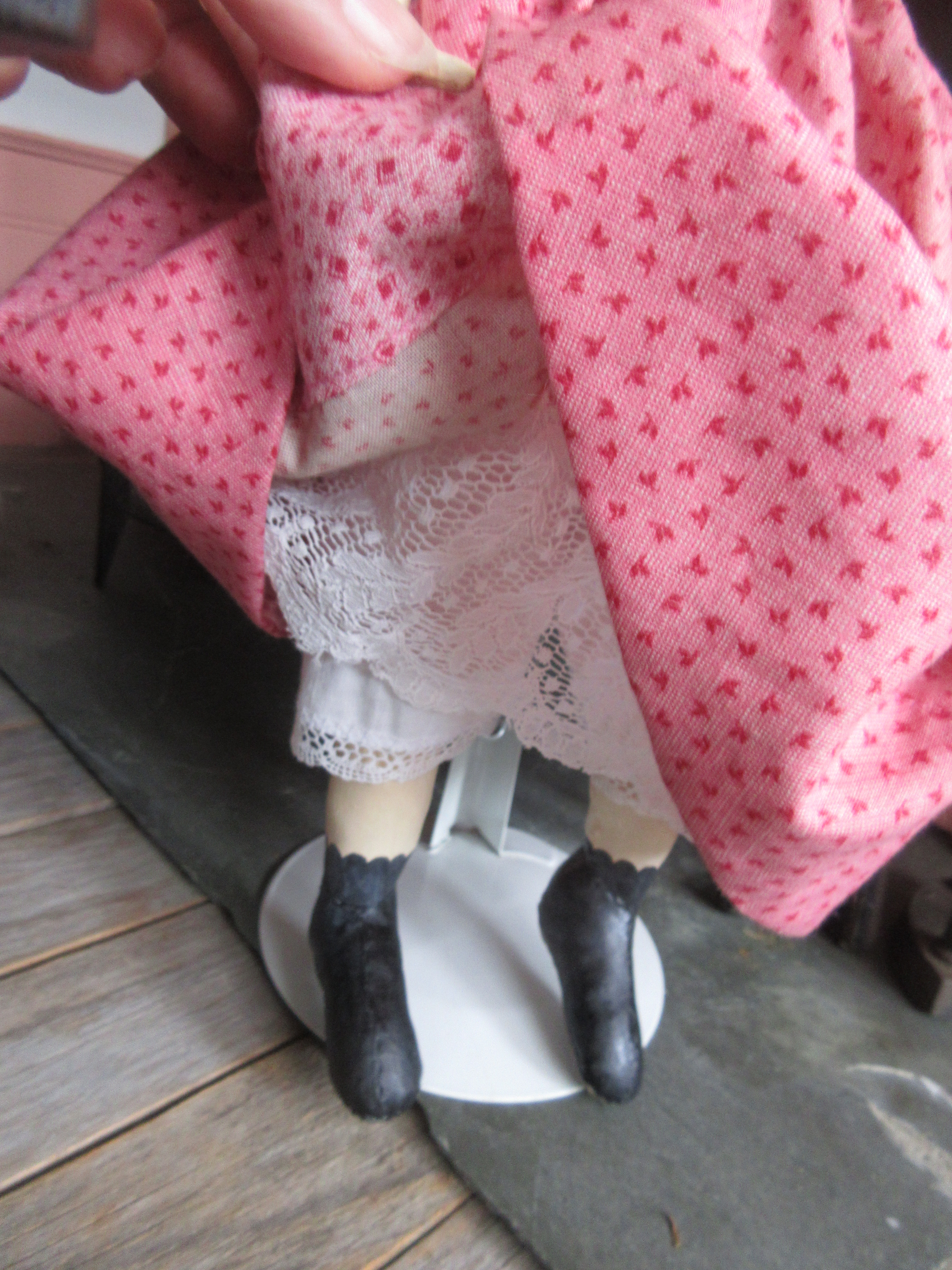 Now SOLD thank you! This morning I would like to introduce you to my latest reproduction of Lizzybit. She is a reproduction Izannah Walker doll, just 16 inches tall from the top of her head to the bottom of her heels! Lizzybit has a wispy hairline, with five ringlets at the nape of her neck. Her second skin is pale pink linen. She has scallop topped painted boots. Her wardrobe includes a chemise, pantalettes, a petticoat, a dress with an extra full skirt and a false hem, which is one of my favorite dressmaking features, plus a pinner apron and a pink bone bead necklace. All of her clothing is made from antique fabrics, laces, milk glass buttons and other antique notions