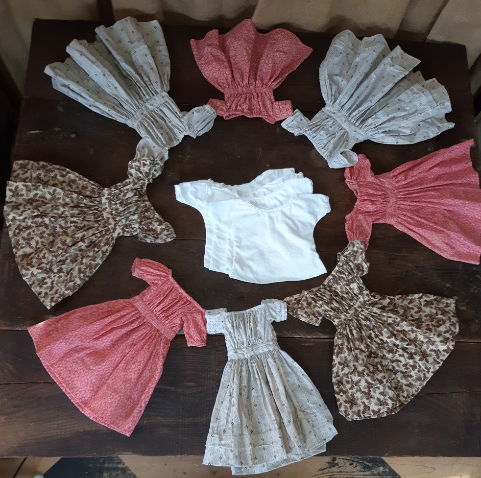 I would like to introduce you to my latest reproduction of Hannah. She is a reproduction Izannah Walker doll, a bit shorter than some of her sisters at just a hair over 17 inches tall. Hannah has a wavy hairline, with two ringlets in front of each ear, and five more at the nape of her neck. Her second skin is pale pink linen. She has bare feet with tiny stitched toes, dusty pink stockings, and red leather shoes. Her wardrobe includes a chemise, pantalettes, a petticoat, a dress with an extra full skirt, a false hem, contrasting waistband lining, and velvet ribbon trim. Her second dress is also made with extra fabric for a delightful fullness in both bodice and skirt, has a growth tuck, and contrasting fabric on the neckband, waistband and sleevebands. Her wardrobe also includes a pinner apron and a pink bone bead necklace. All of her clothing is made from antique fabrics, laces, milk glass buttons and other antique notions using some of my favorite dressmaking techniques. ❤