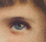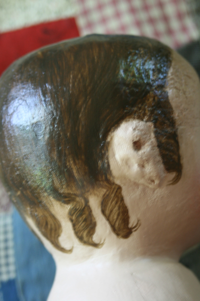 The paint on this doll’s face has the aged, worn look that you will sometimes see on the paint of certain papier-mache, wooden and cloth dolls. The base skin paint is intact and smooth, but the the paint on the lips, cheeks and hair has rubbed away from a lifetime of play, and dust and dirt have collected in the depressions and corners of her features. No doubt left over from her adventurous days of making mud pies. I was trying for a very refined look of age on this doll. I know for certain that the original Isa had very little paint remaining on her face before one of her recent owners covered her with brand new paint (prior to when Edyth – then I bought her) . I wanted to acknowledge her worn and rubbed off paint. I also decided to use the Izannah owned by the Worthington Historical Society* as my inspiration for what her paint could have looked like when it was intact. When I combined those two themes, this is what I got!